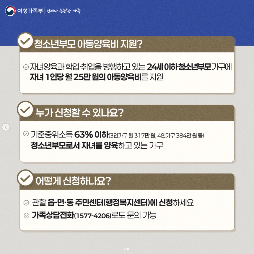 · 기준중위소득 63%* 이하이면서 청소년부모로서 자녀를 양육하고 있는 가구라면 신청 가능합니다.