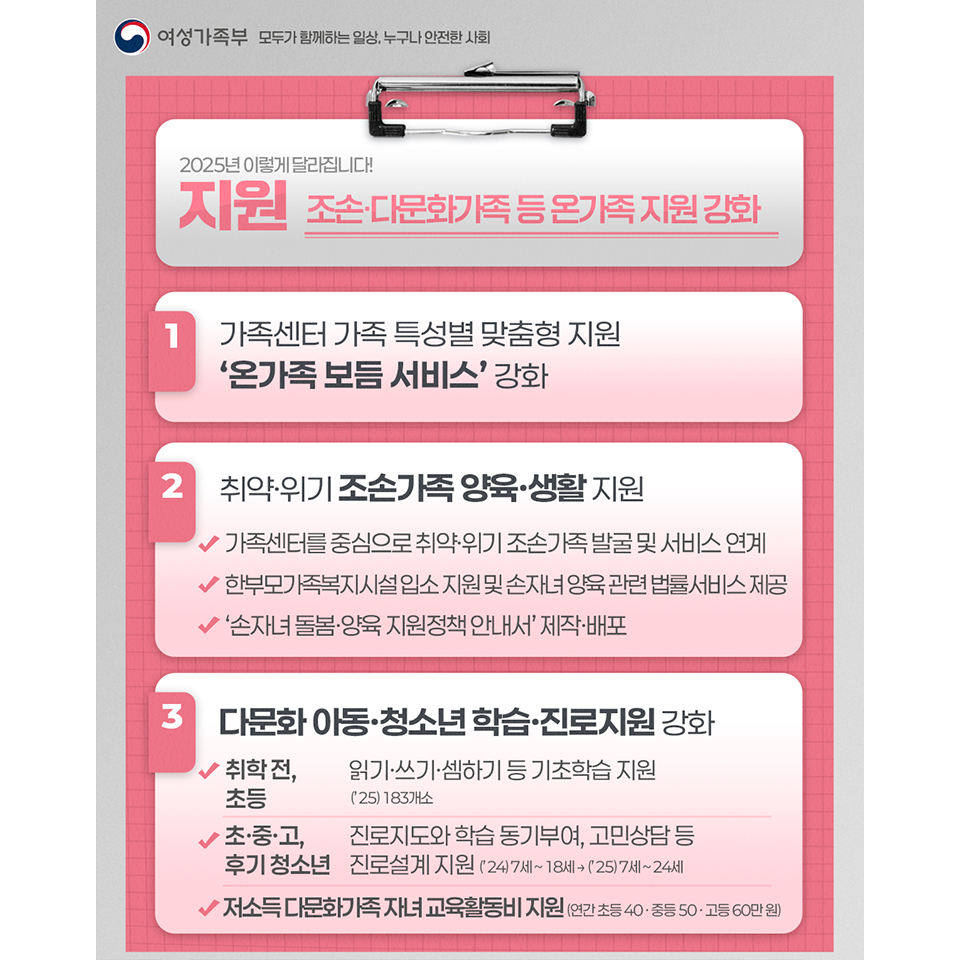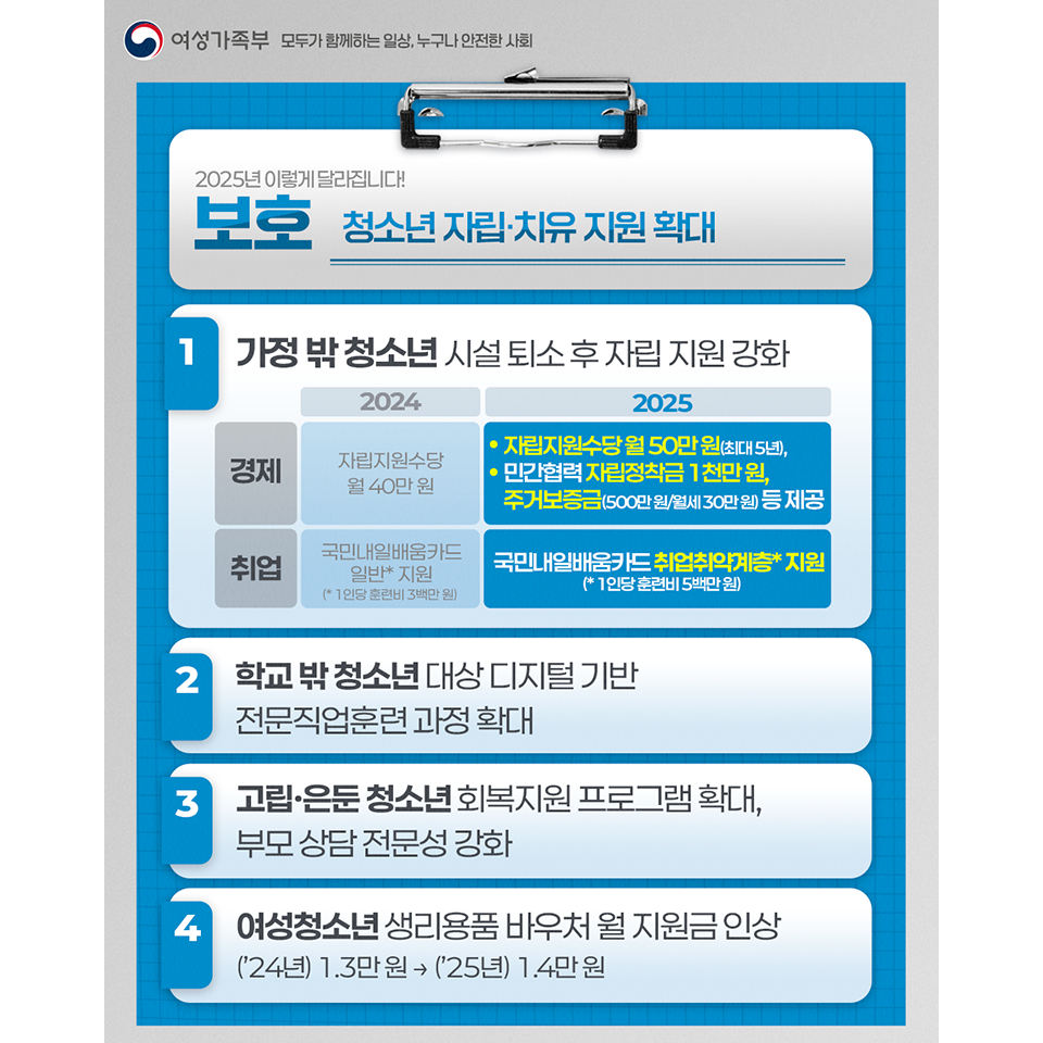 home 맘편한 내★일, 광주아이키움2.0 결혼·임신·출생 영유아 초·중·고 다양한 가족 일생활균형 커뮤니티 아동돌봄지원 소통방 나눔방 광주 아이키움 상담방 돌봄정보방 성폭력 피해 상담 및 사건지원 공지사항 이벤트소식 참여게시판 카드뉴스 동영상 아이키움 칼럼 성평등 육아웹툰 로고&캐릭터 [여성가족부]촘촘한 가족,청소년 안전망 등록일 : 2025-02-07 08:13 작성자 : 운영자 조회수 : 140 첨부파일 1.png 다운로드 여성가족부 2025년 이렇게 달라집니다!촘촘한 가족, 청소년 안전망 입니다. 목록