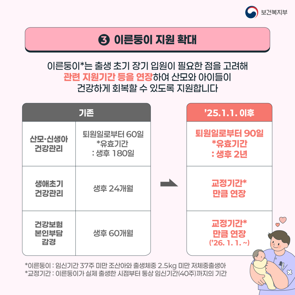 이른둥이는 출생 초기 장기 입원이 필요한 점을 고려해 관련 지원기간 등을 연장하여 산모와 아이들이 건강하게 회복할 수 있도록 지원합니다.
