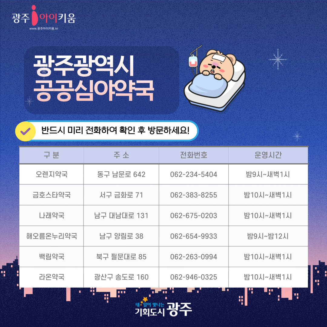 home 맘편한 내★일, 광주아이키움2.0 결혼·임신·출생 영유아 초·중·고 다양한 가족 일생활균형 커뮤니티 아동돌봄지원 소통방 나눔방 광주 아이키움 상담방 돌봄정보방 성폭력 피해 상담 및 사건지원 공지사항 이벤트소식 참여게시판 카드뉴스 동영상 아이키움 칼럼 성평등 육아웹툰 로고&캐릭터 광주광역시 공공심야약국안내💊 등록일 : 2025-02-20 16:47 작성자 : 운영자 조회수 : 249 첨부파일 001.png 다운로드 목록