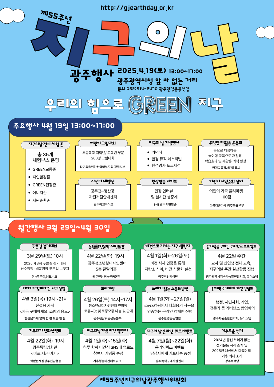 home 맘편한 내★일, 광주아이키움2.0 결혼·임신·출생 영유아 초·중·고 다양한 가족 일생활균형 커뮤니티 아동돌봄지원 소통방 나눔방 광주 아이키움 상담방 돌봄정보방 성폭력 피해 상담 및 사건지원 공지사항 이벤트소식 참여게시판 카드뉴스 동영상 아이키움 칼럼 성평등 육아웹툰 로고&캐릭터 [제55주년 지구의날 광주행사위원회] 제 55주년 '지구의 날' 행사 안내 🌎⭐ 등록일 : 2025-04-07 14:01 작성자 : 운영자 조회수 : 111 첨부파일 004.png 다운로드 일시: 2025. 04. 19.(토) 13:00 ~ 17:00 장소: 광주시청 앞 차없는 거리 (광주지방법원 등기국 ~ 한국은행 앞)[출처 : 제55주년 지구의날 행사 위원회] 목록
