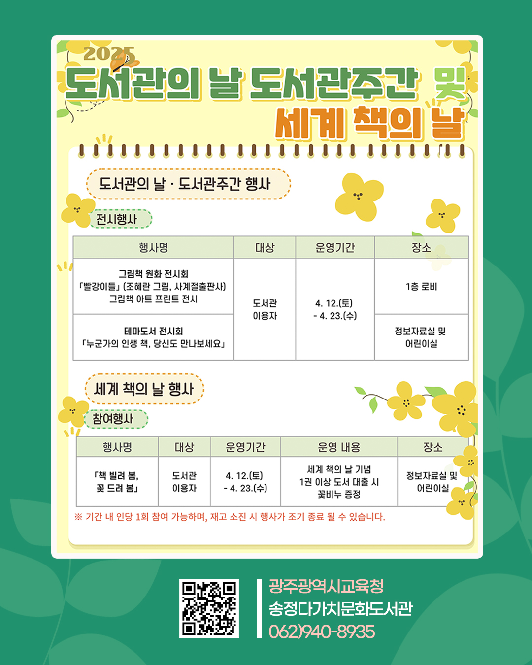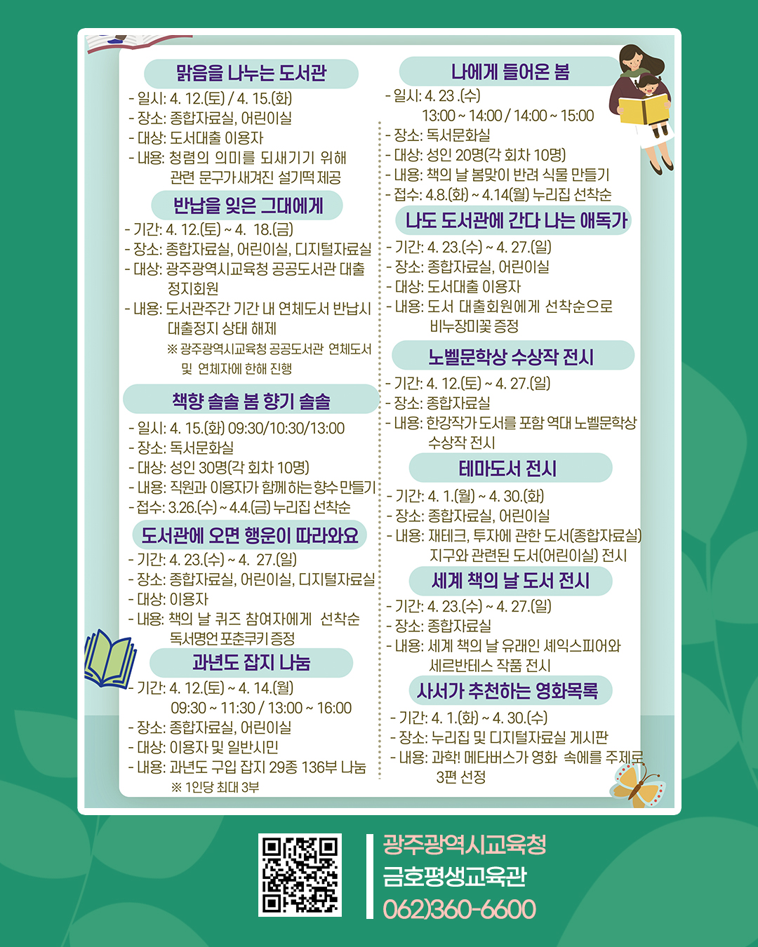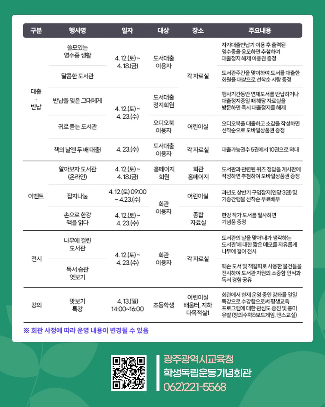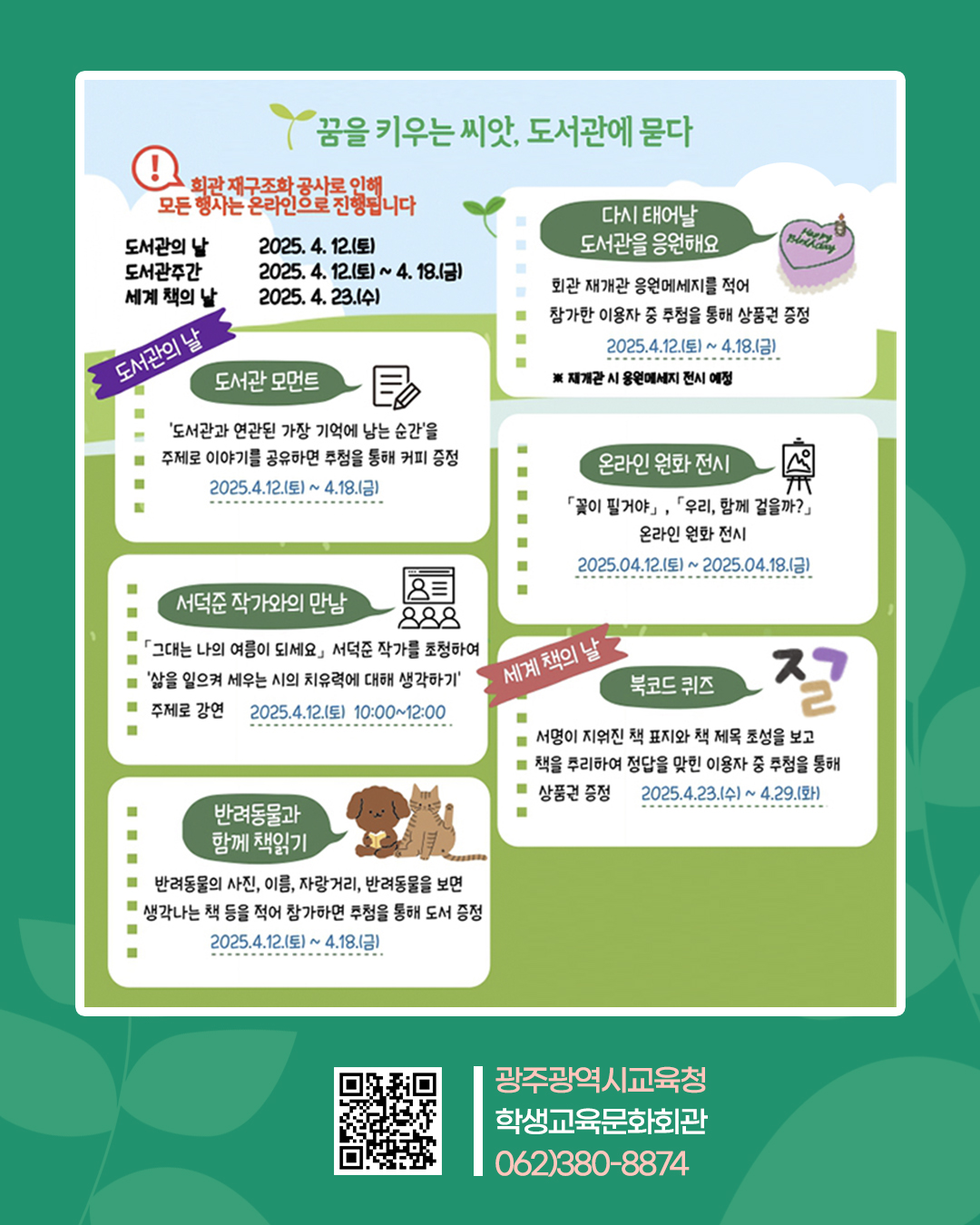 home 맘편한 내★일, 광주아이키움2.0 결혼·임신·출생 영유아 초·중·고 다양한 가족 일생활균형 커뮤니티 아동돌봄지원 소통방 나눔방 광주 아이키움 상담방 돌봄정보방 성폭력 피해 상담 및 사건지원 공지사항 이벤트소식 참여게시판 카드뉴스 동영상 아이키움 칼럼 성평등 육아웹툰 로고&캐릭터 [교육청] 📖도서관주간 세계 책의 날 등록일 : 2025-04-15 14:37 작성자 : 운영자 조회수 : 114 첨부파일 세계 책의 날.jpg 다운로드 책 읽기 좋은 달, 각 도서관에서 열리는 행사와 체험들을 놓치지 마세요 ![출처: 광주광역시교육청] 목록