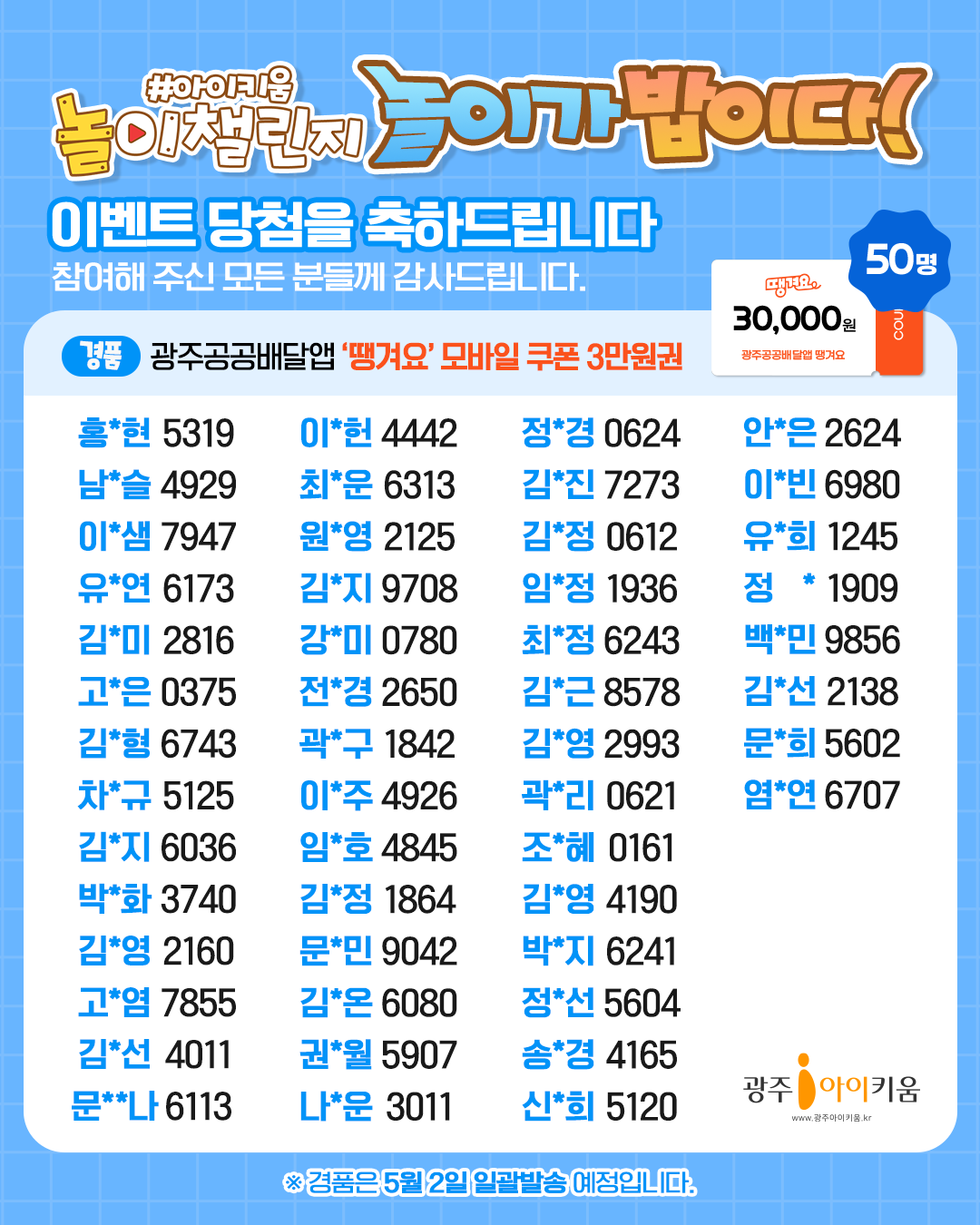 경품은 5월 2일 일괄 발송될 예정이며,