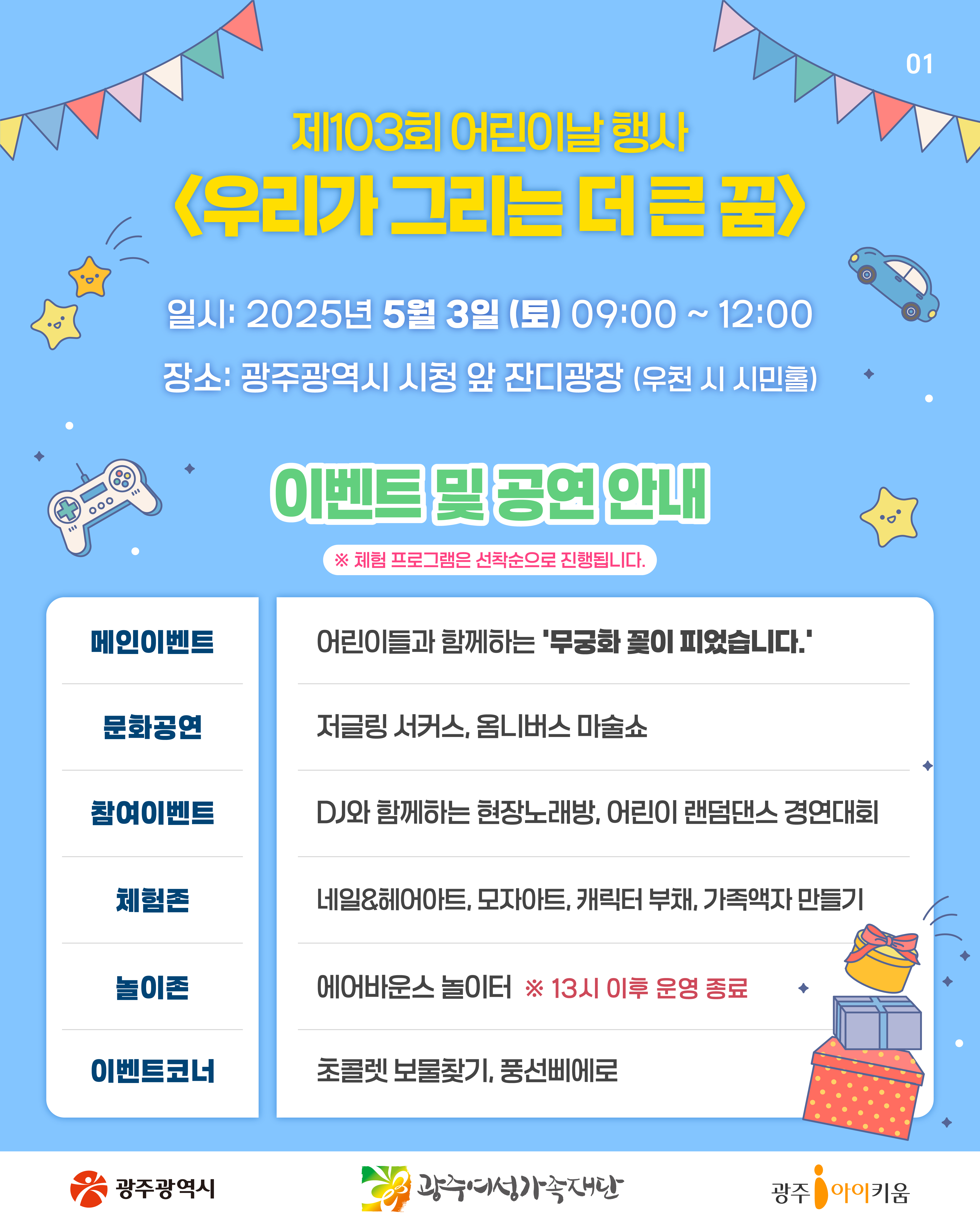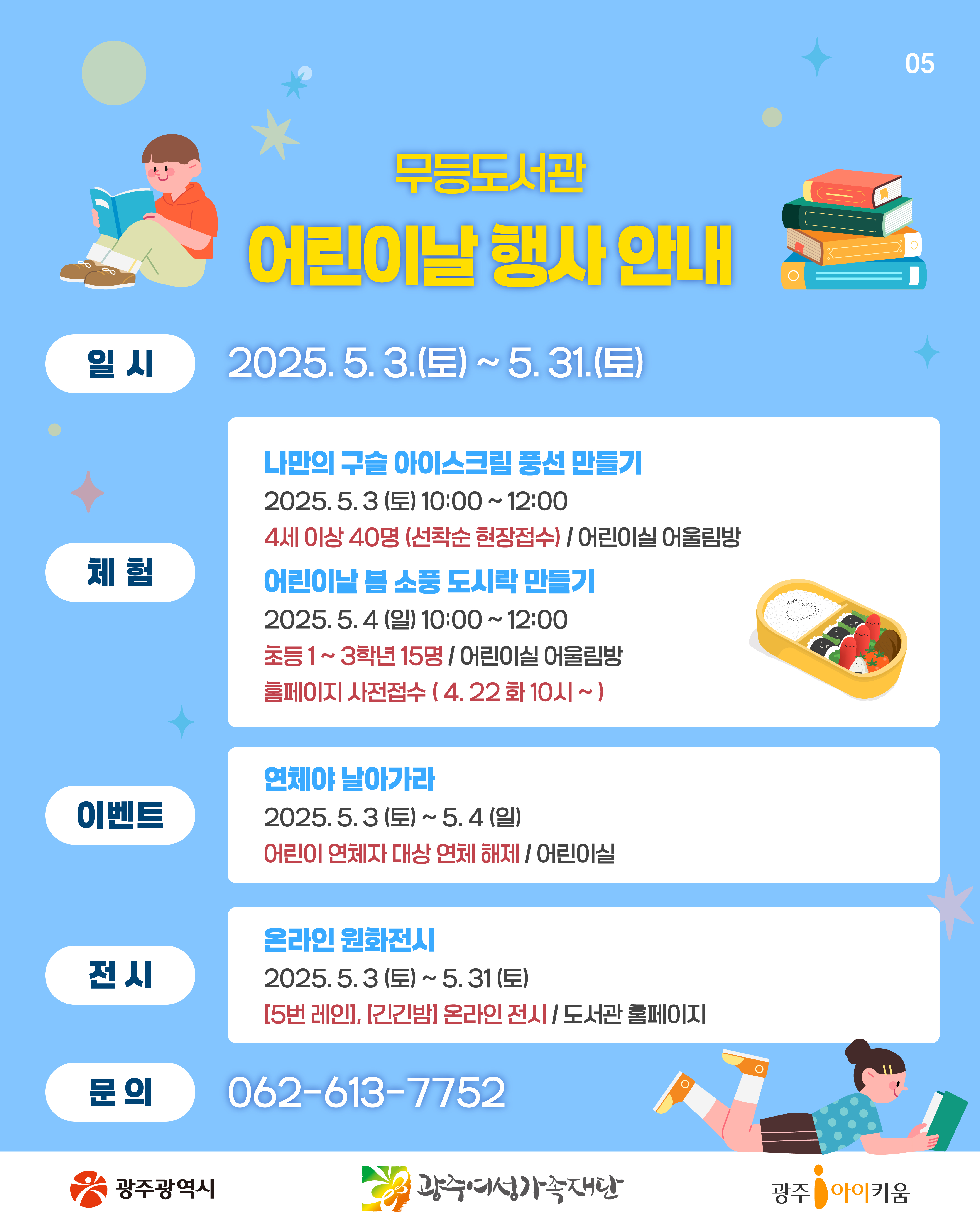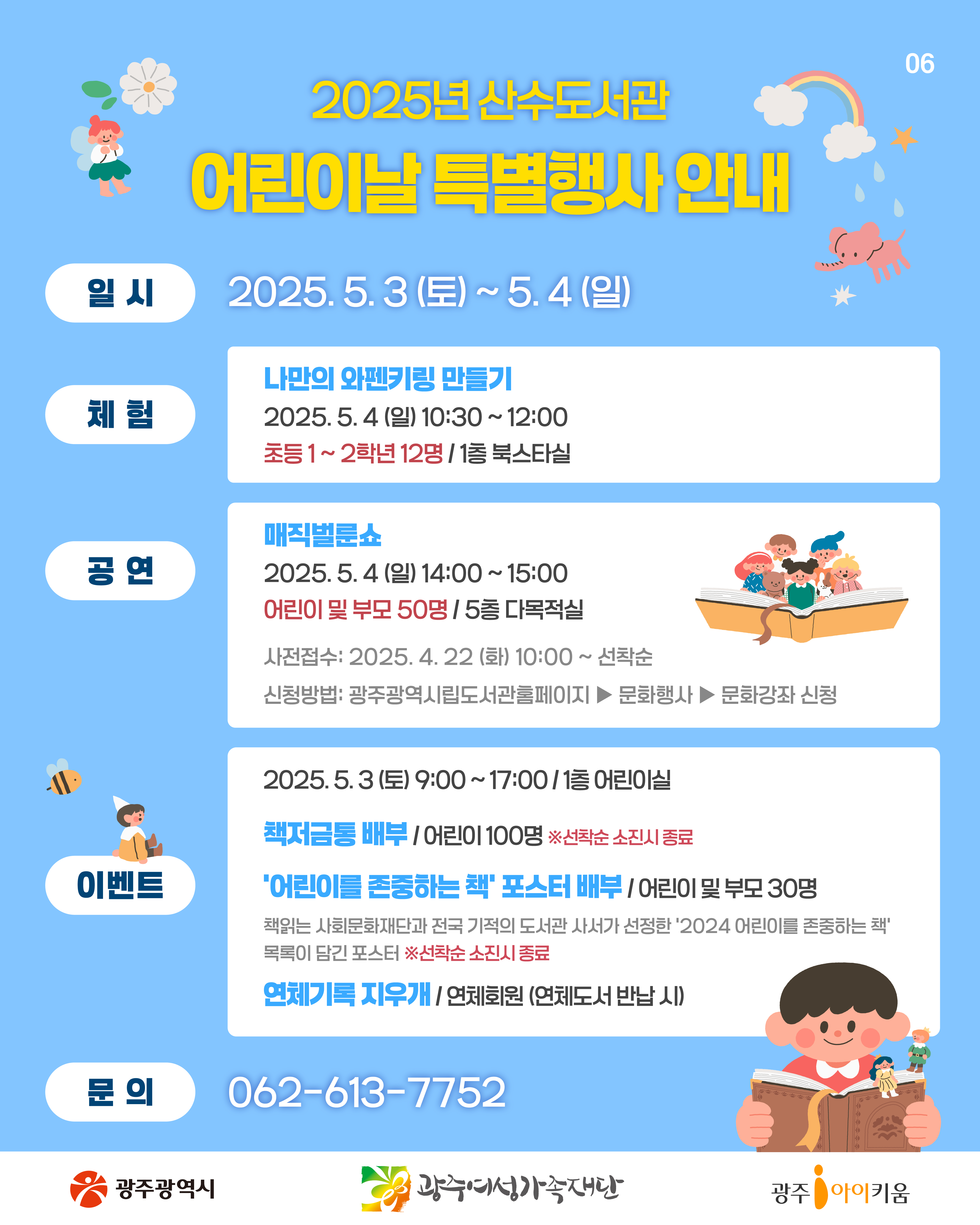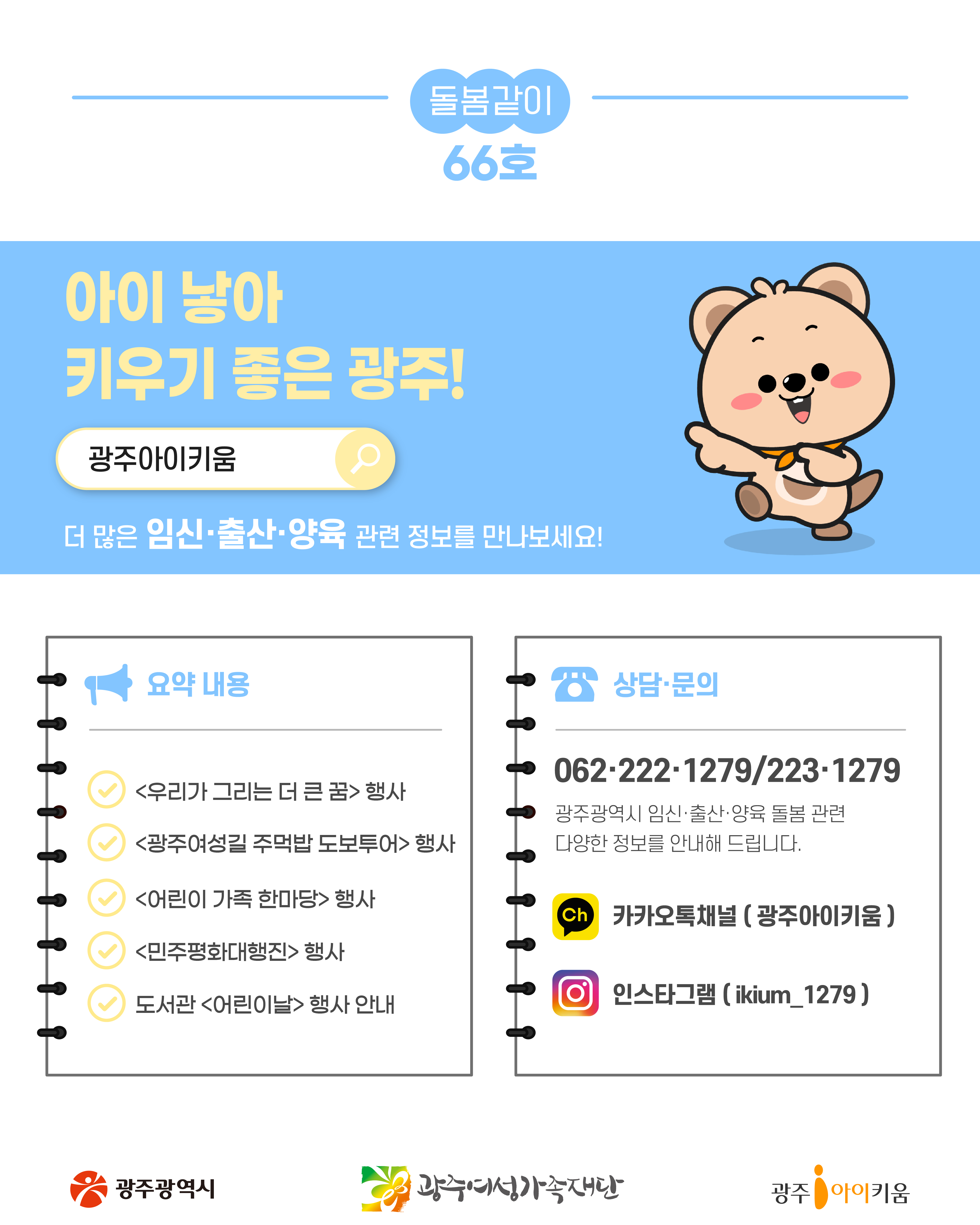 home 맘편한 내★일, 광주아이키움2.0 결혼·임신·출생 영유아 초·중·고 다양한 가족 일생활균형 커뮤니티 아동돌봄지원 소통방 나눔방 광주 아이키움 상담방 돌봄정보방 성폭력 피해 상담 및 사건지원 공지사항 이벤트소식 참여게시판 카드뉴스 동영상 아이키움 칼럼 성평등 육아웹툰 로고&캐릭터 [돌봄같이]66호 신나는 5월 광주, 어디부터 가볼까? 등록일 : 2025-05-02 15:18 작성자 : 운영자 조회수 : 216 첨부파일 돌봄같이 66호 표지.jpg 다운로드 목록