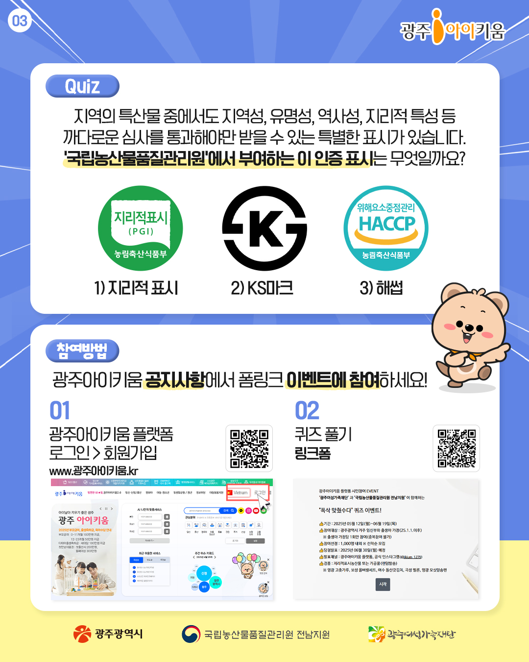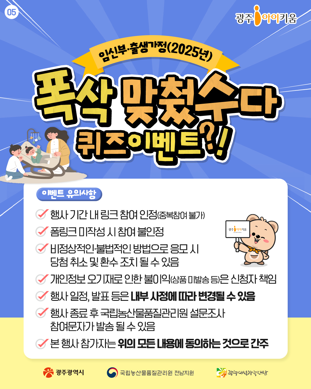 home 맘편한 내★일, 광주아이키움2.0 결혼·임신·출생 영유아 초·중·고 다양한 가족 일생활균형 커뮤니티 아동돌봄지원 소통방 나눔방 광주 아이키움 상담방 돌봄정보방 성폭력 피해 상담 및 사건지원 공지사항 이벤트소식 참여게시판 카드뉴스 동영상 아이키움 칼럼 성평등 육아웹툰 로고&캐릭터 임신부, 25년 출생가정 농산물 지원 퀴즈이벤트 등록일 : 2025-05-12 12:28 작성자 : 운영자 조회수 : 402 첨부파일 화면 캡처 2025-05-12 124346.png 다운로드 목록