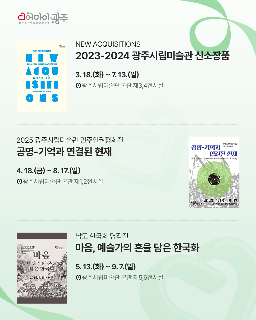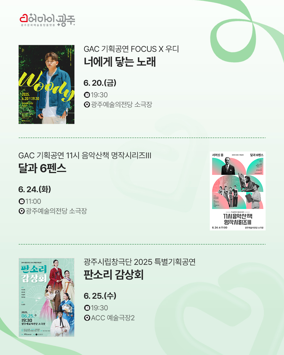 home 맘편한 내★일, 광주아이키움2.0 결혼·임신·출생 영유아 초·중·고 다양한 가족 일생활균형 커뮤니티 아동돌봄지원 소통방 나눔방 광주 아이키움 상담방 돌봄정보방 성폭력 피해 상담 및 사건지원 공지사항 이벤트소식 참여게시판 카드뉴스 동영상 아이키움 칼럼 성평등 육아웹툰 로고&캐릭터 ✨미리 떠나는 문화 휴가, 6월 광주 문화행사 등록일 : 2025-06-19 11:08 작성자 : 운영자 조회수 : 199 첨부파일 6월 문화행사.jpg 다운로드 #광주문화행사모음 #광주광역시 #행사체험 #프로그램다채로운 광주문화행사로 기분 좋은 6월 보내세요 ! 목록