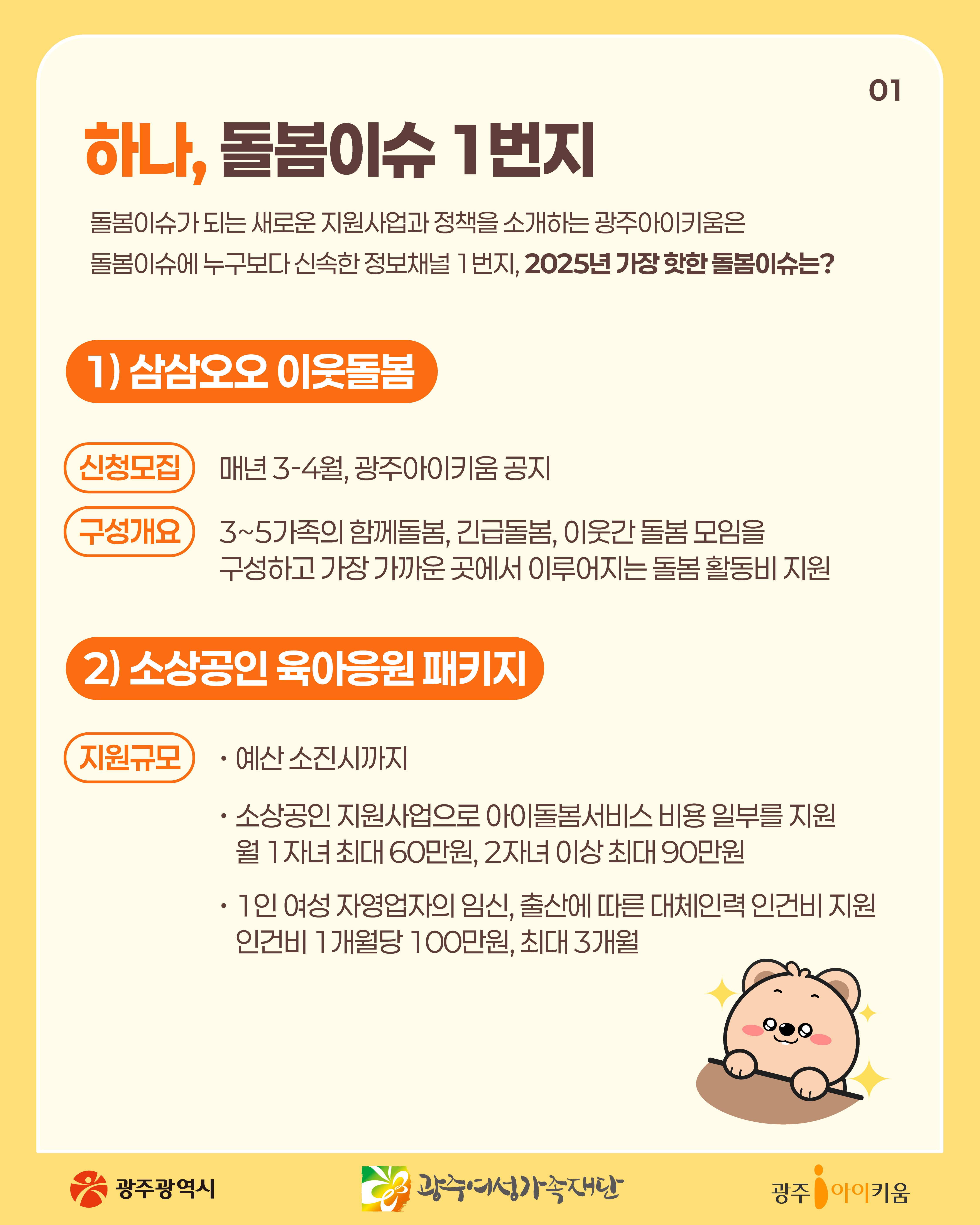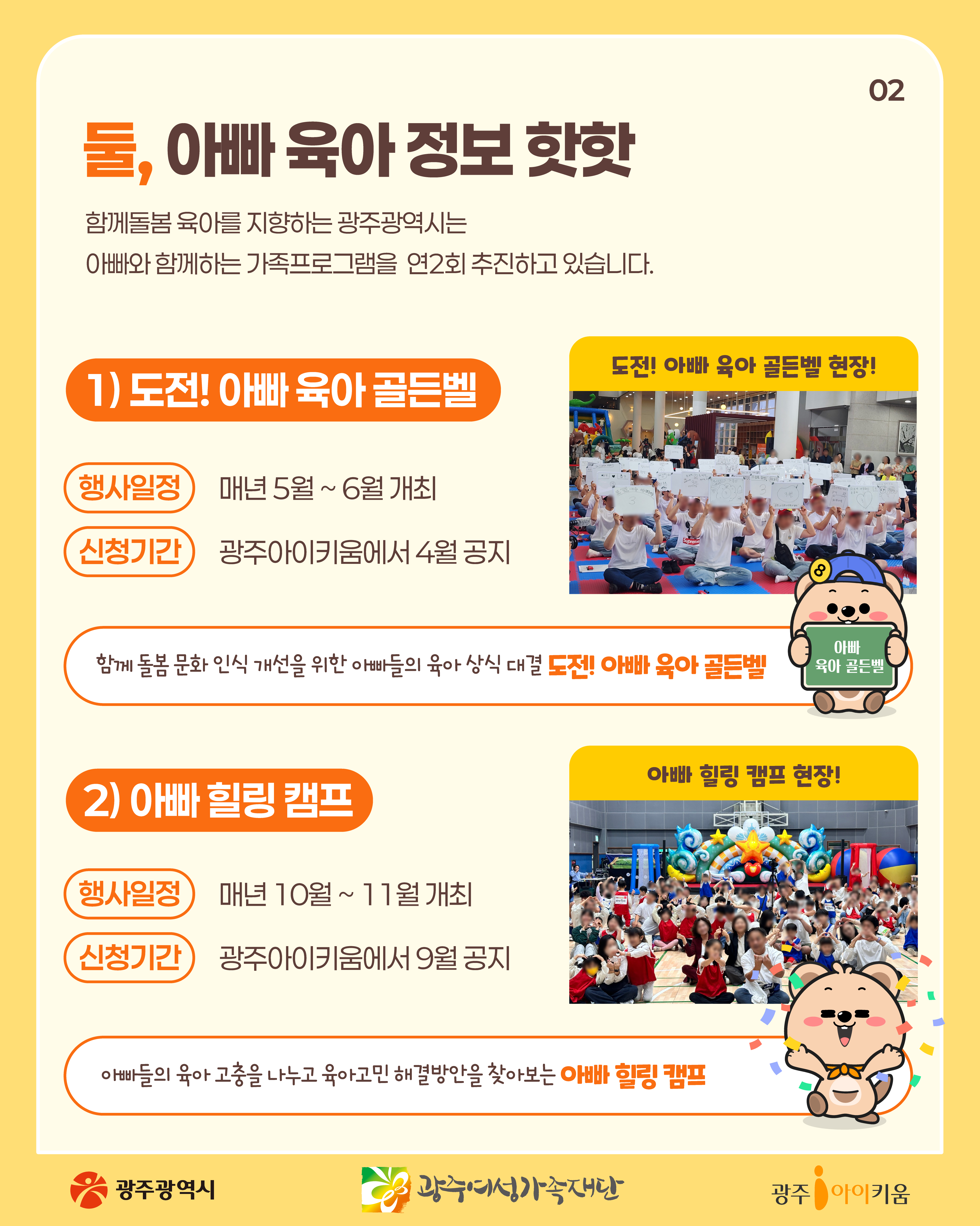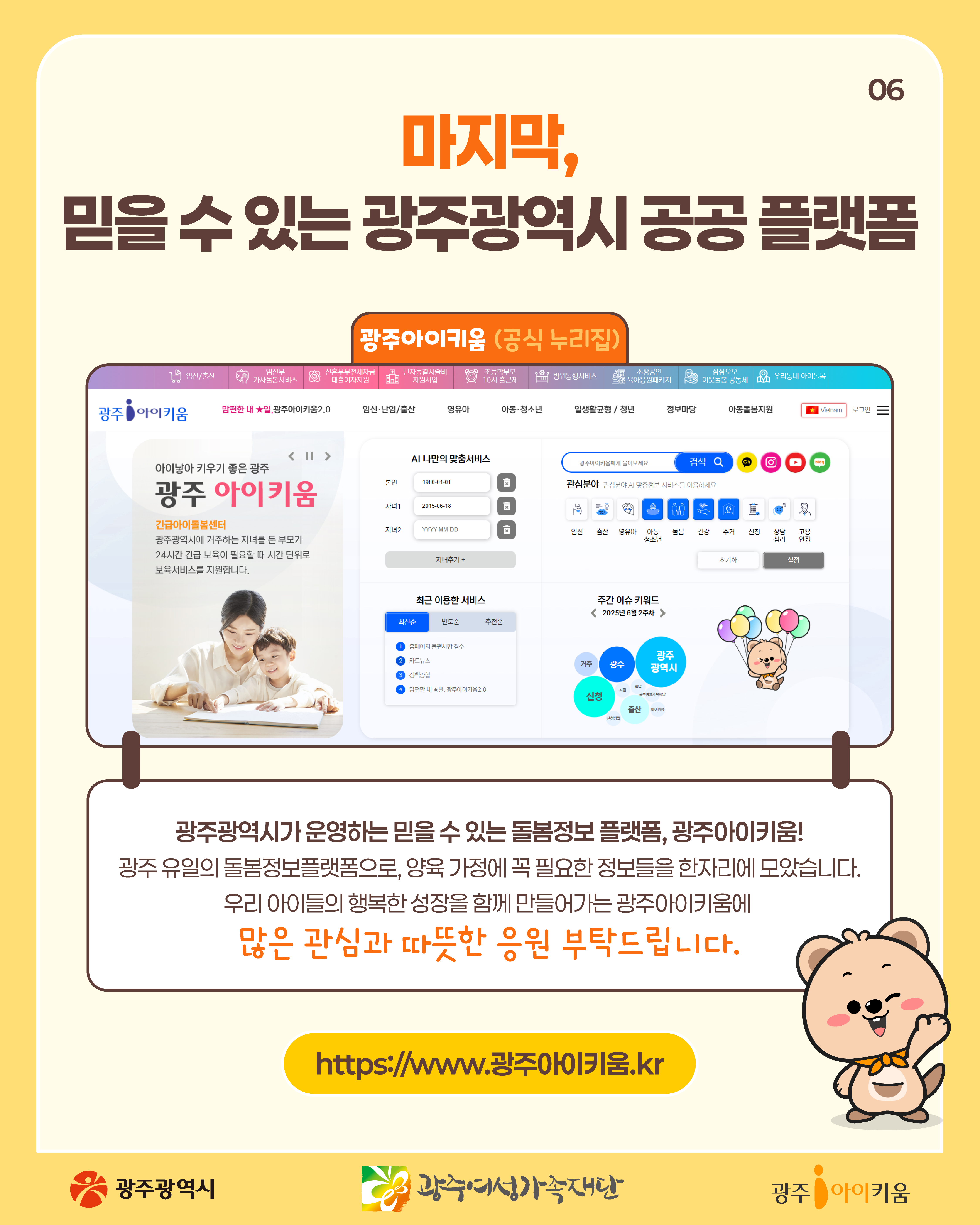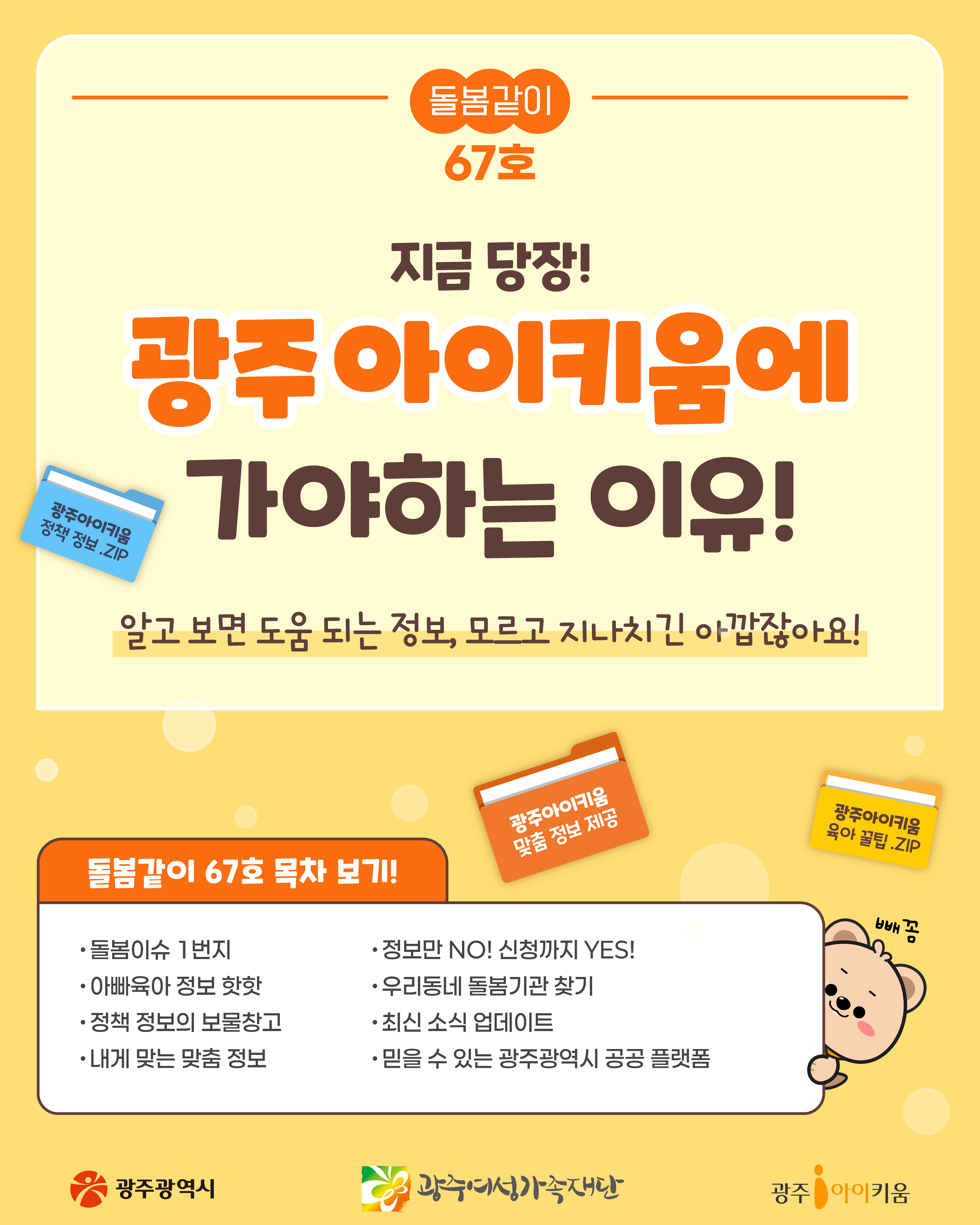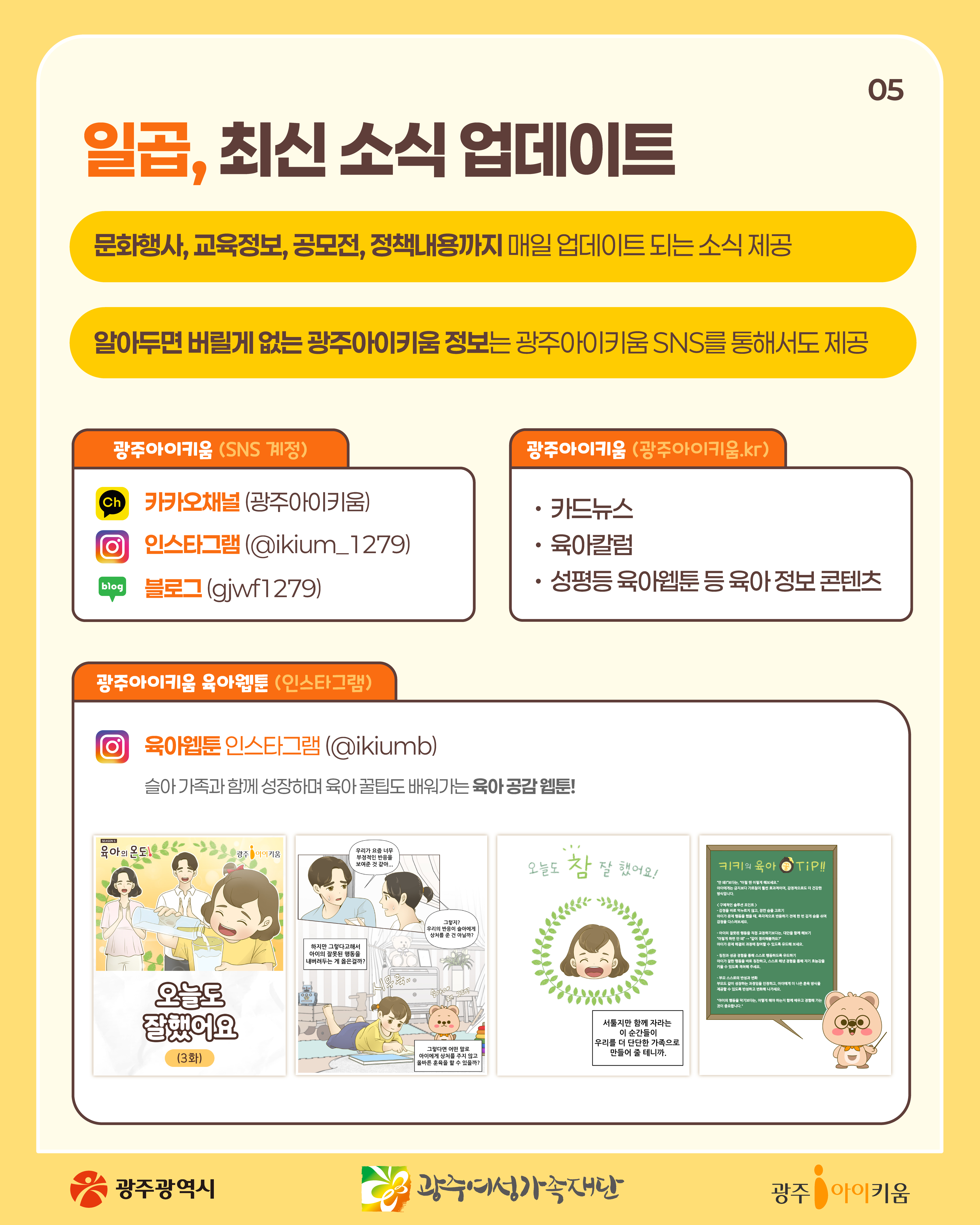 home 맘편한 내★일, 광주아이키움2.0 결혼·임신·출생 영유아 초·중·고 다양한 가족 일생활균형 커뮤니티 아동돌봄지원 소통방 나눔방 광주 아이키움 상담방 돌봄정보방 성폭력 피해 상담 및 사건지원 공지사항 이벤트소식 참여게시판 카드뉴스 동영상 아이키움 칼럼 성평등 육아웹툰 로고&캐릭터 돌봄같이 67호- 지금 당장! 광주아이키움에 가야하는 이유 등록일 : 2025-06-24 11:05 작성자 : 운영자 조회수 : 166 첨부파일 KakaoTalk_20250619_164112440_08.jpg 다운로드 목록