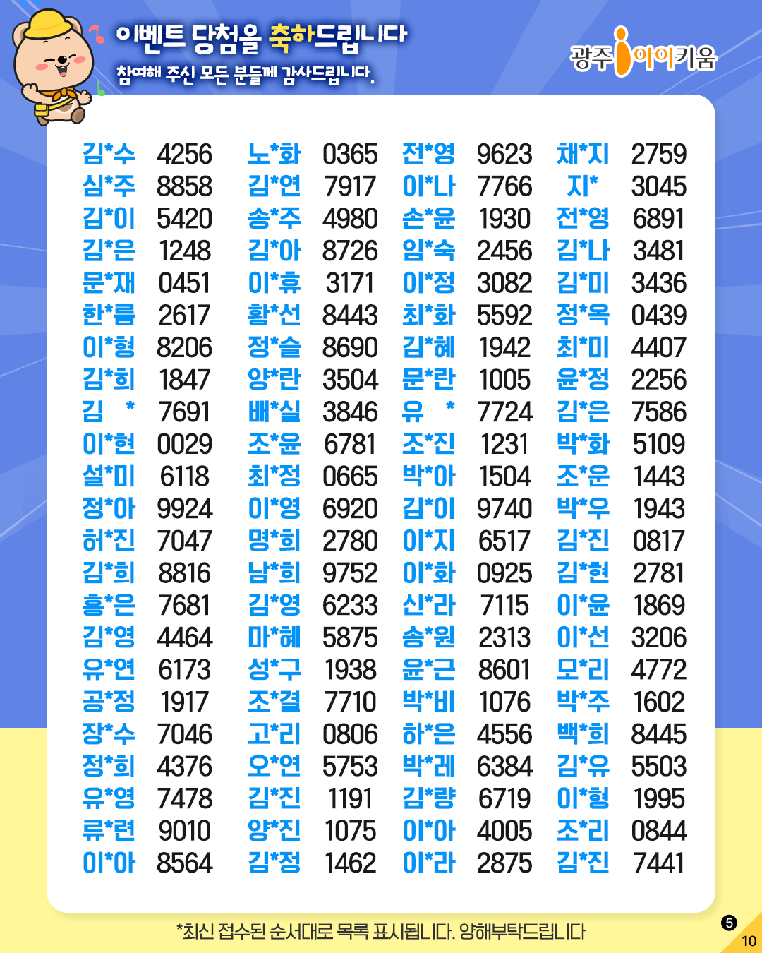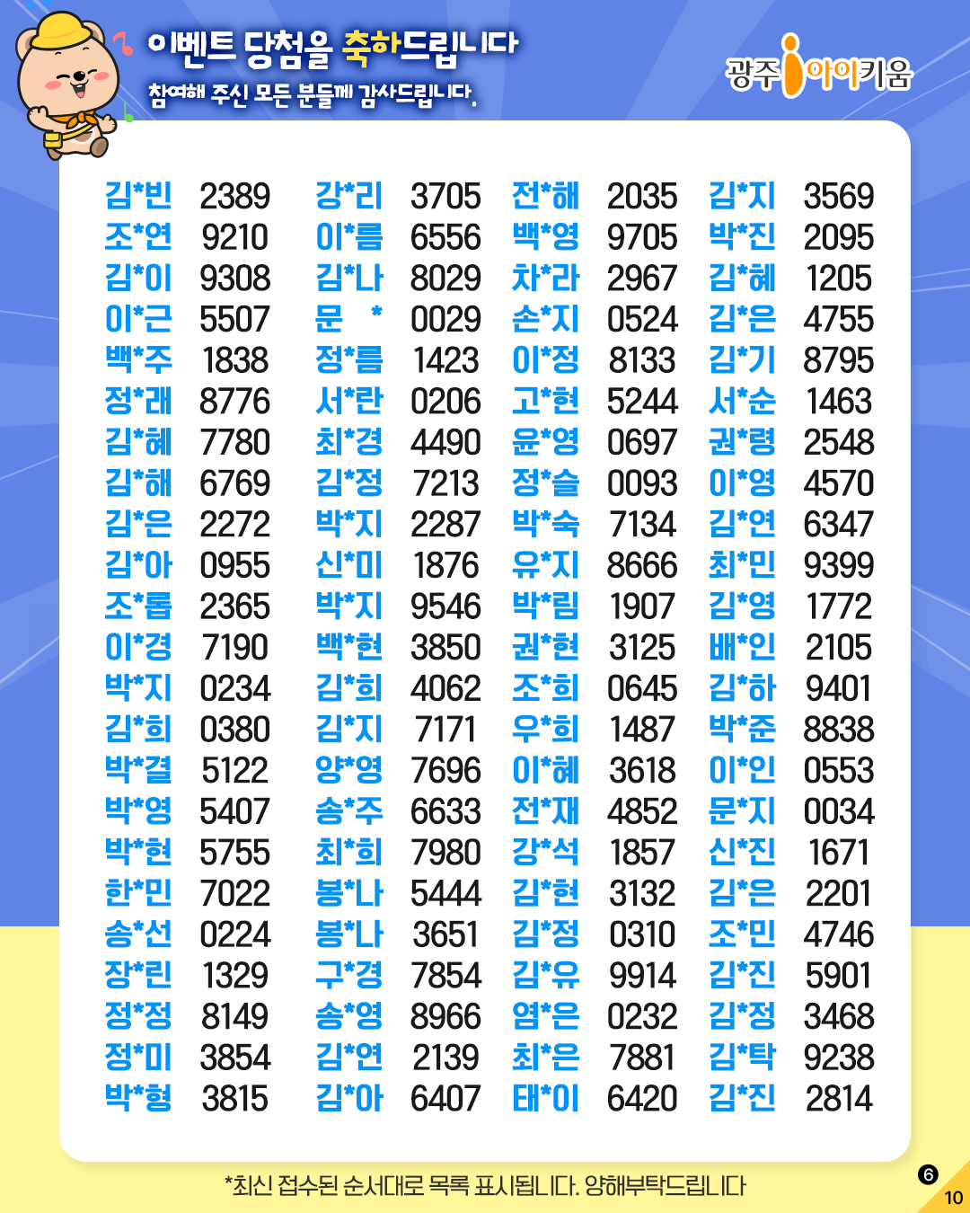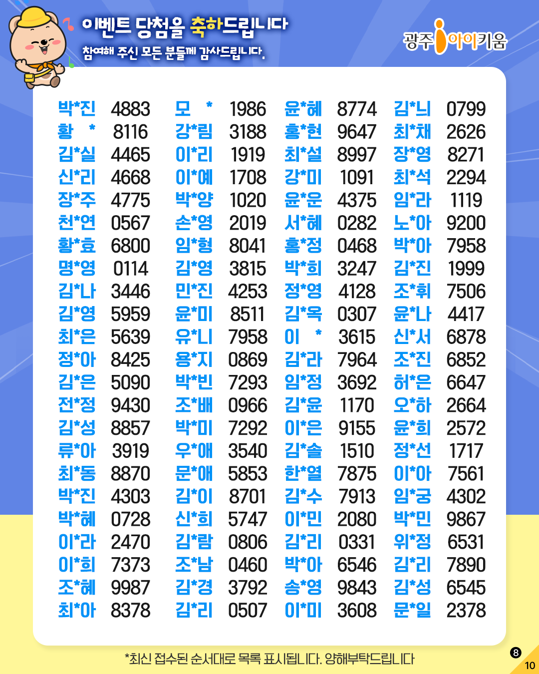 home 맘편한 내★일, 광주아이키움2.0 결혼·임신·출생 영유아 초·중·고 다양한 가족 일생활균형 커뮤니티 아동돌봄지원 소통방 나눔방 광주 아이키움 상담방 돌봄정보방 성폭력 피해 상담 및 사건지원 공지사항 이벤트소식 참여게시판 카드뉴스 동영상 아이키움 칼럼 성평등 육아웹툰 로고&캐릭터 ✨퀴즈이벤트 '폭삭 맞췄수다' 당첨자 발표✨ 등록일 : 2025-06-30 13:37 작성자 : 운영자 조회수 : 122 첨부파일 20250630_133732.jpg 다운로드 목록
