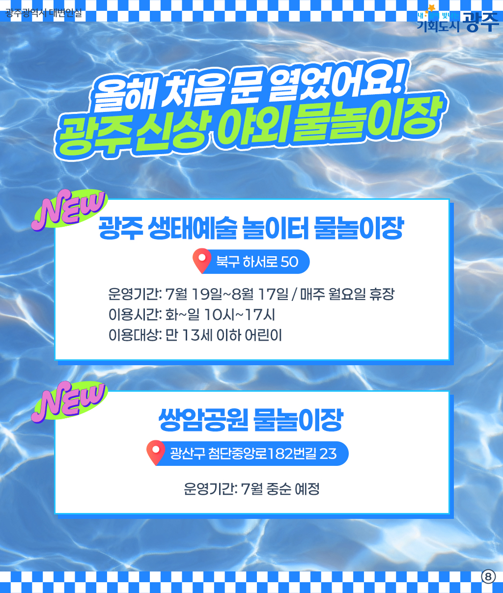 home 맘편한 내★일, 광주아이키움2.0 결혼·임신·출생 영유아 초·중·고 다양한 가족 일생활균형 커뮤니티 아동돌봄지원 소통방 나눔방 광주 아이키움 상담방 돌봄정보방 성폭력 피해 상담 및 사건지원 공지사항 이벤트소식 참여게시판 카드뉴스 동영상 아이키움 칼럼 성평등 육아웹툰 로고&캐릭터 광주 무료 야외 물놀이장 무더위 물리칠 G-워터밤이 온다! 등록일 : 2025-07-11 11:04 작성자 : 운영자 조회수 : 444 첨부파일 1.jpg 다운로드 [출처 : 광주광역시] 목록
