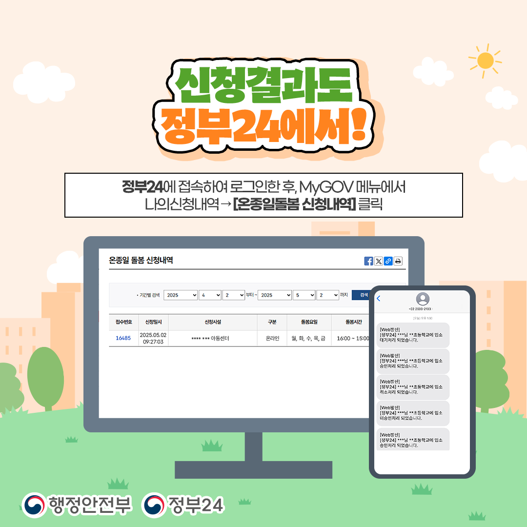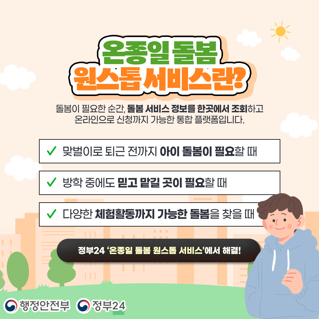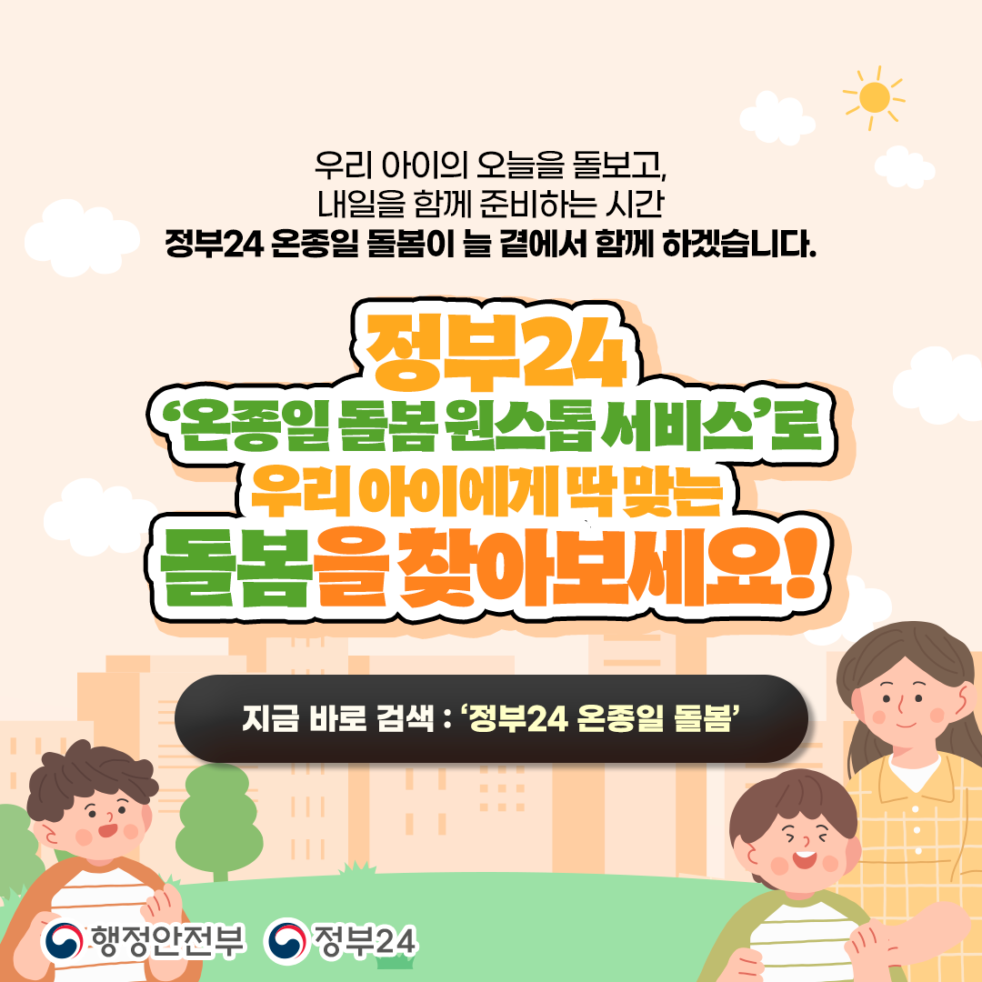 home 맘편한 내★일, 광주아이키움2.0 결혼·임신·출생 영유아 초·중·고 다양한 가족 일생활균형 커뮤니티 아동돌봄지원 소통방 나눔방 광주 아이키움 상담방 돌봄정보방 성폭력 피해 상담 및 사건지원 공지사항 이벤트소식 참여게시판 카드뉴스 동영상 아이키움 칼럼 성평등 육아웹툰 로고&캐릭터 정부24에서 우리 아이 돌봄 신청하세요. 등록일 : 2025-08-04 15:52 작성자 : 운영자 조회수 : 59 첨부파일 1.png 다운로드 맞벌이 가정도, 방학 중에도, 우리 아이 돌봄이 걱정될 때!정부24 '온종일 돌봄 원스톱 서비스'로돌봄 정보 조회부터 신청까지 한 번에 해결하세요.[출처] 온종일 걱정 없이! 정부24에서 우리 아이 돌봄 신청하세요.|작성자 정부24 목록