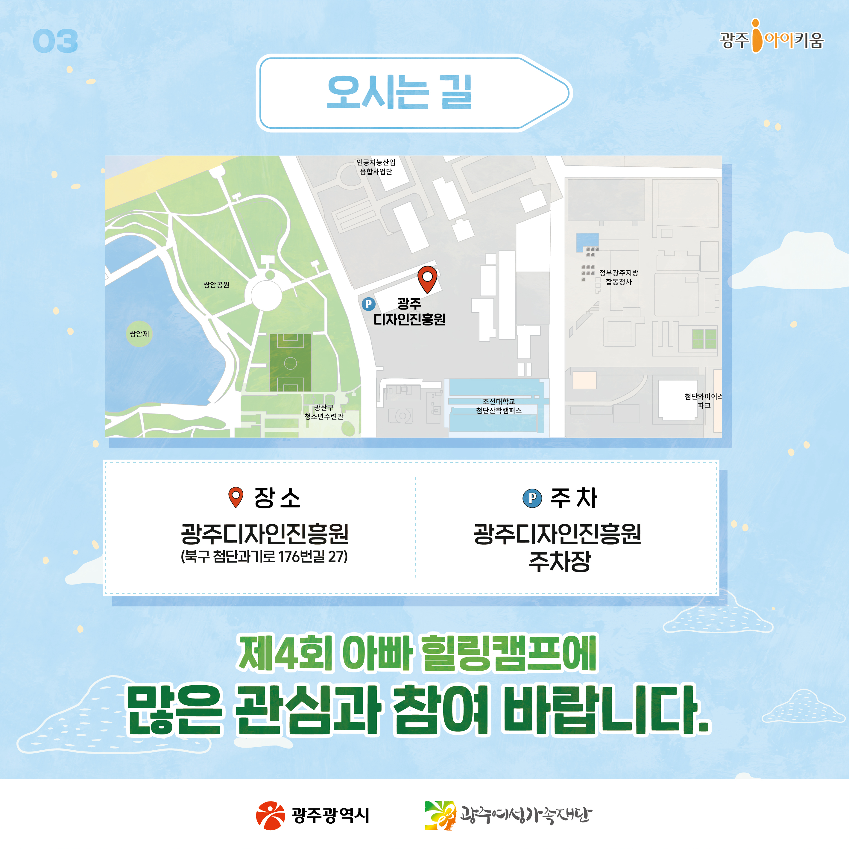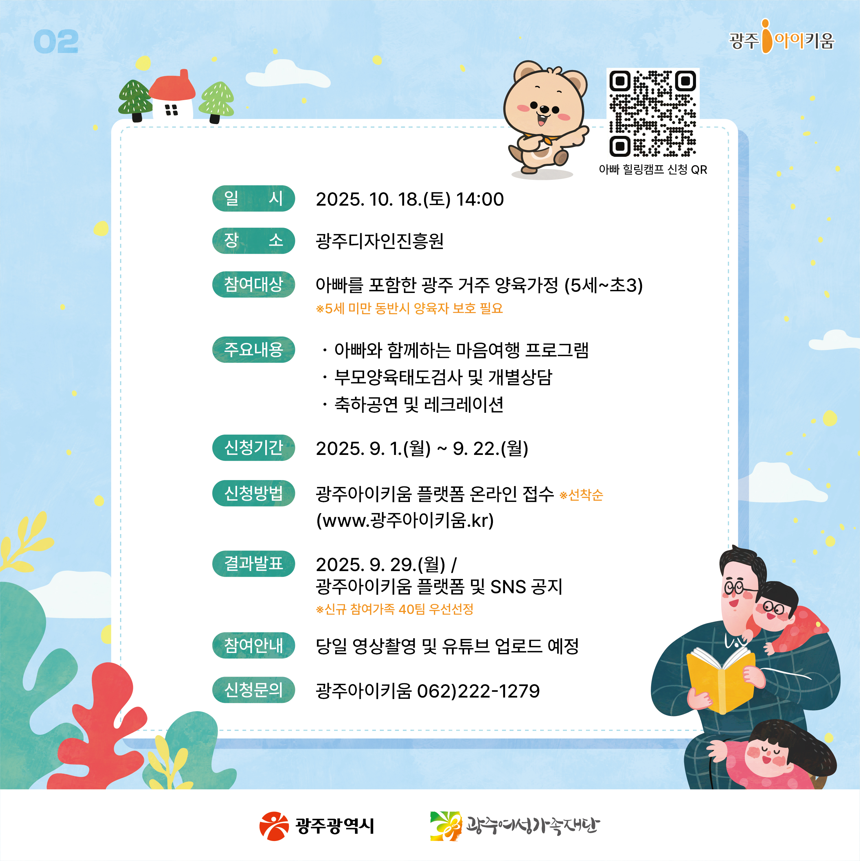 home 맘편한 내★일, 광주아이키움2.0 결혼·임신·출생 영유아 초·중·고 다양한 가족 일생활균형 커뮤니티 아동돌봄지원 소통방 나눔방 광주 아이키움 상담방 돌봄정보방 성폭력 피해 상담 및 사건지원 공지사항 이벤트소식 참여게시판 카드뉴스 동영상 아이키움 칼럼 성평등 육아웹툰 로고&캐릭터 제4회 아빠힐링캠프 참가 신청 안내 등록일 : 2025-08-29 11:14 작성자 : 운영자 조회수 : 76 첨부파일 KakaoTalk_20250828_101430214_04.jpg 다운로드 목록
