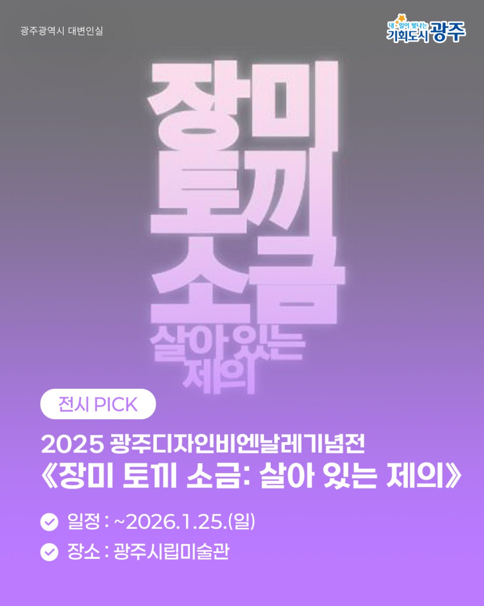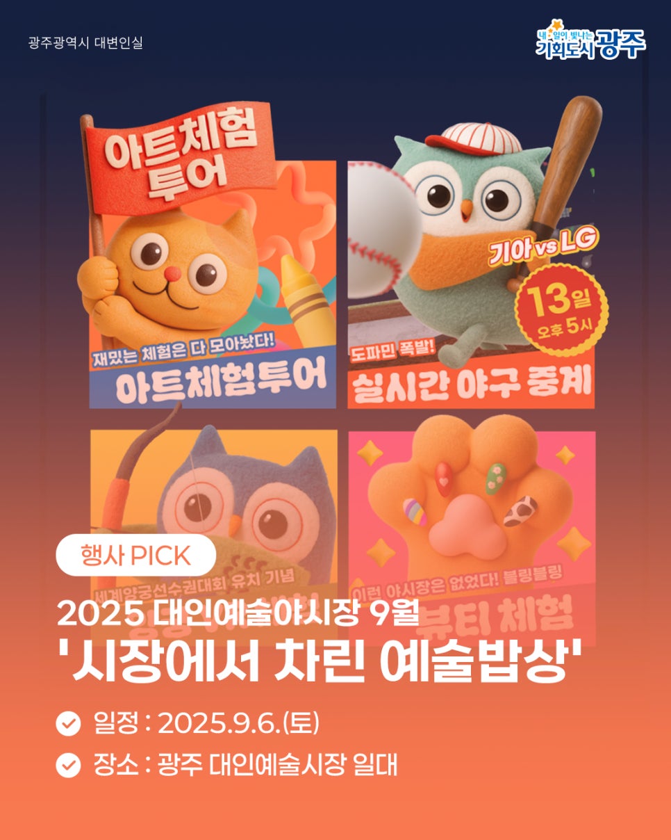 home 맘편한 내★일, 광주아이키움2.0 결혼·임신·출생 영유아 초·중·고 다양한 가족 일생활균형 커뮤니티 아동돌봄지원 소통방 나눔방 광주 아이키움 상담방 돌봄정보방 성폭력 피해 상담 및 사건지원 공지사항 이벤트소식 참여게시판 카드뉴스 동영상 아이키움 칼럼 성평등 육아웹툰 로고&캐릭터 9월 1주차 광주 WEEK! 놓치면 후회할 이번 주 광주 소식 등록일 : 2025-09-02 16:51 작성자 : 운영자 조회수 : 47 첨부파일 1.jpg 다운로드 목록