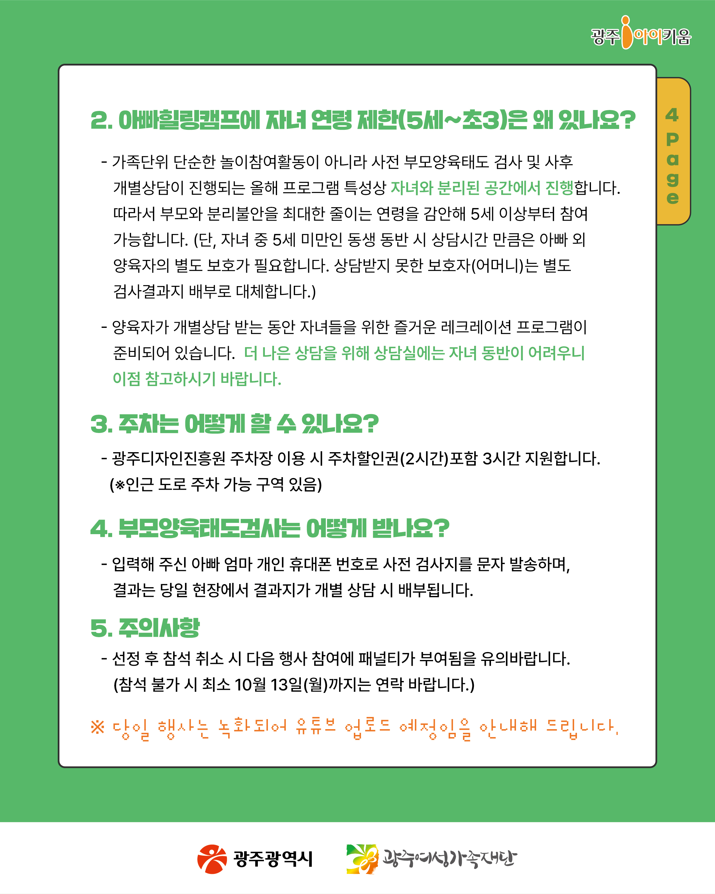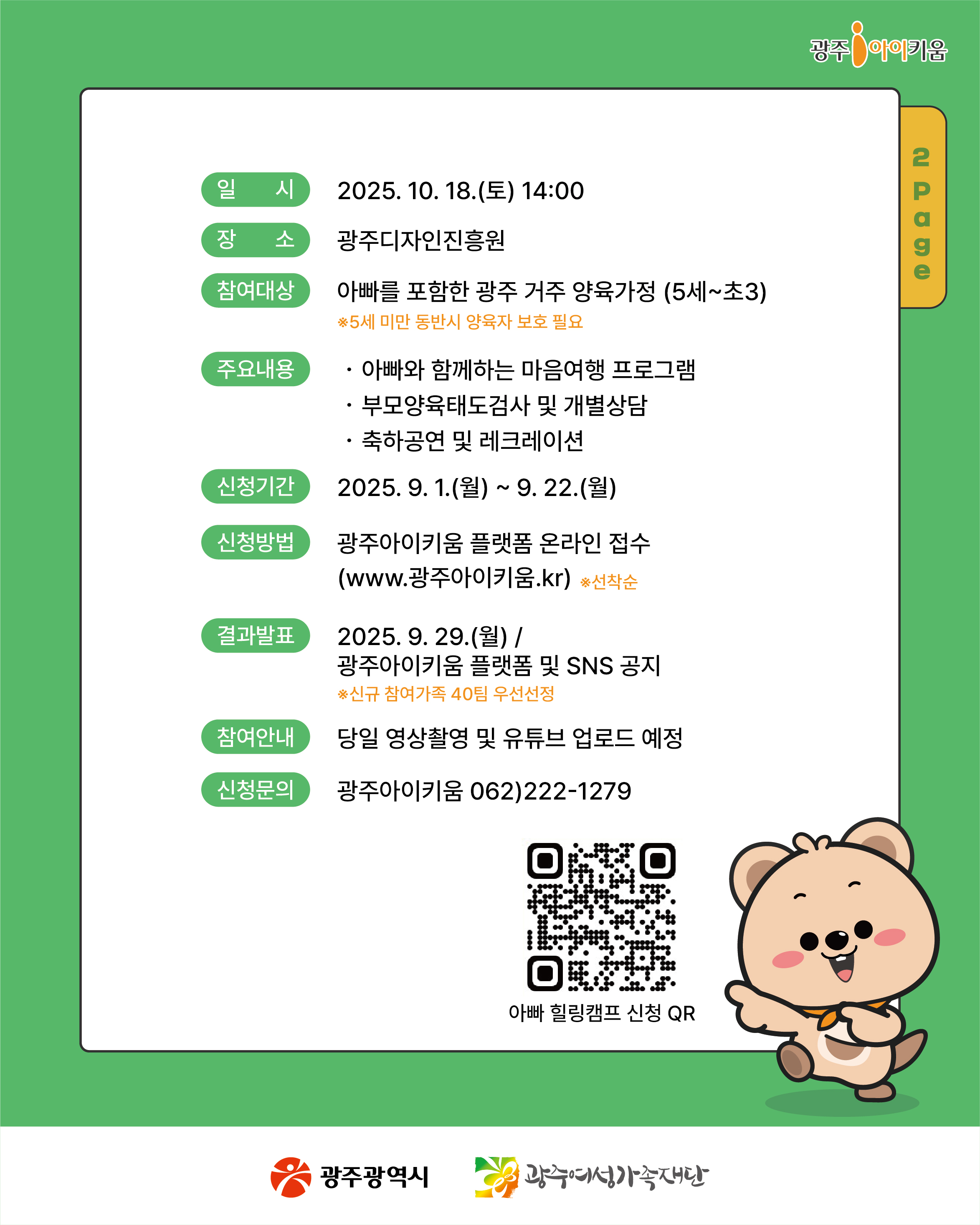 home 맘편한 내★일, 광주아이키움2.0 결혼·임신·출생 영유아 초·중·고 다양한 가족 일생활균형 커뮤니티 아동돌봄지원 소통방 나눔방 광주 아이키움 상담방 돌봄정보방 성폭력 피해 상담 및 사건지원 공지사항 이벤트소식 참여게시판 카드뉴스 동영상 아이키움 칼럼 성평등 육아웹툰 로고&캐릭터 제4회 아빠힐링캠프 '궁금해요' 등록일 : 2025-09-04 14:45 작성자 : 운영자 조회수 : 164 첨부파일 KakaoTalk_20250904_142807393_04.jpg 다운로드 목록