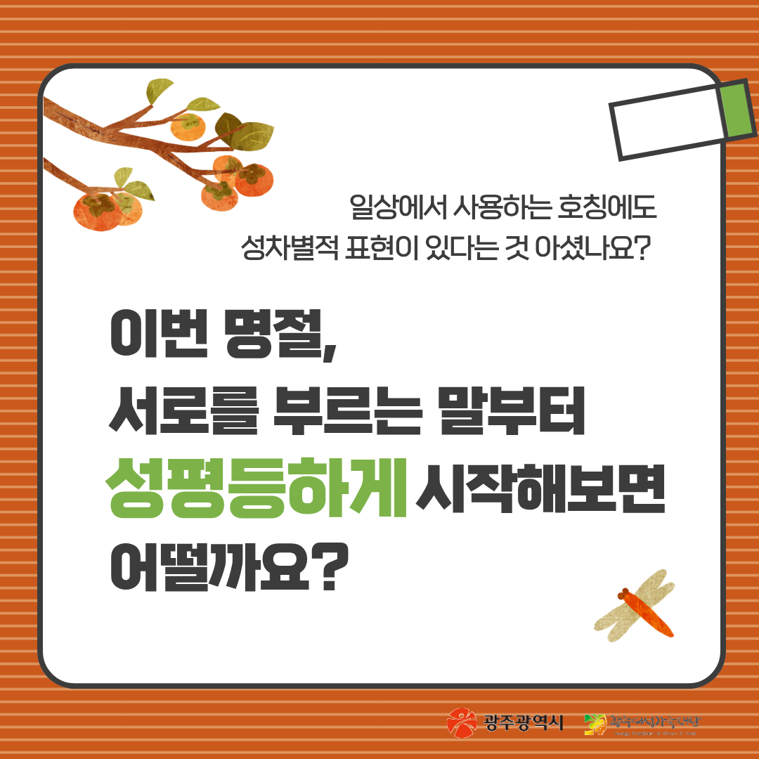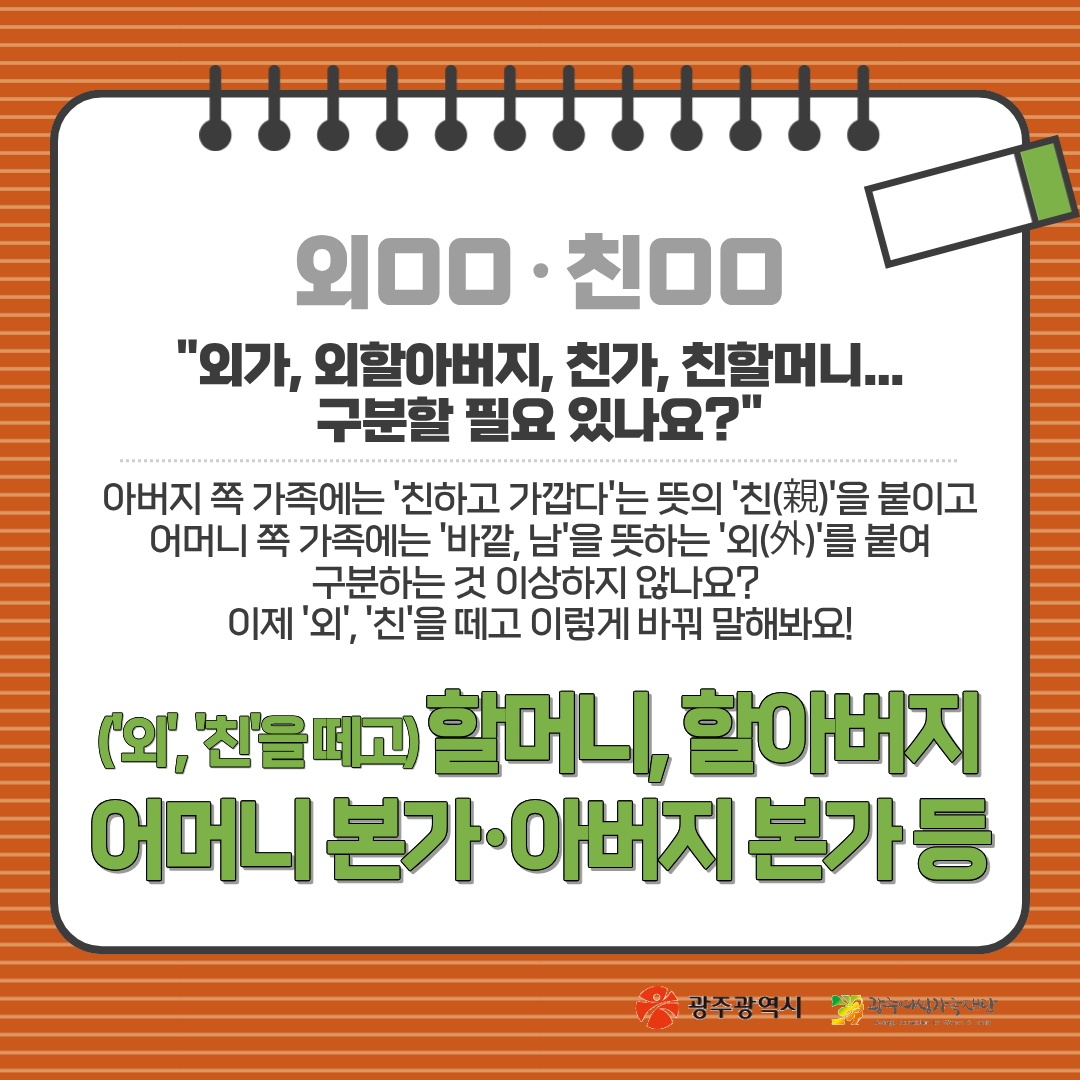 home 맘편한 내★일, 광주아이키움2.0 결혼·임신·출생 영유아 초·중·고 다양한 가족 일생활균형 커뮤니티 아동돌봄지원 소통방 나눔방 광주 아이키움 상담방 돌봄정보방 성폭력 피해 상담 및 사건지원 공지사항 이벤트소식 참여게시판 카드뉴스 동영상 아이키움 칼럼 성평등 육아웹툰 로고&캐릭터 '성평등 단어노트 - 명절편' 등록일 : 2025-09-25 11:03 작성자 : 운영자 조회수 : 67 첨부파일 성평등단어노트 (1).png 다운로드 광주광역시와 광주여성가족재단이 함께하는 일상 속 성평등 찾기!성평등 단어노트 - 명절편광주여성가족재단말은 생각을 만들고, 생각은 행동을 바꿉니다.🍀매달 배달되는 '성평등 단어노트'와 함께 모두가 평등하고 존중받는 사회를 만들어가요!많은 관심과 응원 바랍니다. 목록
