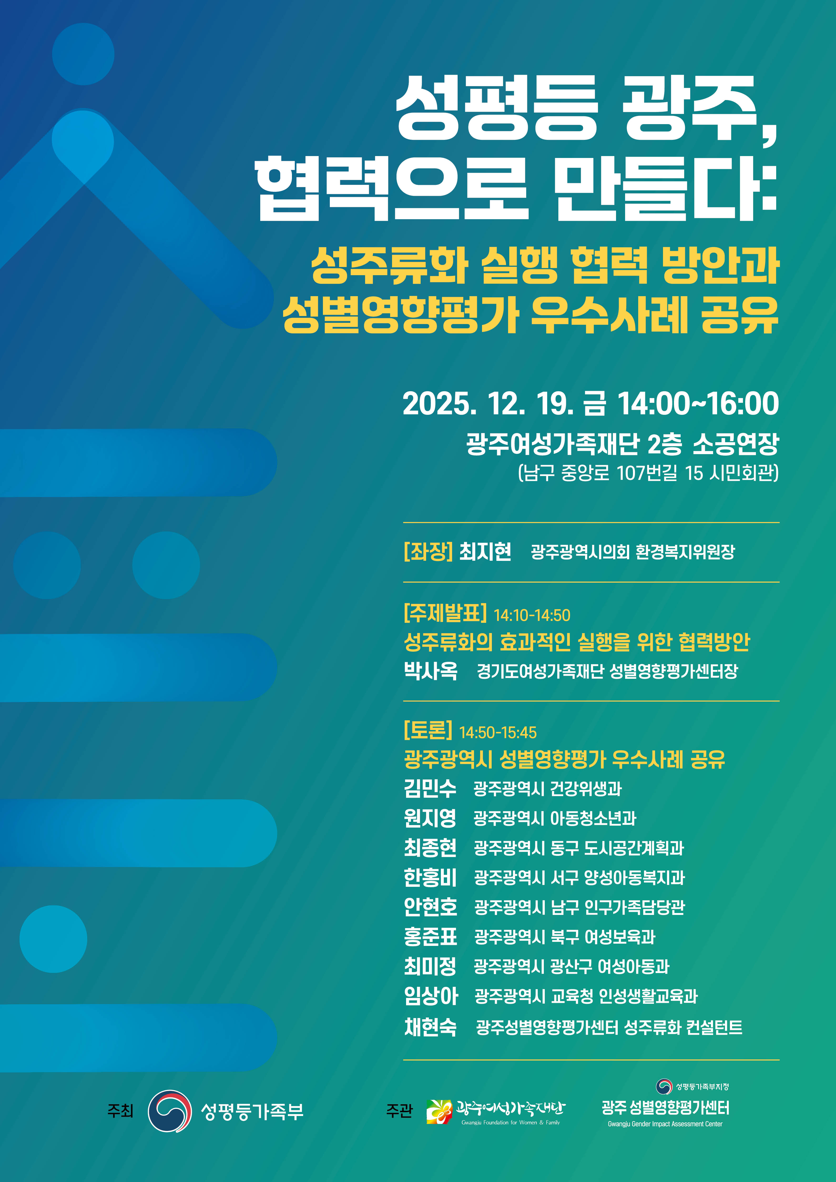 성주류화 제도의 활성화를 통해 성평등한 광주를 실현하고자, 오는 12월 19일(금) 「성평등 광주, 협력으로 만들다」 포럼을 개최합니다.