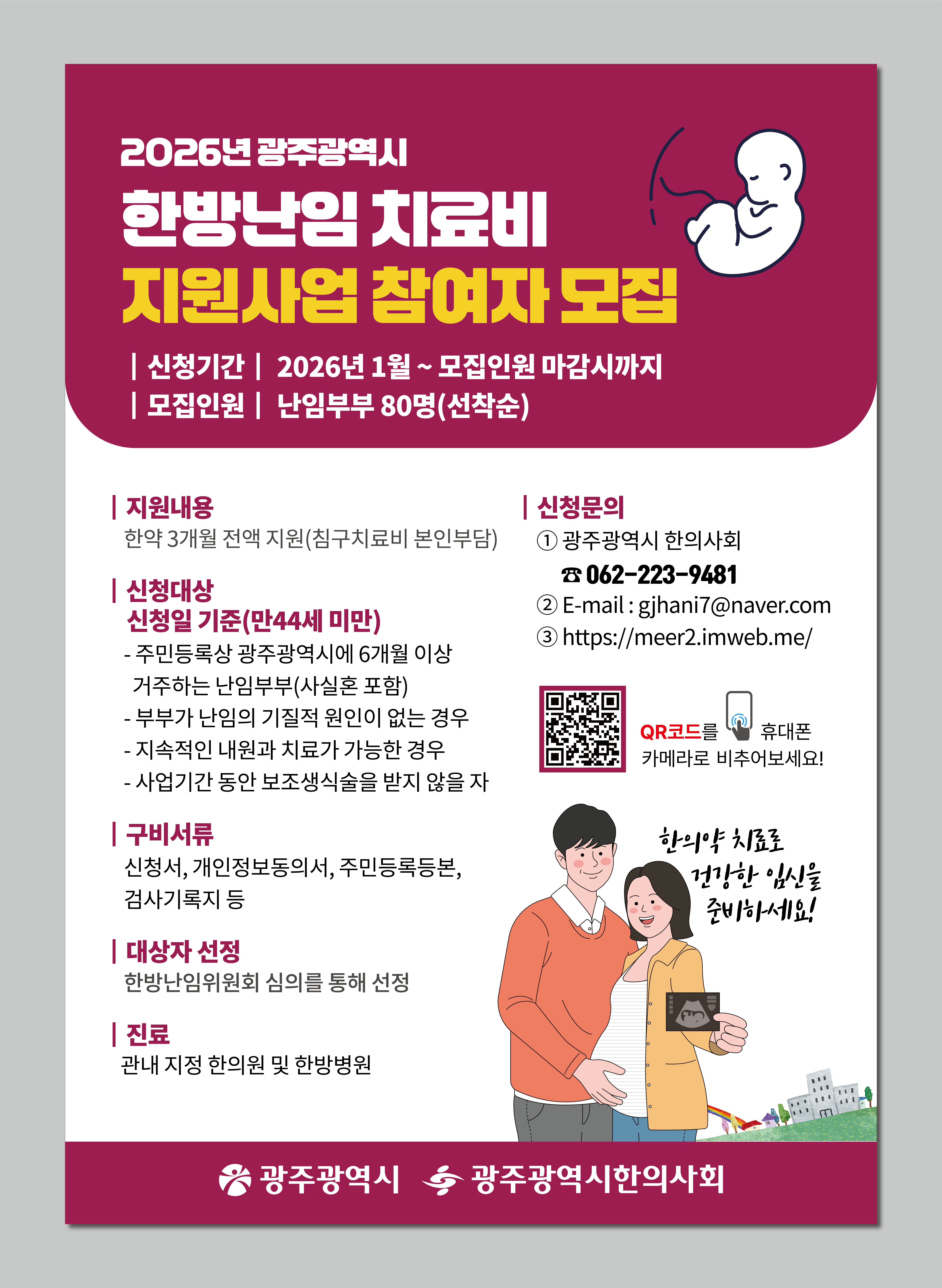 home 맘편한 내★일, 광주아이키움2.0 결혼·임신·출생 영유아 초·중·고 다양한 가족 일생활균형 커뮤니티 아동돌봄지원 소통방 나눔방 광주 아이키움 상담방 돌봄정보방 성폭력 피해 상담 및 사건지원 공지사항 이벤트소식 참여게시판 카드뉴스 동영상 아이키움 칼럼 성평등 육아웹툰 로고&캐릭터 2026년 한방난임 치료비 지원사업 참여자 모집 등록일 : 2026-02-05 15:10 작성자 : 운영자 조회수 : 12 첨부파일 인스타용.jpg 다운로드 2026년 광주광역시 한방난임 치료비 지원사업 참여자를 모집합니다. 많은 관심과 참여 부탁드립니다. 목록