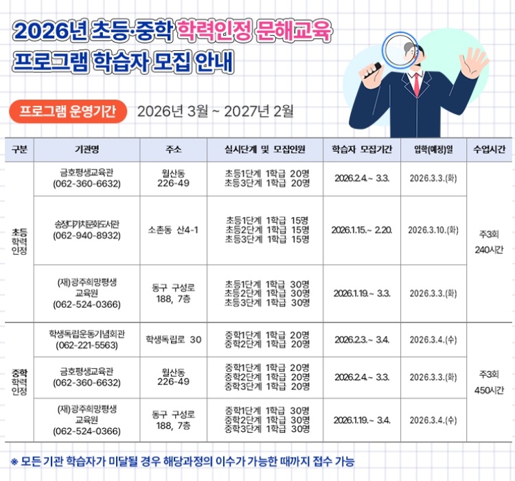 home 맘편한 내★일, 광주아이키움2.0 결혼·임신·출생 영유아 초·중·고 다양한 가족 일생활균형 커뮤니티 아동돌봄지원 소통방 나눔방 광주 아이키움 상담방 돌봄정보방 성폭력 피해 상담 및 사건지원 공지사항 이벤트소식 참여게시판 카드뉴스 동영상 아이키움 칼럼 성평등 육아웹툰 로고&캐릭터 초·중학 학력인정 문해교육 학습자 모집 등록일 : 2026-02-12 15:16 작성자 : 운영자 조회수 : 7 첨부파일 문해교육2.png 다운로드 배움에는 시기가 없다! 오늘이 가장 젊은 그대, 도전하라! [출처 :광주광역시교육청] 목록
