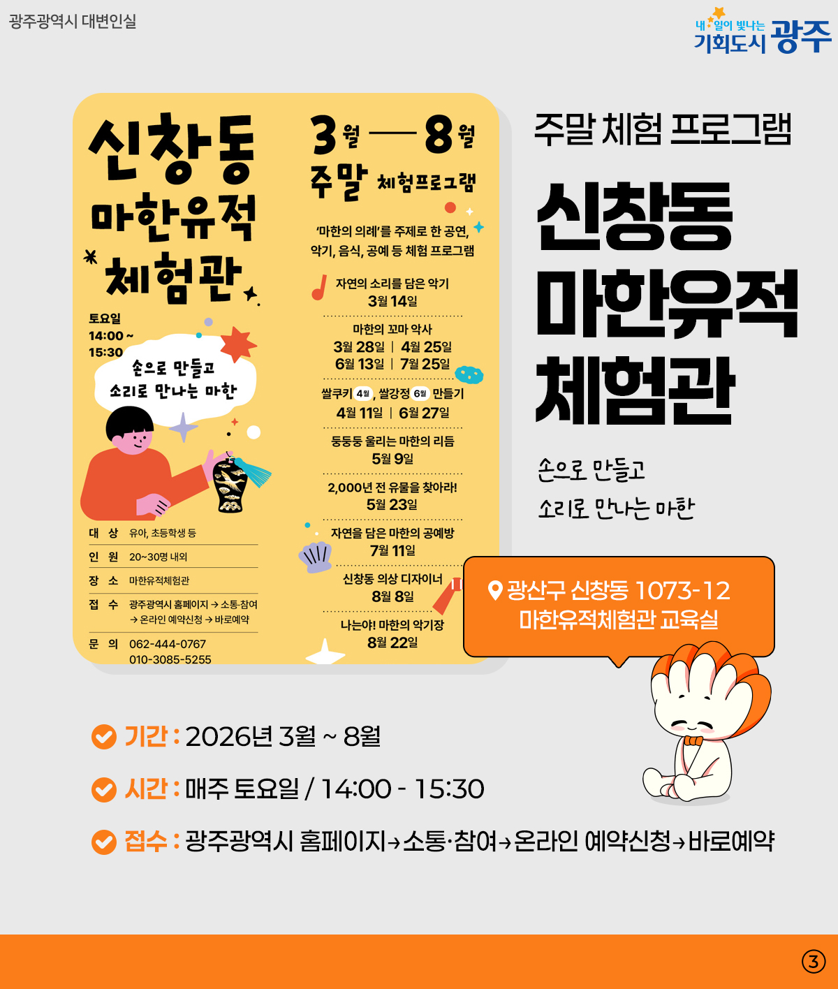 home 맘편한 내★일, 광주아이키움2.0 결혼·임신·출생 영유아 초·중·고 다양한 가족 일생활균형 커뮤니티 아동돌봄지원 소통방 나눔방 광주 아이키움 상담방 돌봄정보방 성폭력 피해 지원 안내 공지사항 이벤트소식 참여게시판 카드뉴스 동영상 아이키움 칼럼 성평등 육아웹툰 로고&캐릭터 광주 WEEK 3월 4주차 여기 가려고 일주일을 기다렸어 등록일 : 2026-03-26 15:37 작성자 : 운영자 조회수 : 11 첨부파일 1.jpeg 다운로드 출처:광주광역시 목록