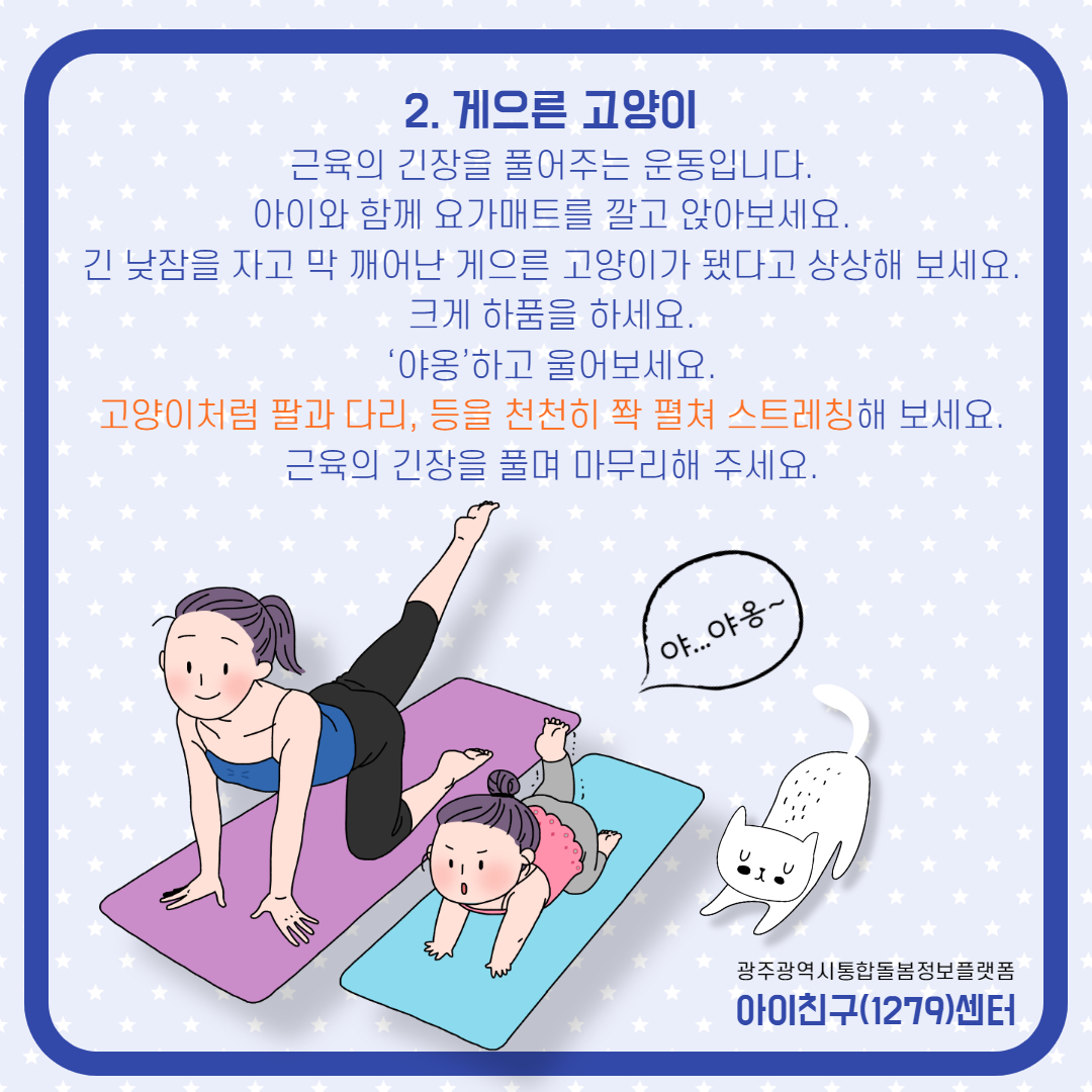 home 맘편한 내★일, 광주아이키움2.0 결혼·임신·출생 영유아 초·중·고 다양한 가족 일생활균형 커뮤니티 아동돌봄지원 소통방 나눔방 광주 아이키움 상담방 돌봄정보방 성폭력 피해 상담 및 사건지원 공지사항 이벤트소식 참여게시판 카드뉴스 동영상 아이키움 칼럼 성평등 육아웹툰 로고&캐릭터 돌봄같이 2호 - 아이와 함께 하는 스트레칭 해소운동 등록일 : 2020-12-16 09:17 작성자 : 운영자 조회수 : 1340 첨부파일 돌봄같이2호.JPG 다운로드 목록