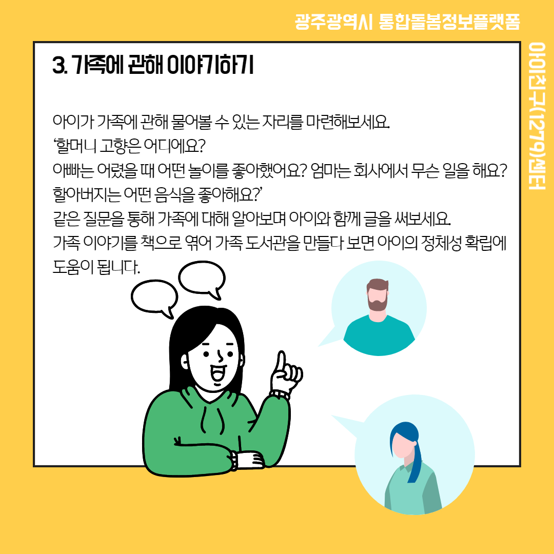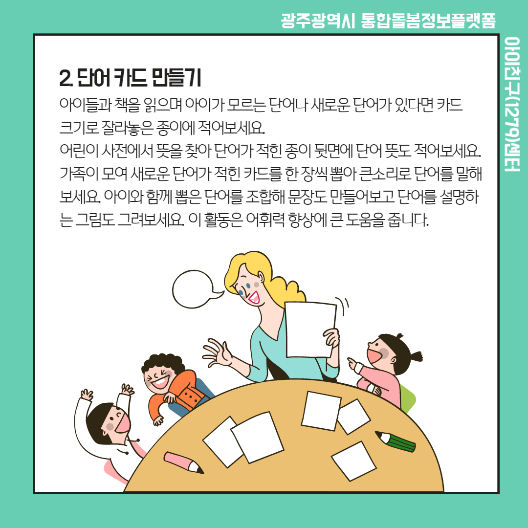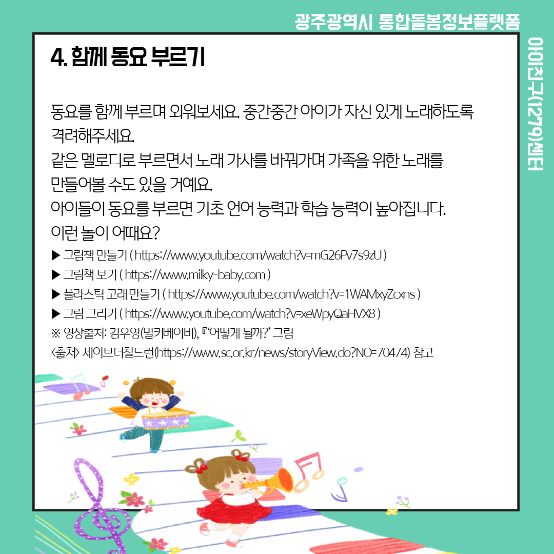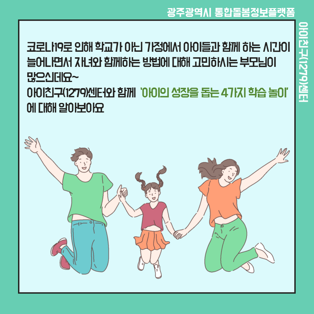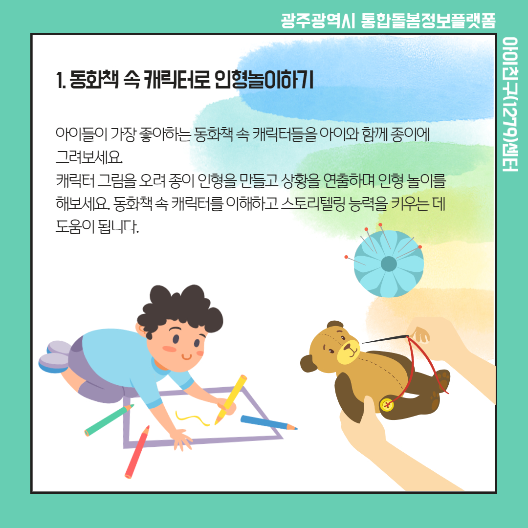 home 맘편한 내★일, 광주아이키움2.0 결혼·임신·출생 영유아 초·중·고 다양한 가족 일생활균형 커뮤니티 아동돌봄지원 소통방 나눔방 광주 아이키움 상담방 돌봄정보방 성폭력 피해 상담 및 사건지원 공지사항 이벤트소식 참여게시판 카드뉴스 동영상 아이키움 칼럼 성평등 육아웹툰 로고&캐릭터 돌봄같이 3호 - 집에서 우리아이랑 뭐하고 놀지? 등록일 : 2020-12-16 09:19 작성자 : 운영자 조회수 : 1203 첨부파일 돌봄같이3호.JPG 다운로드 목록