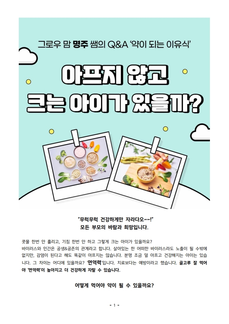 home 맘편한 내★일, 광주아이키움2.0 결혼·임신·출생 영유아 초·중·고 다양한 가족 일생활균형 커뮤니티 아동돌봄지원 소통방 나눔방 광주 아이키움 상담방 돌봄정보방 성폭력 피해 상담 및 사건지원 공지사항 이벤트소식 참여게시판 카드뉴스 동영상 아이키움 칼럼 성평등 육아웹툰 로고&캐릭터 <명주쌤과 함께하는 이유식 레시피 3편> 아프지 않고 크는 아이가 있을까? 등록일 : 2021-03-08 16:08 카테고리 : 카테고리 없음 작성자 : 운영자 조회수 : 2258 목록