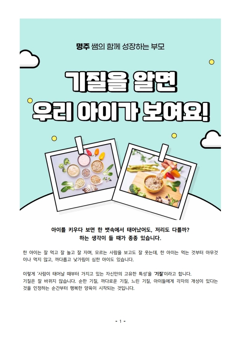 home 맘편한 내★일, 광주아이키움2.0 결혼·임신·출생 영유아 초·중·고 다양한 가족 일생활균형 커뮤니티 아동돌봄지원 소통방 나눔방 광주 아이키움 상담방 돌봄정보방 성폭력 피해 상담 및 사건지원 공지사항 이벤트소식 참여게시판 카드뉴스 동영상 아이키움 칼럼 성평등 육아웹툰 로고&캐릭터 <명주쌤과 함께하는 이유식 레시피 9편> 기질을 알면 우리 아이가 보여요! 등록일 : 2021-04-19 09:38 카테고리 : 카테고리 없음 작성자 : 운영자 조회수 : 2947 목록