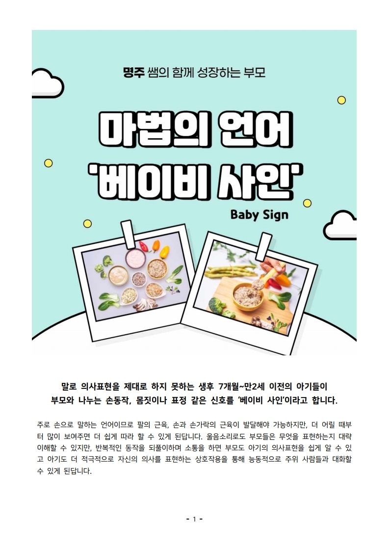 home 맘편한 내★일, 광주아이키움2.0 결혼·임신·출생 영유아 초·중·고 다양한 가족 일생활균형 커뮤니티 아동돌봄지원 소통방 나눔방 광주 아이키움 상담방 돌봄정보방 성폭력 피해 상담 및 사건지원 공지사항 이벤트소식 참여게시판 카드뉴스 동영상 아이키움 칼럼 성평등 육아웹툰 로고&캐릭터 <명주쌤과 함께하는 이유식 레시피 16편> 마법의 언어 '베이비 사인' 등록일 : 2021-06-17 18:46 카테고리 : 카테고리 없음 작성자 : 운영자 조회수 : 2001 목록