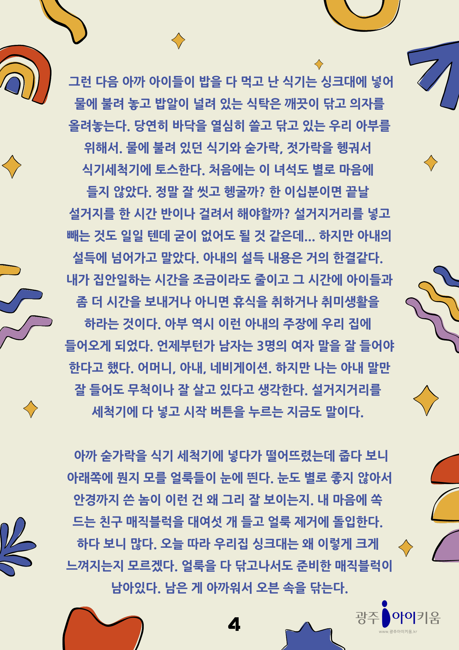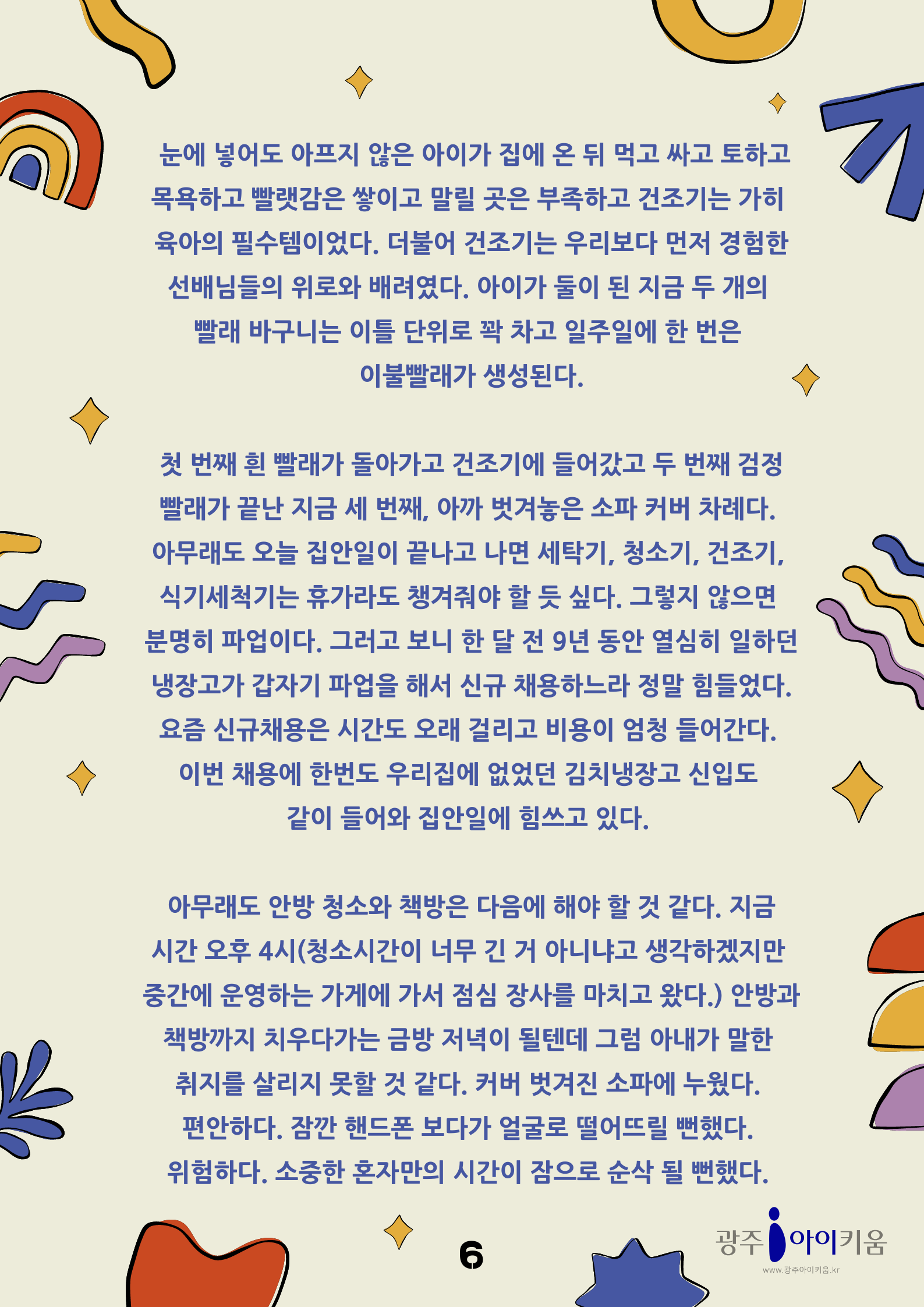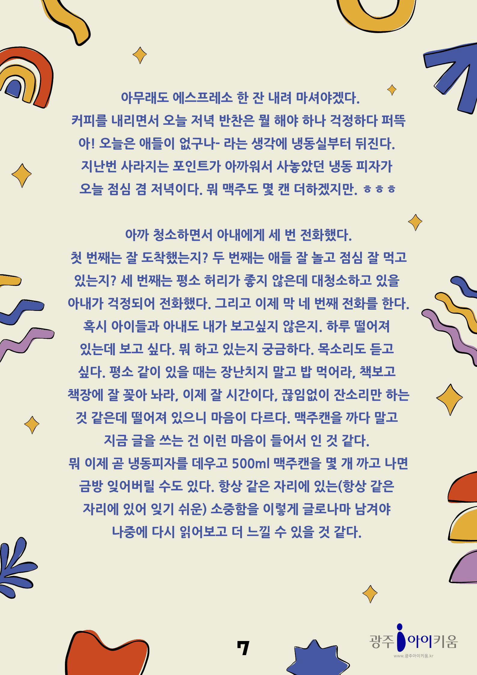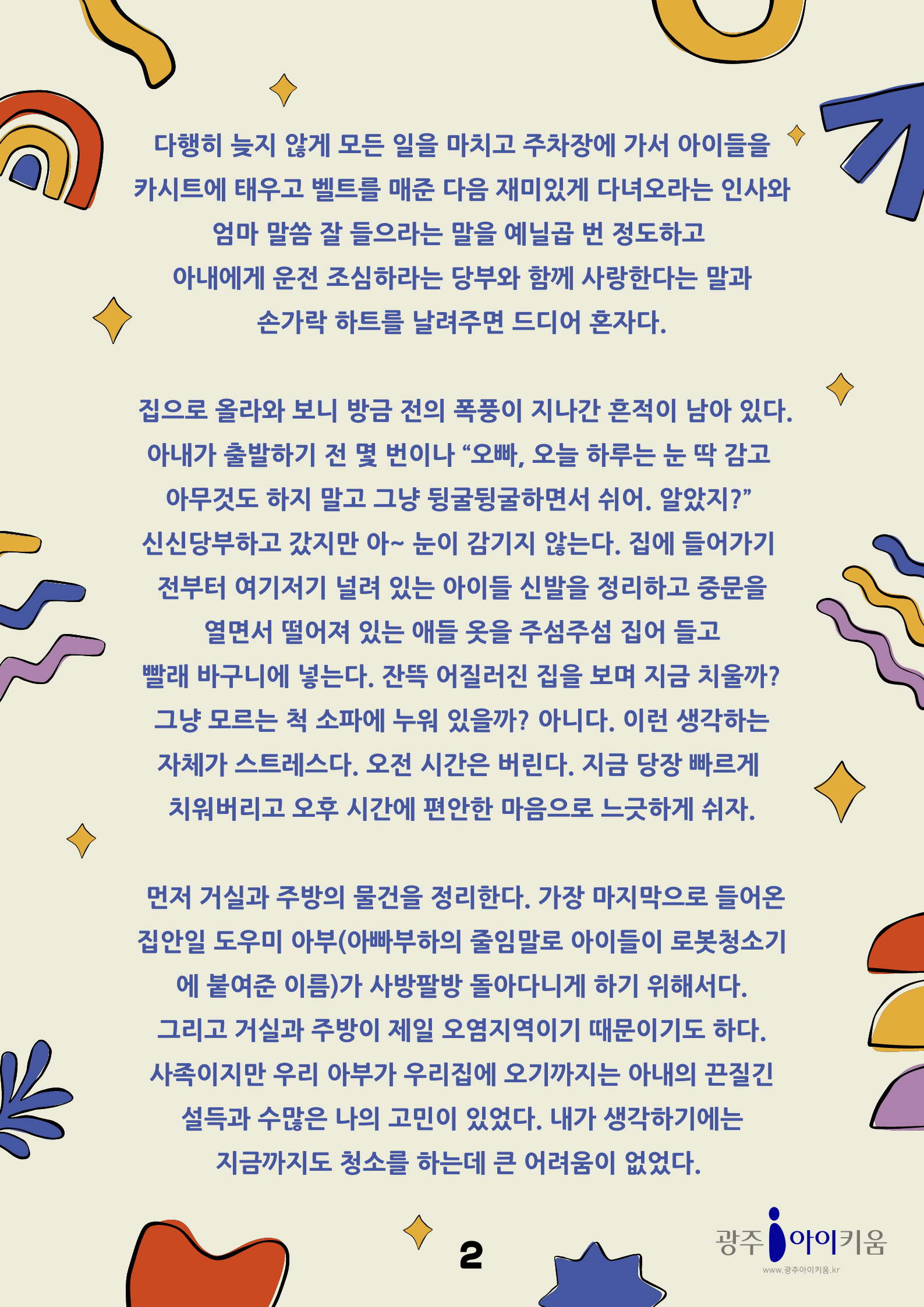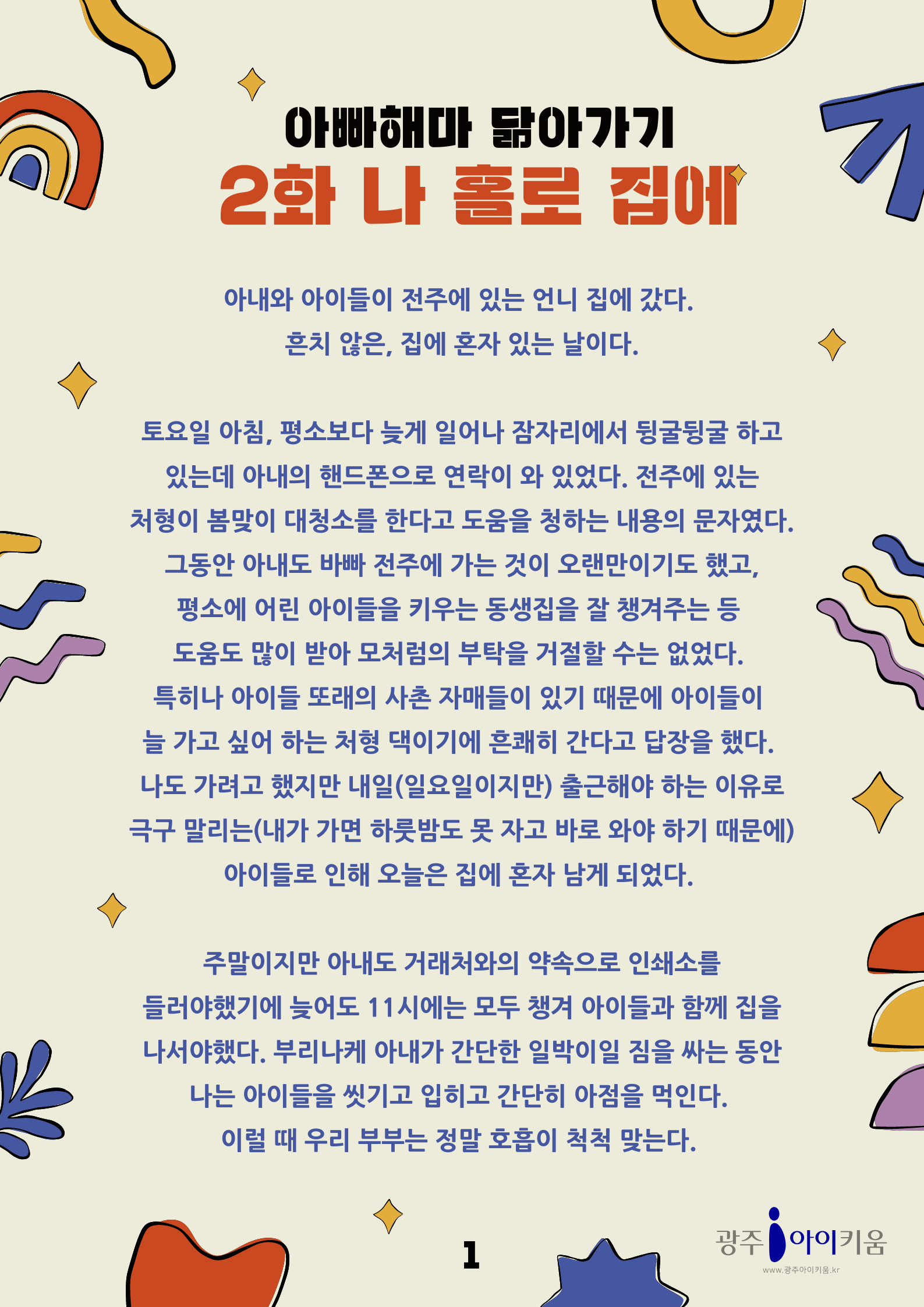 home 맘편한 내★일, 광주아이키움2.0 결혼·임신·출생 영유아 초·중·고 다양한 가족 일생활균형 커뮤니티 아동돌봄지원 소통방 나눔방 광주 아이키움 상담방 돌봄정보방 성폭력 피해 상담 및 사건지원 공지사항 이벤트소식 참여게시판 카드뉴스 동영상 아이키움 칼럼 성평등 육아웹툰 로고&캐릭터 [아빠육아] 2화- 나홀로 집에 등록일 : 2023-03-31 13:45 카테고리 : 카테고리 없음 작성자 : 운영자 조회수 : 1142 목록