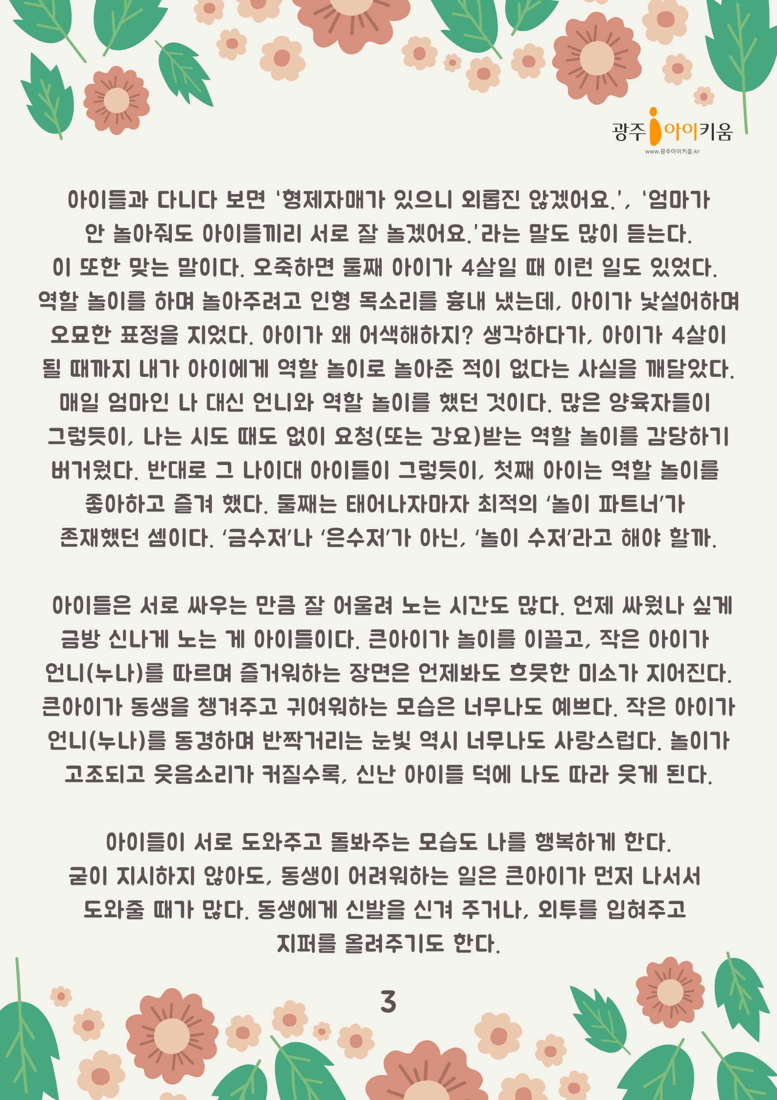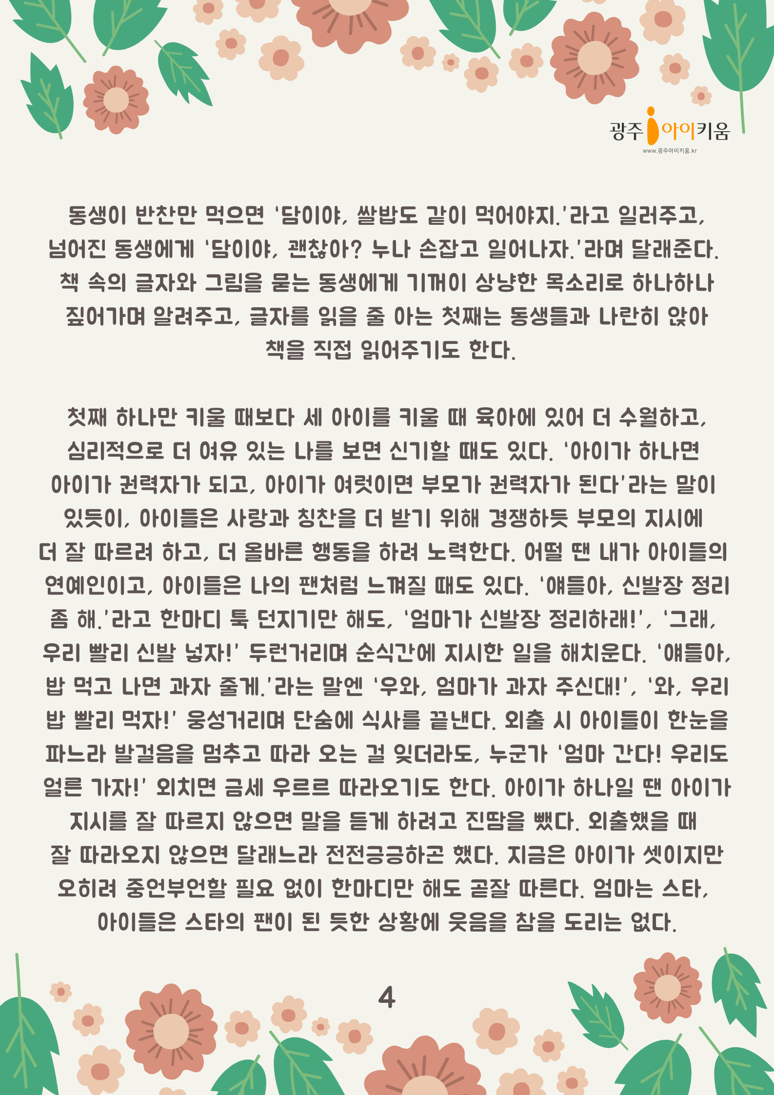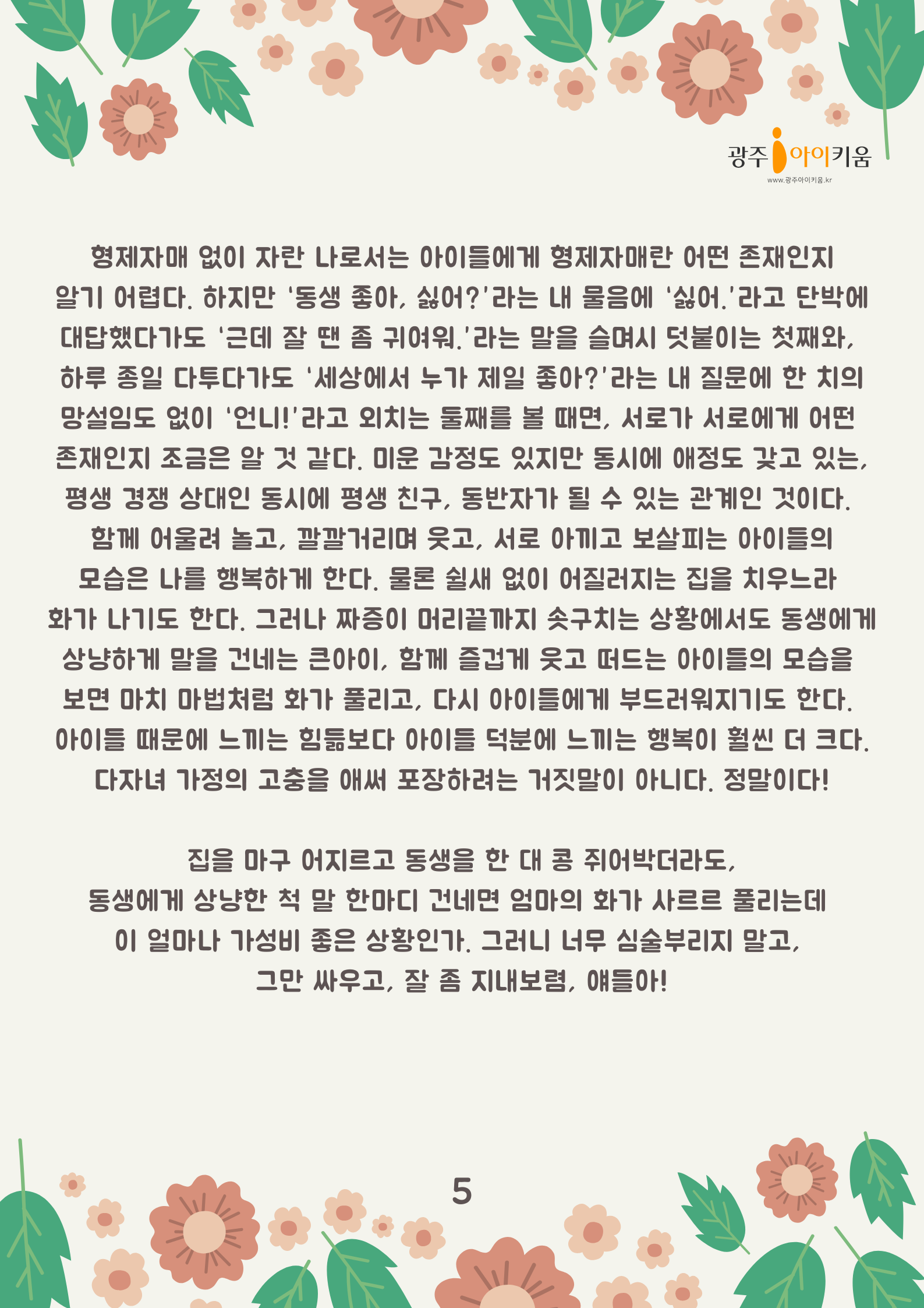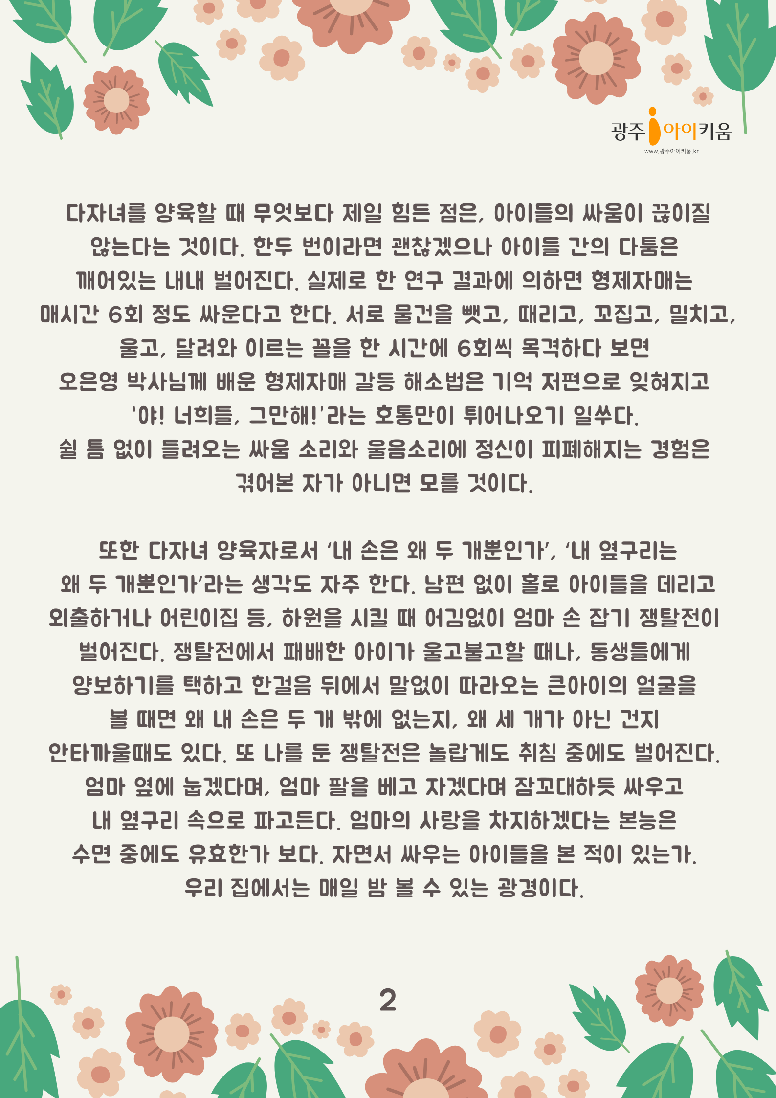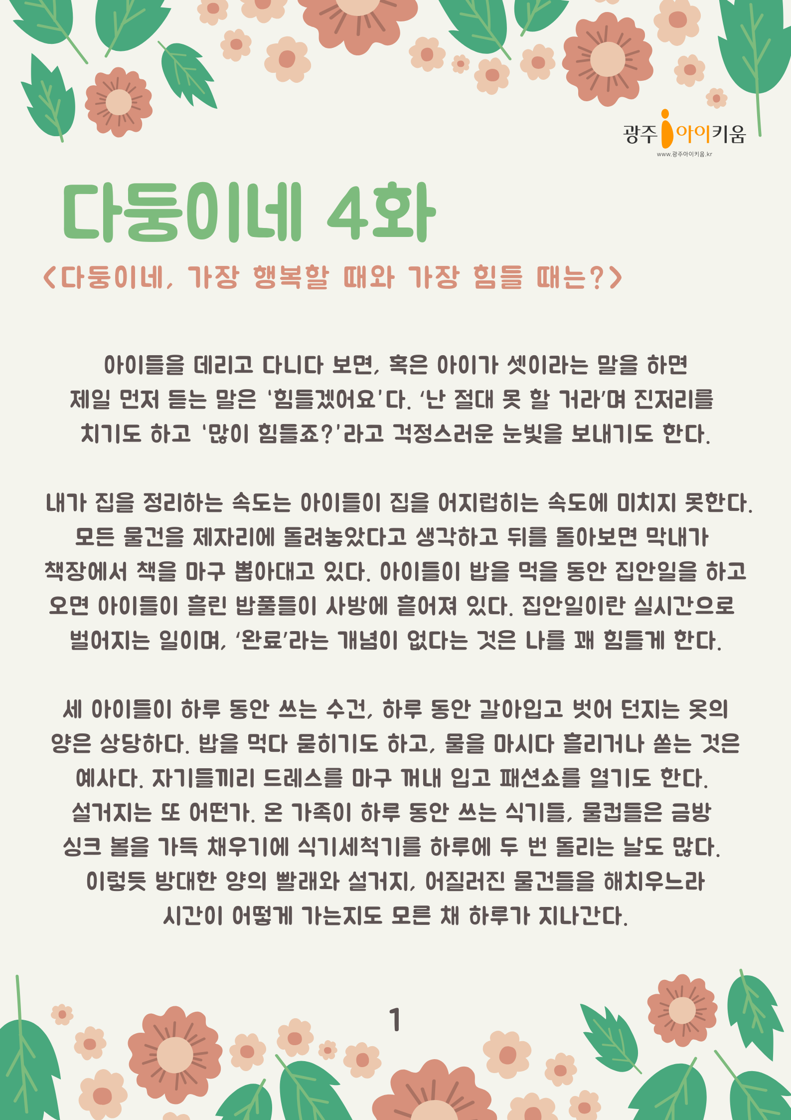 home 맘편한 내★일, 광주아이키움2.0 결혼·임신·출생 영유아 초·중·고 다양한 가족 일생활균형 커뮤니티 아동돌봄지원 소통방 나눔방 광주 아이키움 상담방 돌봄정보방 성폭력 피해 상담 및 사건지원 공지사항 이벤트소식 참여게시판 카드뉴스 동영상 아이키움 칼럼 성평등 육아웹툰 로고&캐릭터 [다자녀육아] 4화- 다둥이네, 가장 행복할 때와 가장 힘들 때는? 등록일 : 2023-04-06 15:58 카테고리 : 카테고리 없음 작성자 : 운영자 조회수 : 1518 목록