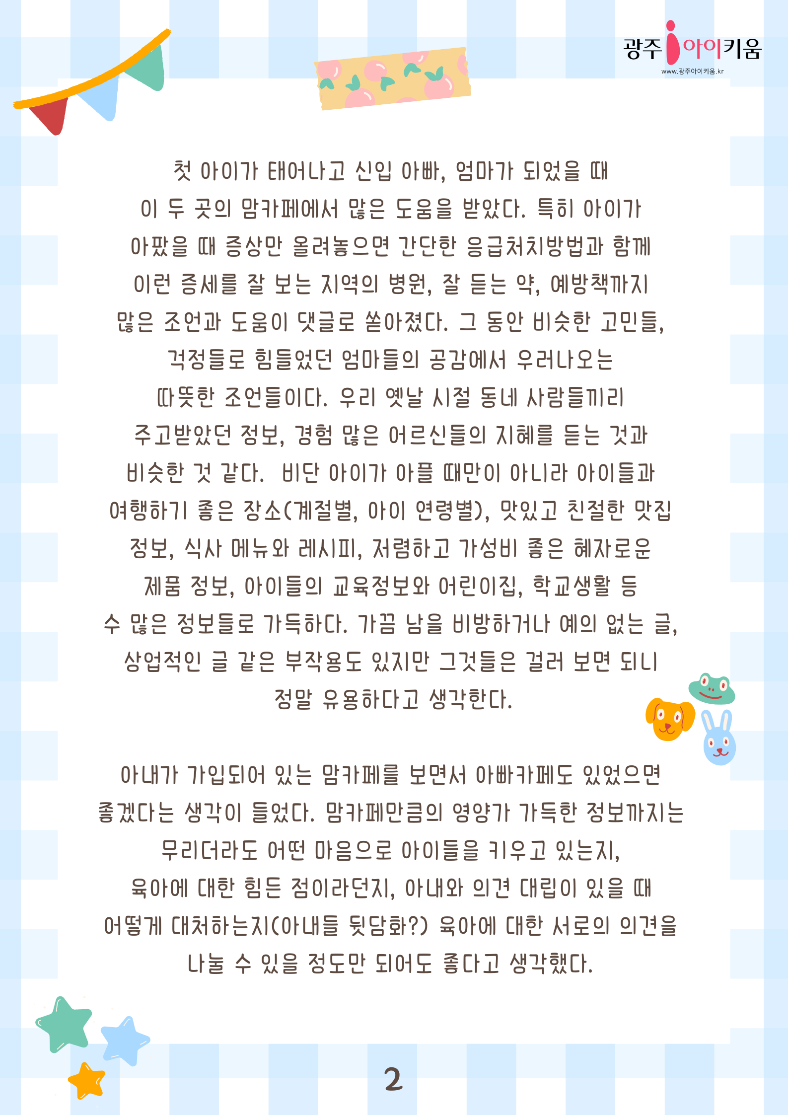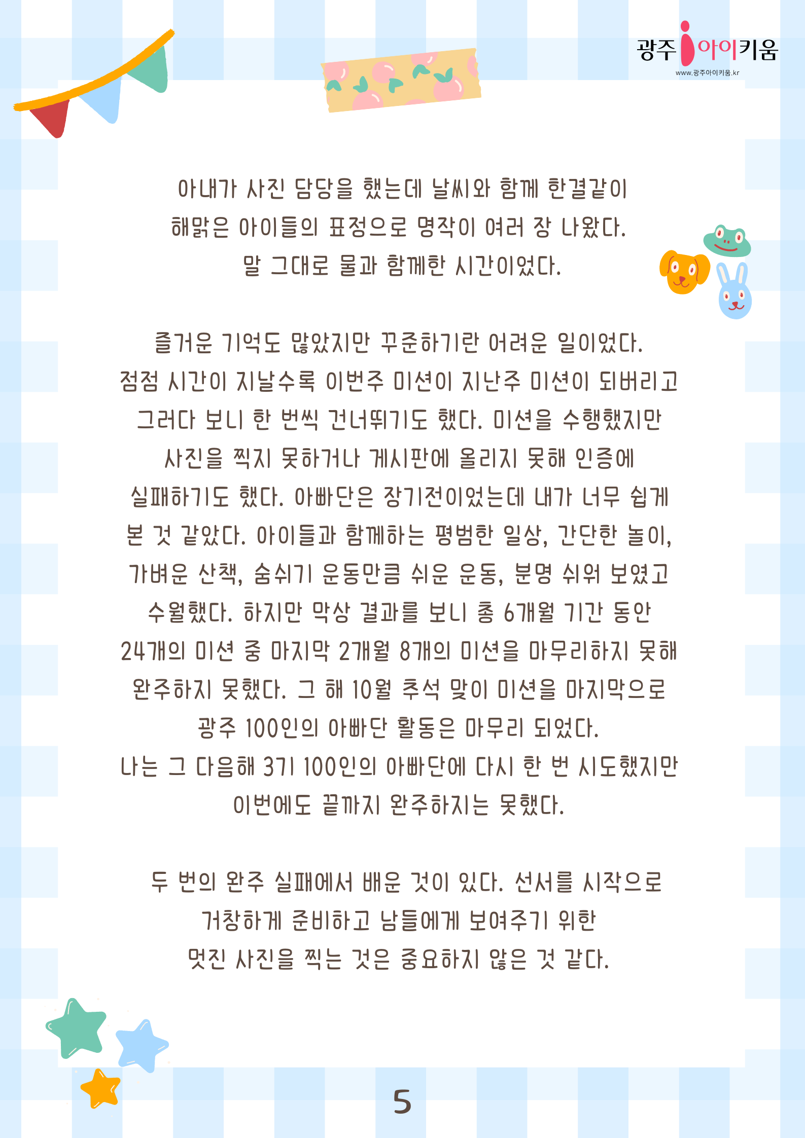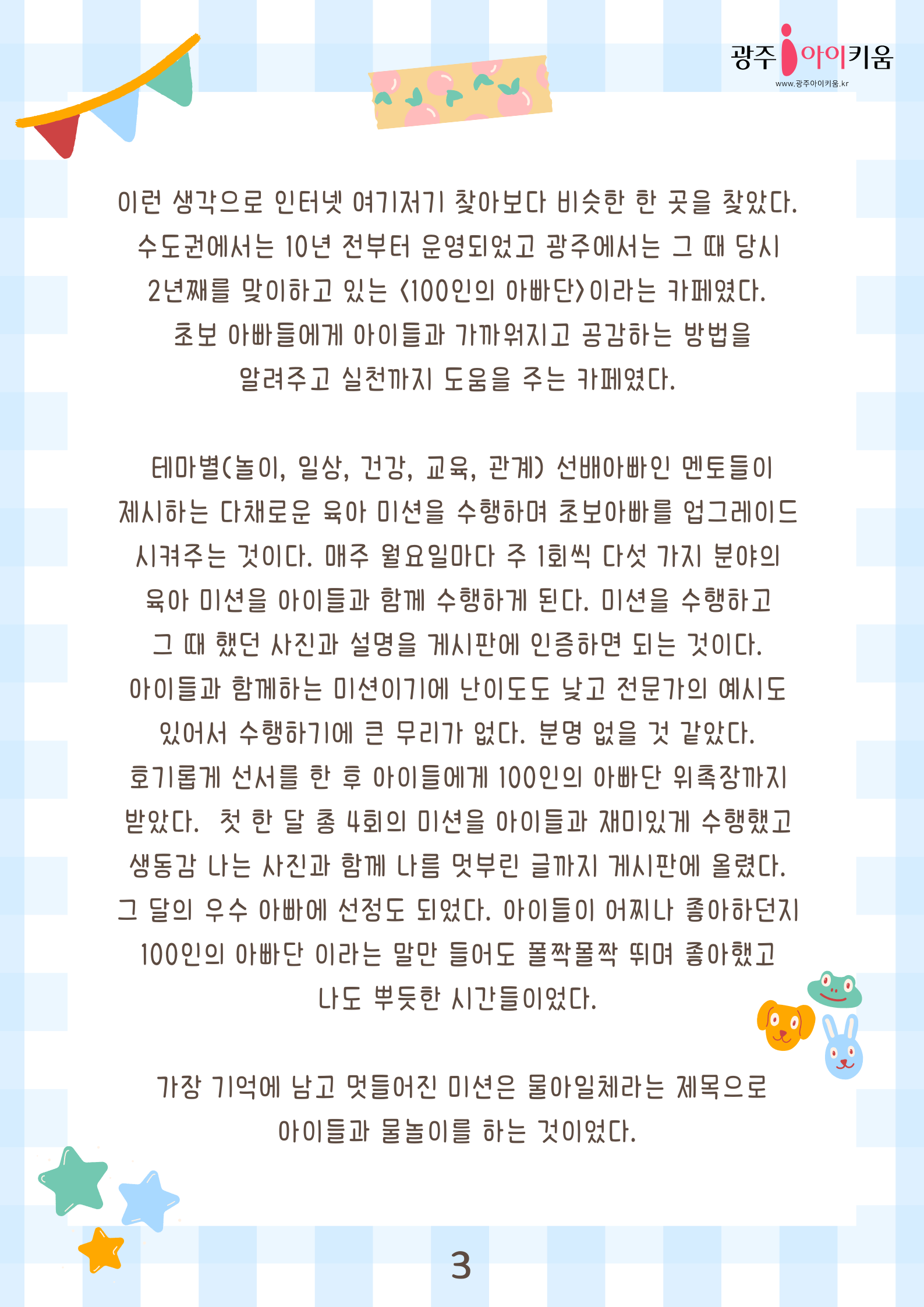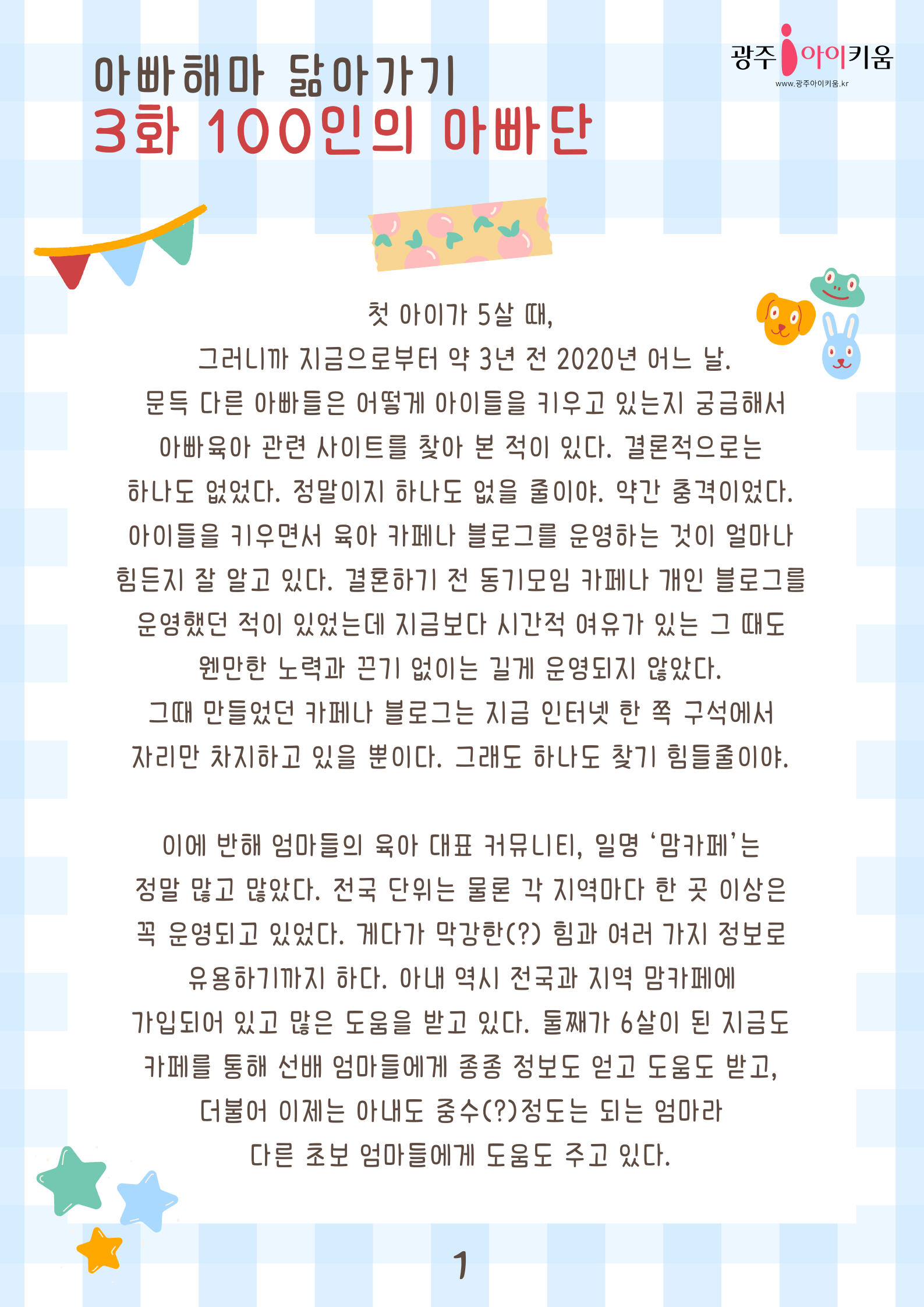 home 맘편한 내★일, 광주아이키움2.0 결혼·임신·출생 영유아 초·중·고 다양한 가족 일생활균형 커뮤니티 아동돌봄지원 소통방 나눔방 광주 아이키움 상담방 돌봄정보방 성폭력 피해 상담 및 사건지원 공지사항 이벤트소식 참여게시판 카드뉴스 동영상 아이키움 칼럼 성평등 육아웹툰 로고&캐릭터 [아빠육아] 3화- 100인의 아빠단 등록일 : 2023-04-14 10:04 카테고리 : 카테고리 없음 작성자 : 운영자 조회수 : 1580 목록