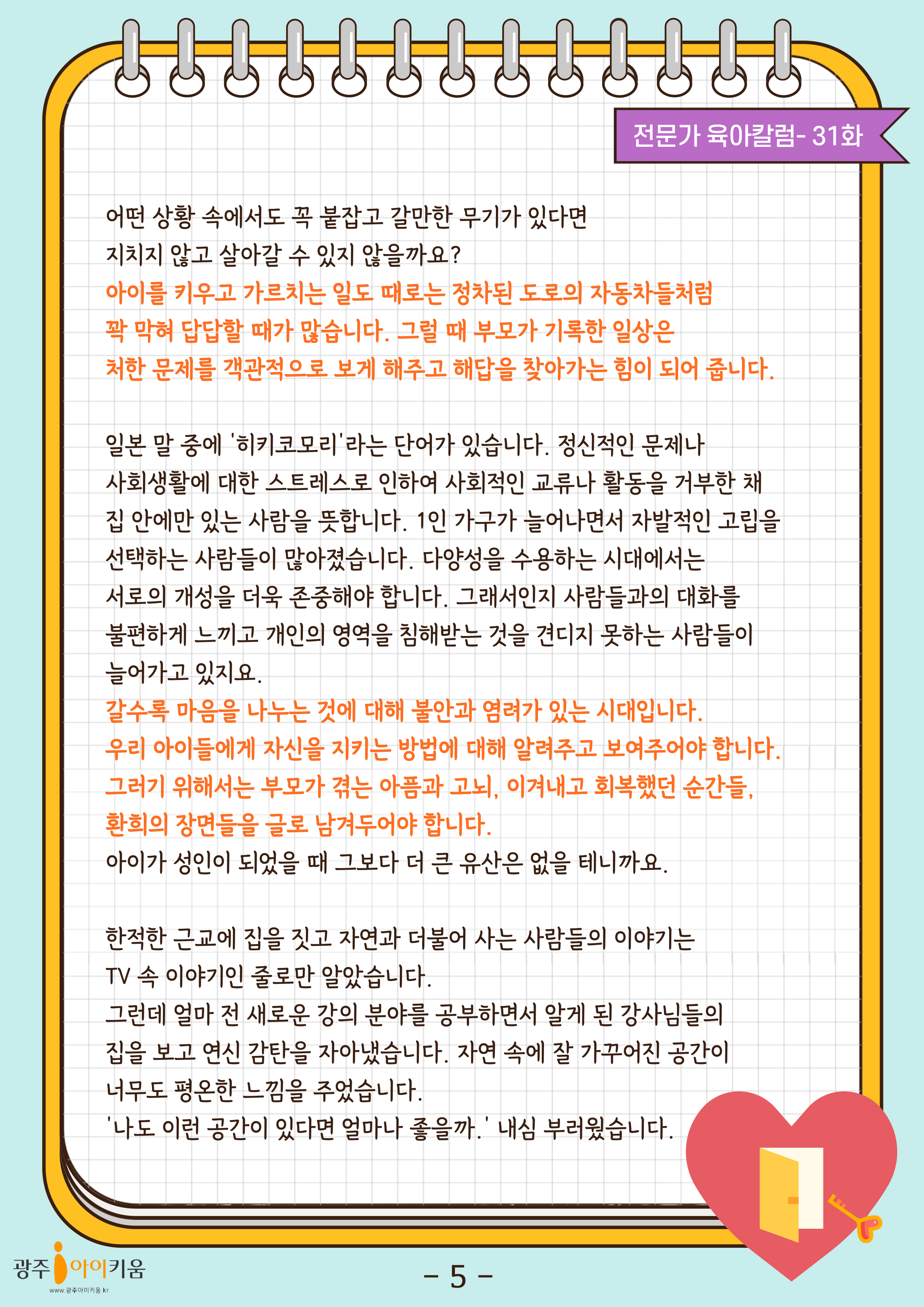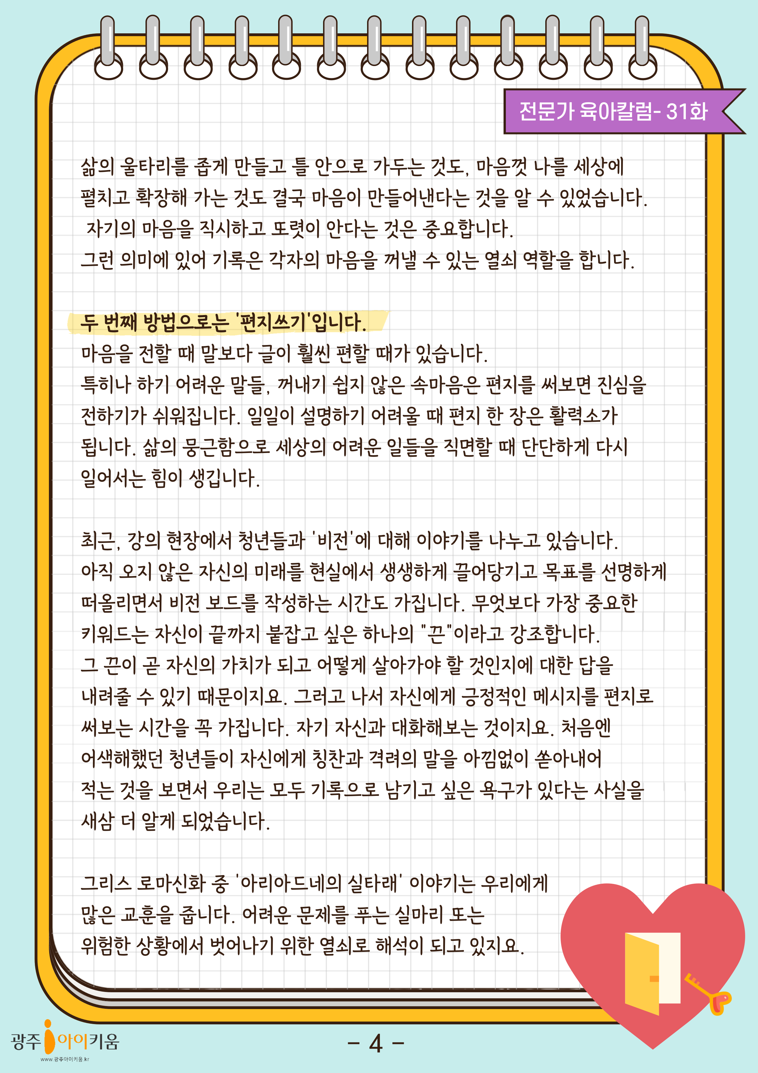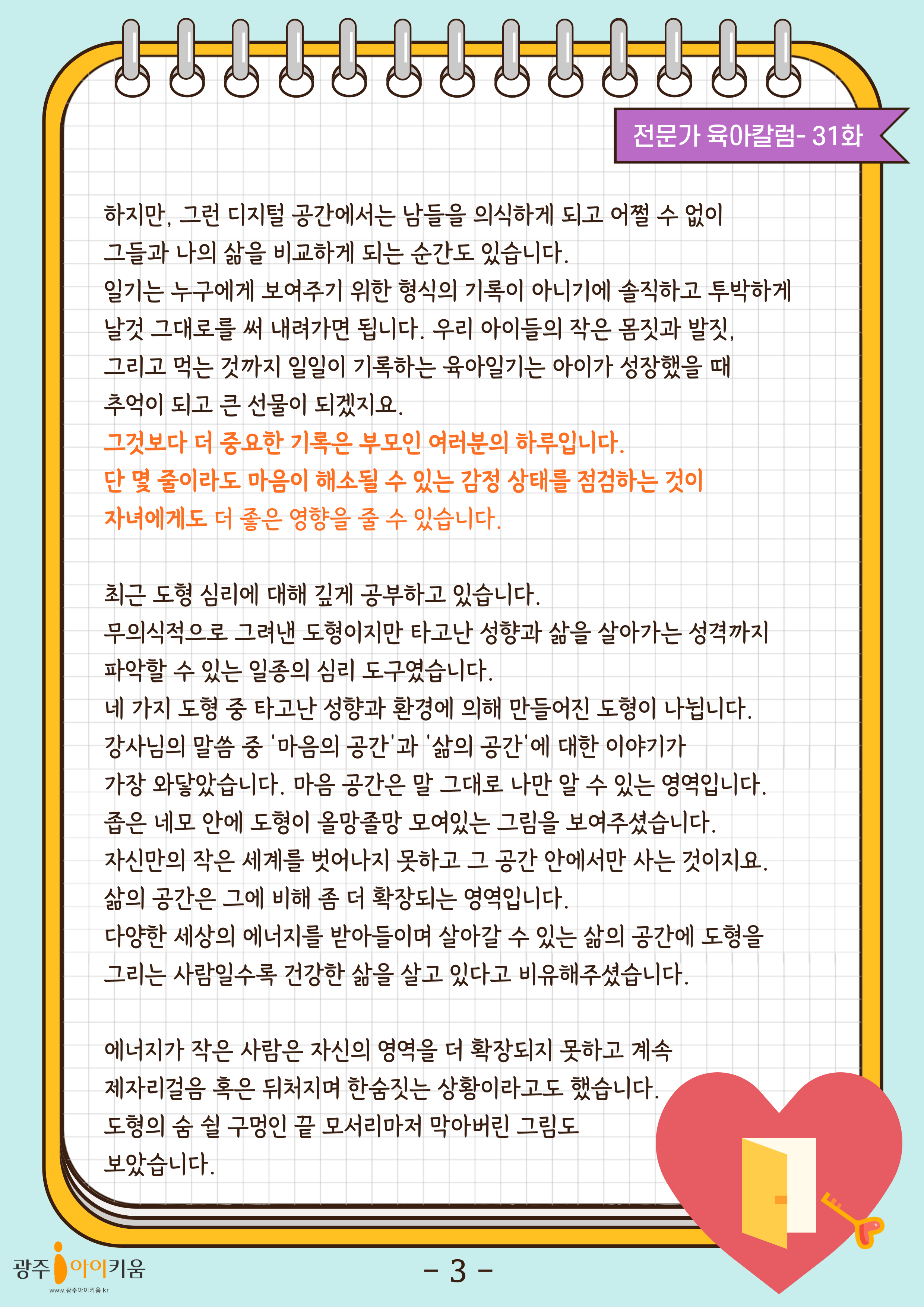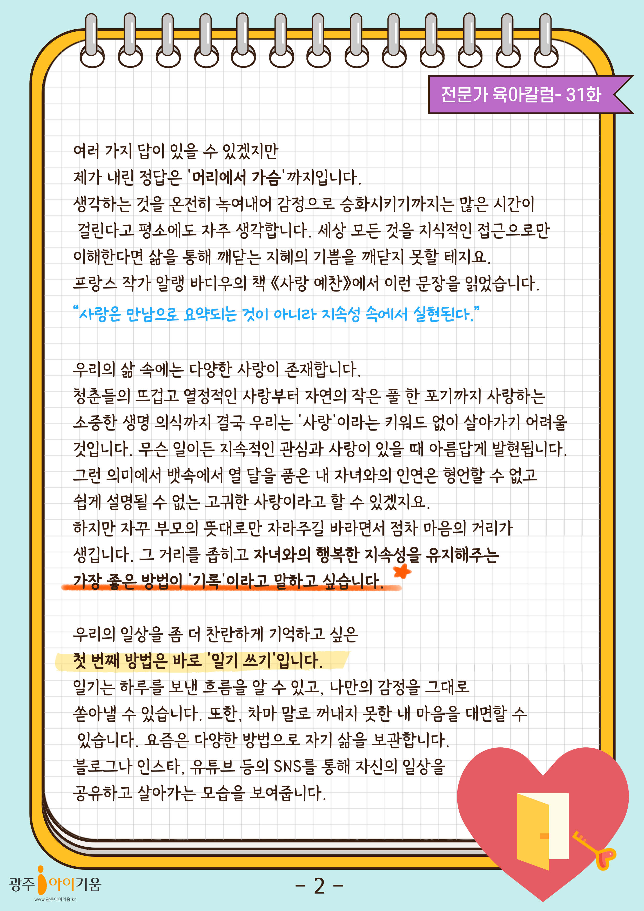 home 맘편한 내★일, 광주아이키움2.0 결혼·임신·출생 영유아 초·중·고 다양한 가족 일생활균형 커뮤니티 아동돌봄지원 소통방 나눔방 광주 아이키움 상담방 돌봄정보방 성폭력 피해 상담 및 사건지원 공지사항 이벤트소식 참여게시판 카드뉴스 동영상 아이키움 칼럼 성평등 육아웹툰 로고&캐릭터 31화 - 기록, 마음의 문을 여는 열쇠 등록일 : 2024-11-07 16:10 카테고리 : 카테고리 없음 작성자 : 운영자 조회수 : 444 목록