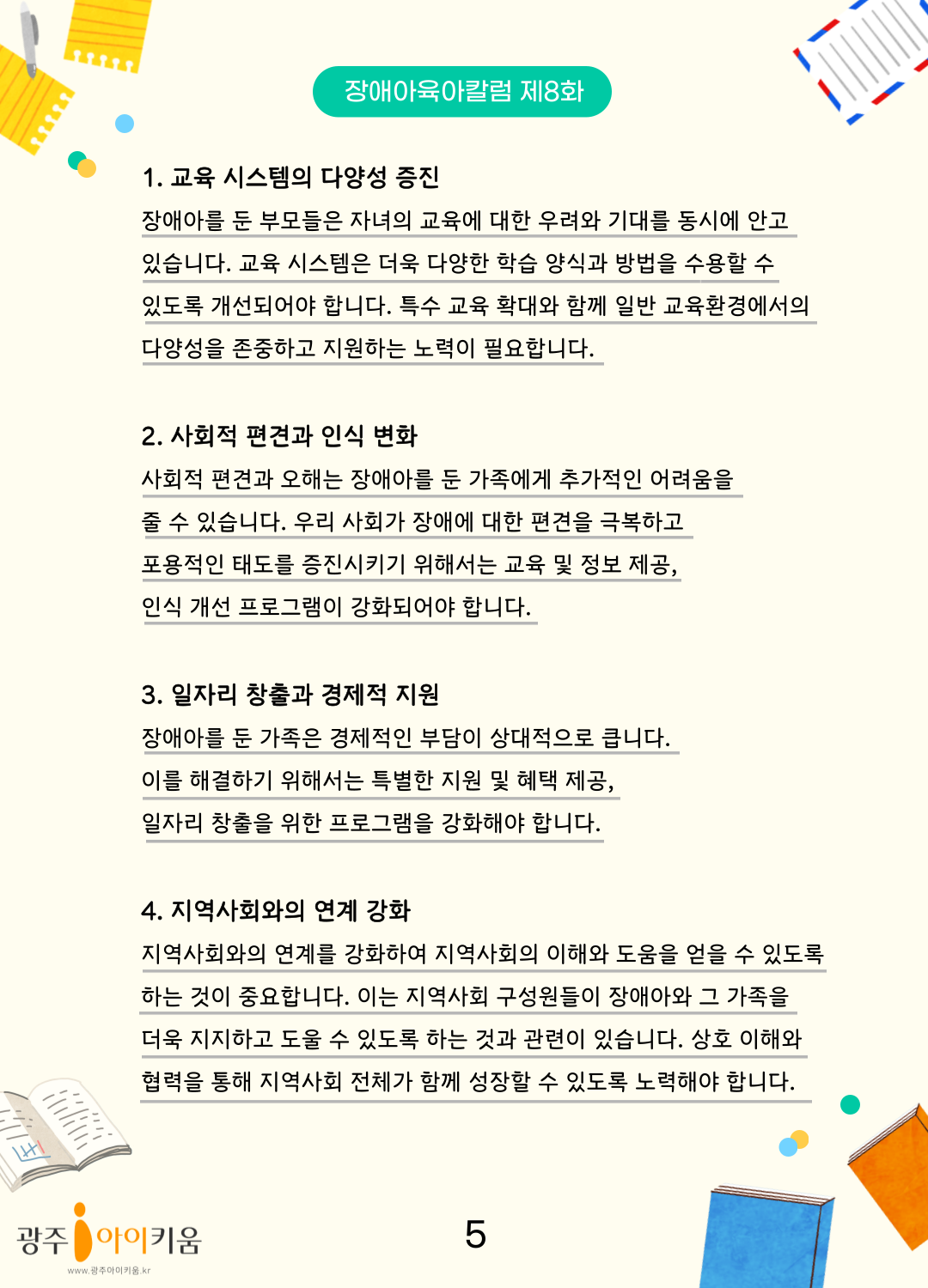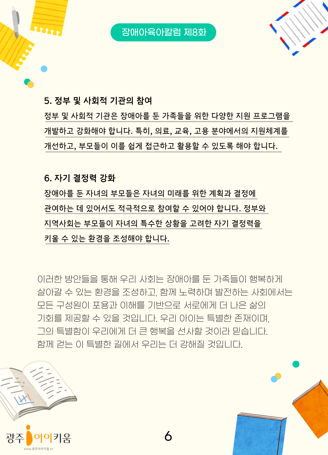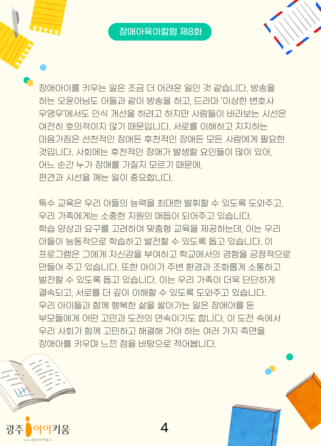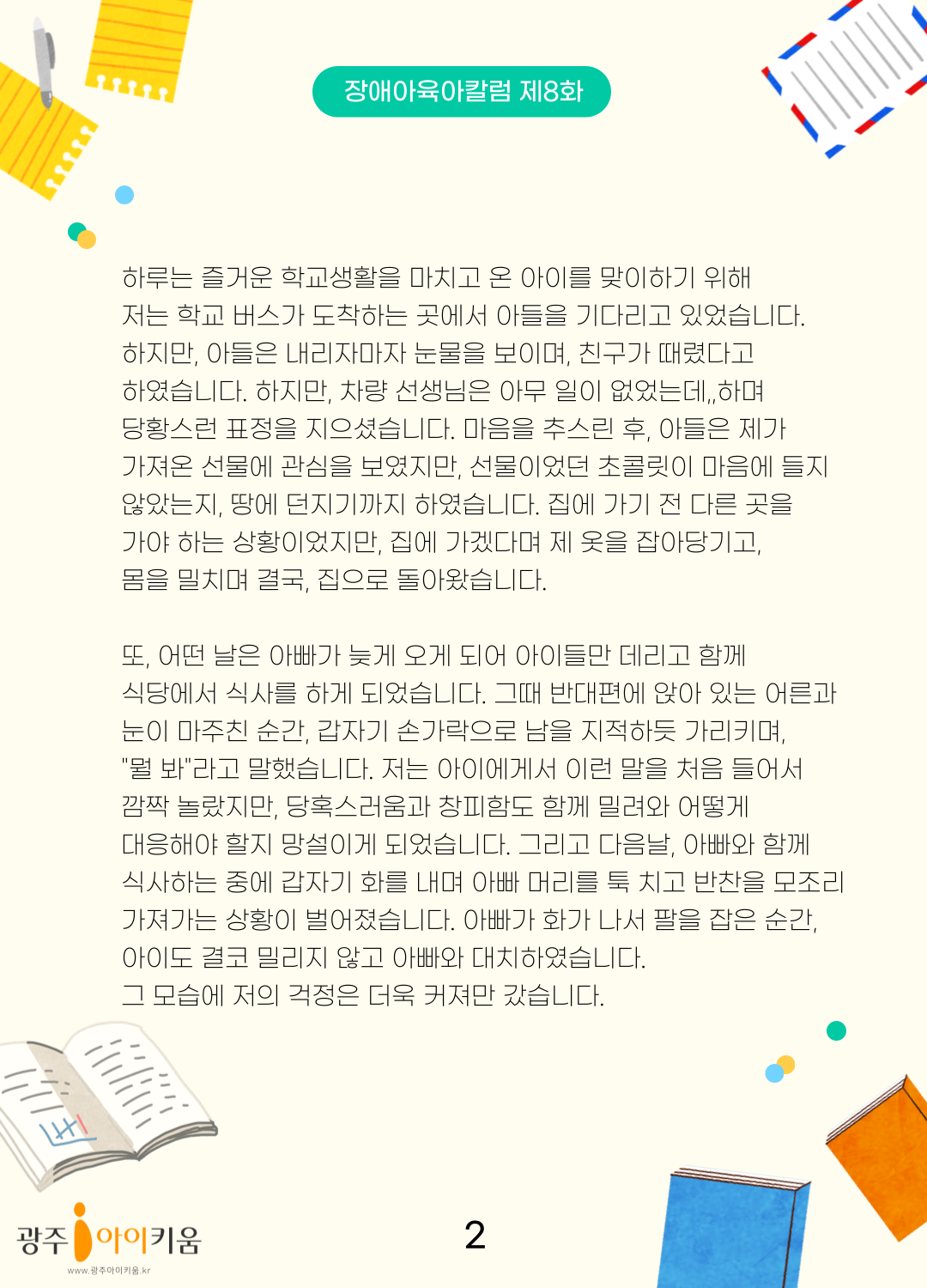 home 맘편한 내★일, 광주아이키움2.0 결혼·임신·출생 영유아 초·중·고 다양한 가족 일생활균형 커뮤니티 아동돌봄지원 소통방 나눔방 광주 아이키움 상담방 돌봄정보방 성폭력 피해 상담 및 사건지원 공지사항 이벤트소식 참여게시판 카드뉴스 동영상 아이키움 칼럼 성평등 육아웹툰 로고&캐릭터 [장애아 육아칼럼] 8화- 사춘기, 더 큰 행복을 향해 걷는 여정 등록일 : 2023-11-23 13:55 카테고리 : 카테고리 없음 작성자 : 운영자 조회수 : 1163 목록