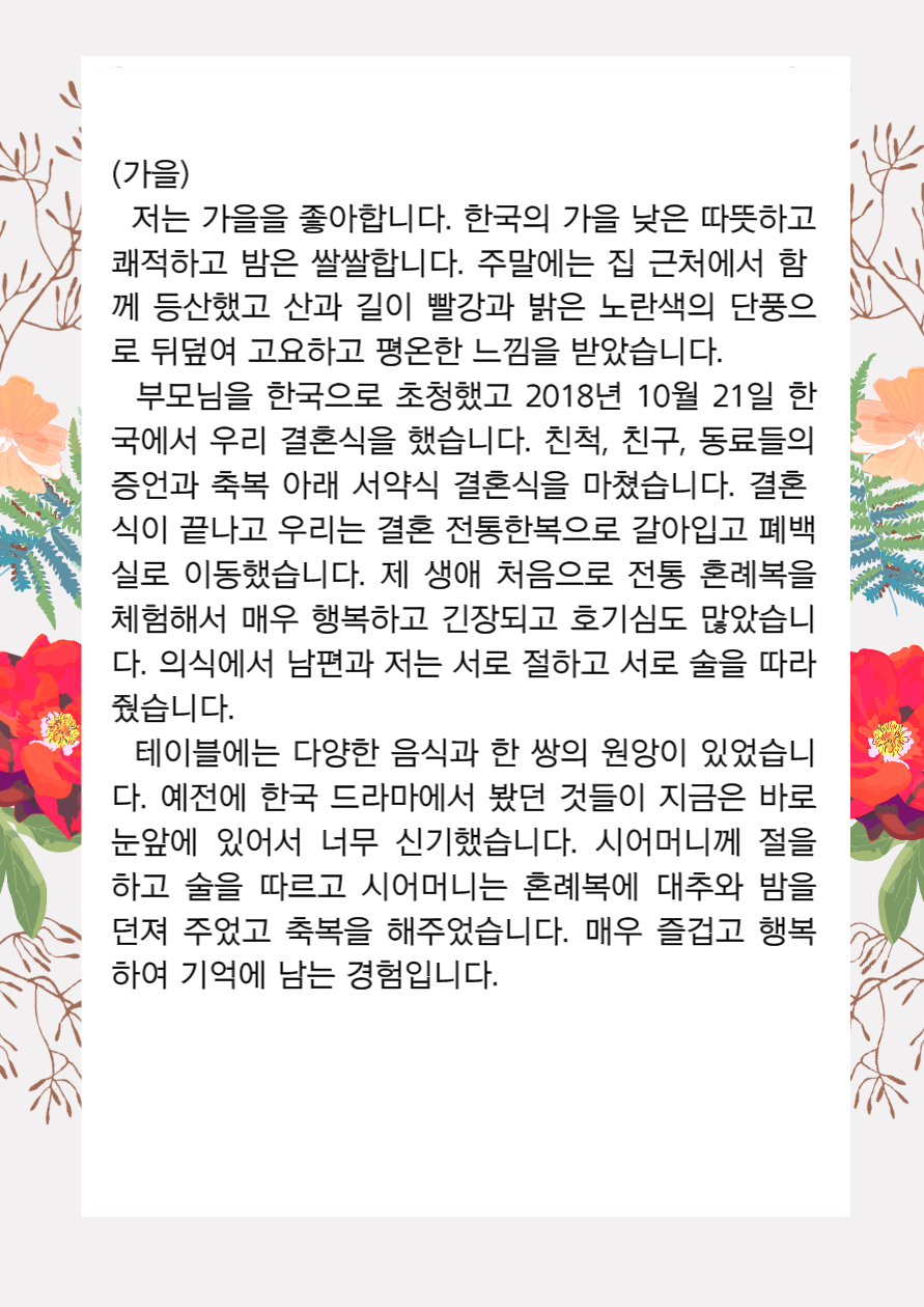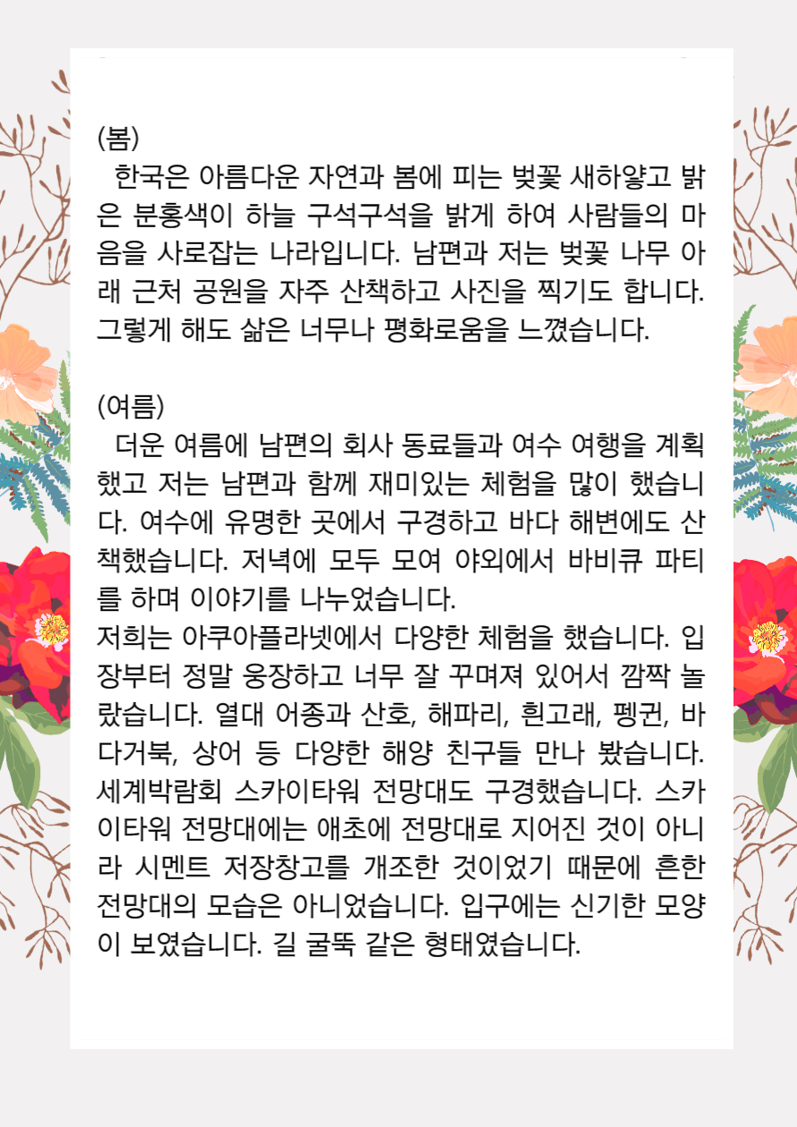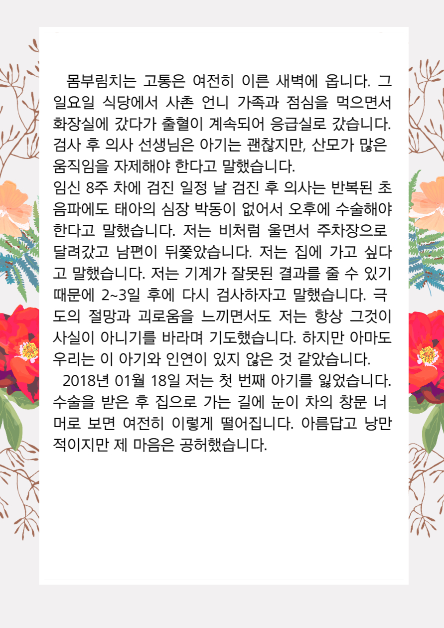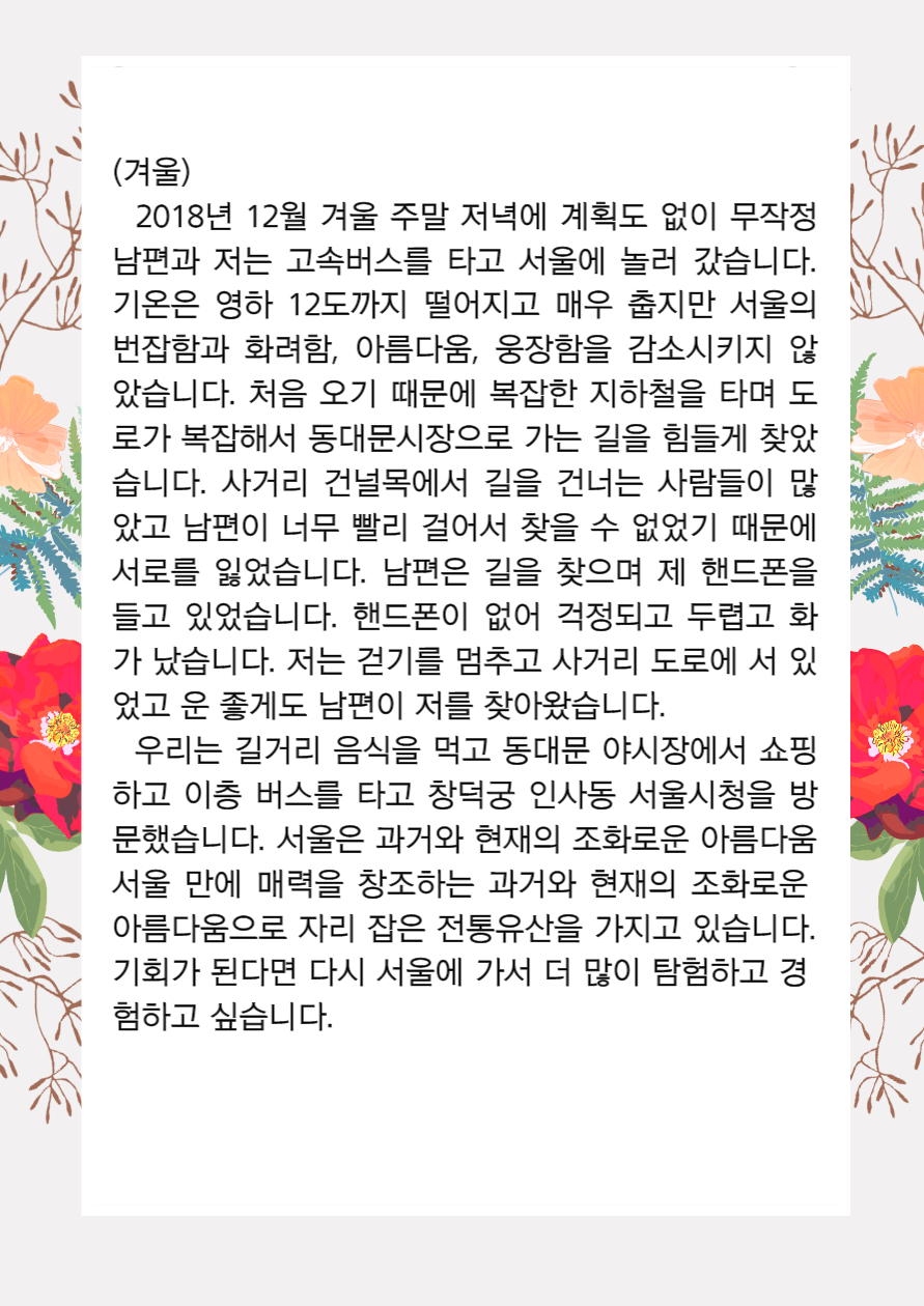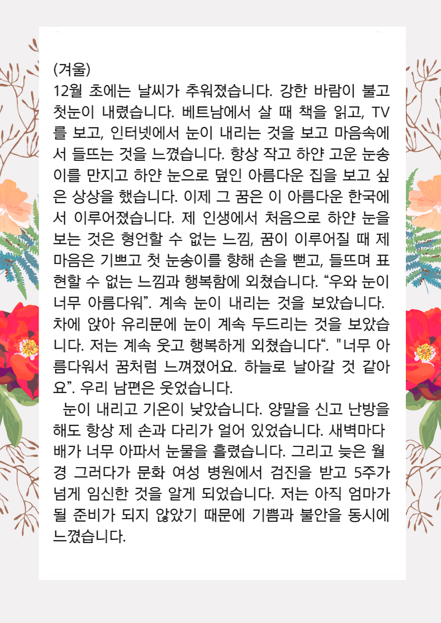 home 맘편한 내★일, 광주아이키움2.0 결혼·임신·출생 영유아 초·중·고 다양한 가족 일생활균형 커뮤니티 아동돌봄지원 소통방 나눔방 광주 아이키움 상담방 돌봄정보방 성폭력 피해 상담 및 사건지원 공지사항 이벤트소식 참여게시판 카드뉴스 동영상 아이키움 칼럼 성평등 육아웹툰 로고&캐릭터 쩐티항's 한국살이 2편 나의 한국에서의 사계절 등록일 : 2021-10-05 11:14 카테고리 : 카테고리 없음 작성자 : 운영자 조회수 : 1501 목록