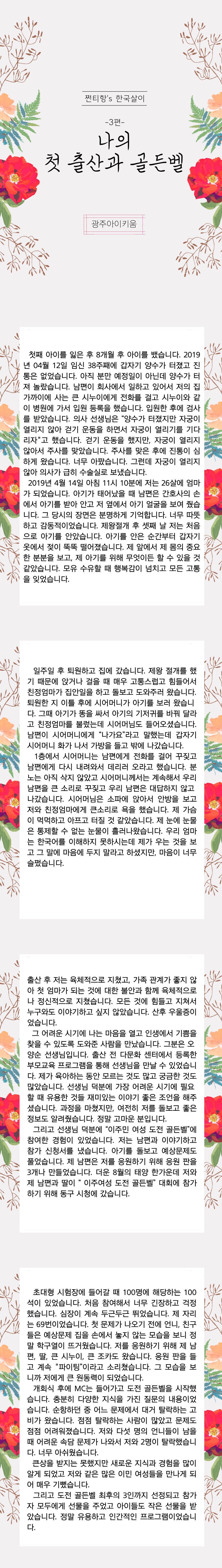 home 맘편한 내★일, 광주아이키움2.0 결혼·임신·출생 영유아 초·중·고 다양한 가족 일생활균형 커뮤니티 아동돌봄지원 소통방 나눔방 광주 아이키움 상담방 돌봄정보방 성폭력 피해 상담 및 사건지원 공지사항 이벤트소식 참여게시판 카드뉴스 동영상 아이키움 칼럼 성평등 육아웹툰 로고&캐릭터 쩐티항's 한국살이 3편 나의 첫 출산과 골든벨 등록일 : 2021-10-05 11:27 카테고리 : 카테고리 없음 작성자 : 운영자 조회수 : 1475 목록