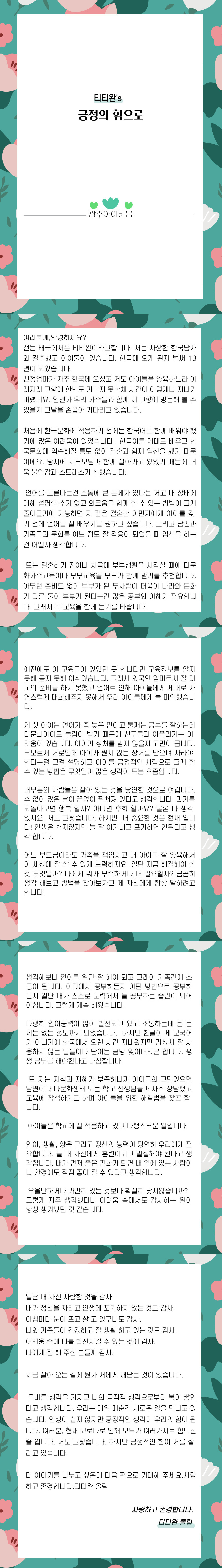 home 맘편한 내★일, 광주아이키움2.0 결혼·임신·출생 영유아 초·중·고 다양한 가족 일생활균형 커뮤니티 아동돌봄지원 소통방 나눔방 광주 아이키움 상담방 돌봄정보방 성폭력 피해 상담 및 사건지원 공지사항 이벤트소식 참여게시판 카드뉴스 동영상 아이키움 칼럼 성평등 육아웹툰 로고&캐릭터 티티완's 긍정의 힘으로 등록일 : 2021-09-02 18:53 카테고리 : 카테고리 없음 작성자 : 운영자 조회수 : 1593 목록