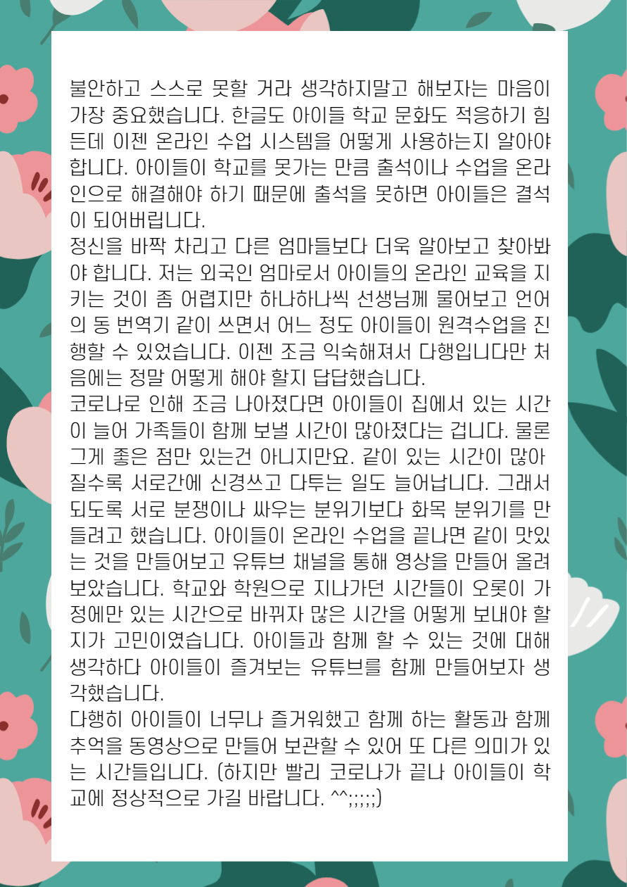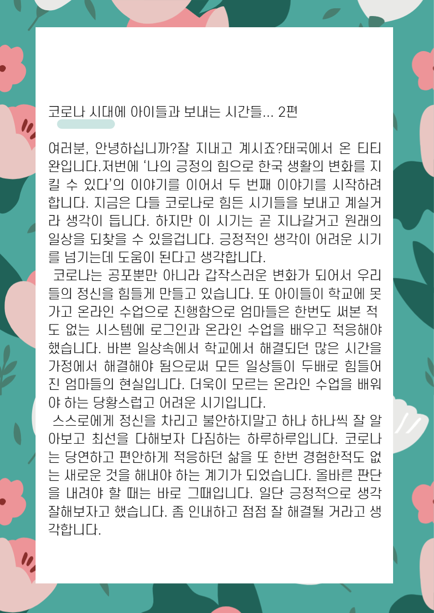 home 맘편한 내★일, 광주아이키움2.0 결혼·임신·출생 영유아 초·중·고 다양한 가족 일생활균형 커뮤니티 아동돌봄지원 소통방 나눔방 광주 아이키움 상담방 돌봄정보방 성폭력 피해 상담 및 사건지원 공지사항 이벤트소식 참여게시판 카드뉴스 동영상 아이키움 칼럼 성평등 육아웹툰 로고&캐릭터 티티완's 긍정의 힘으로(2) 등록일 : 2021-09-09 18:36 카테고리 : 카테고리 없음 작성자 : 운영자 조회수 : 1587 목록