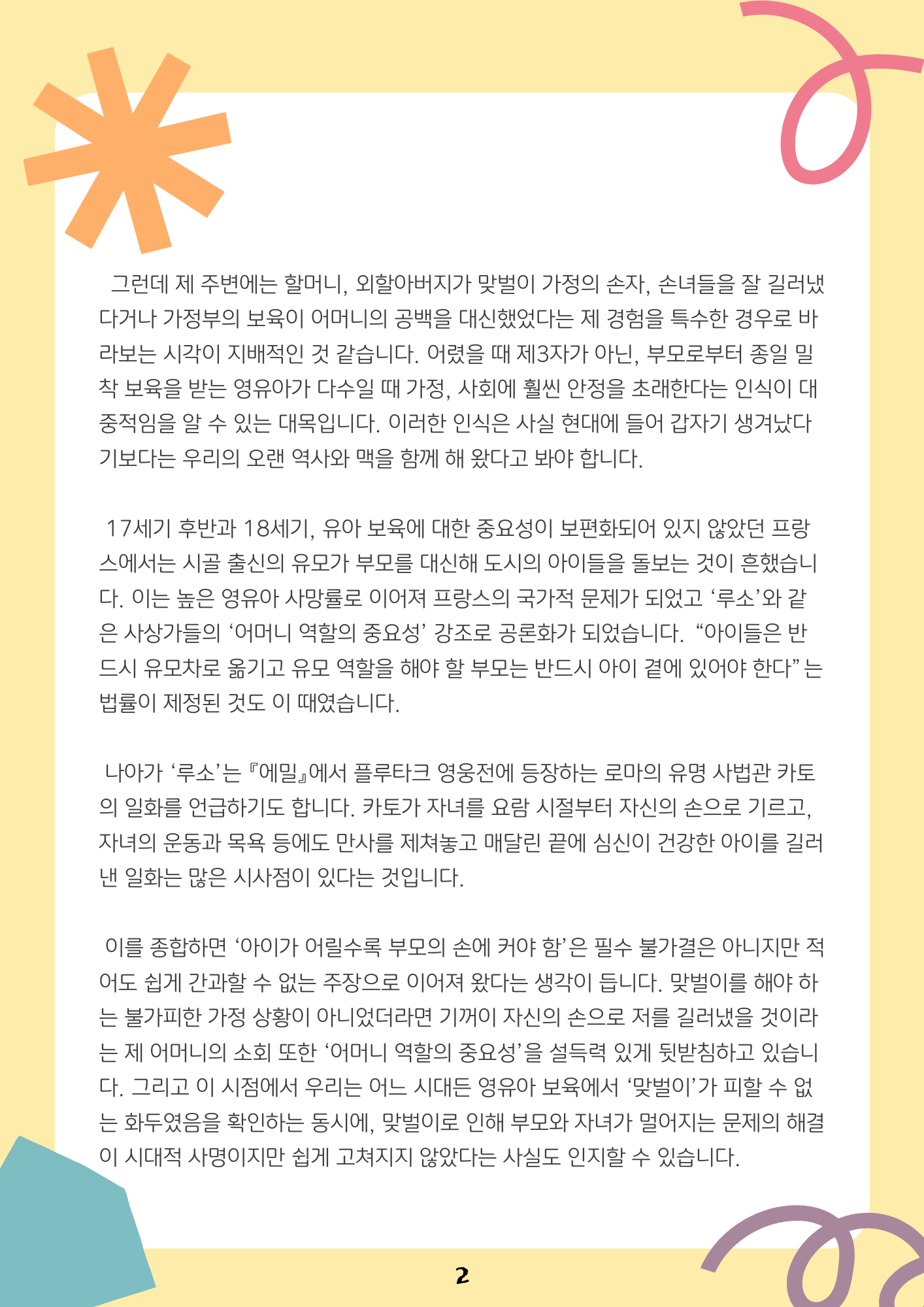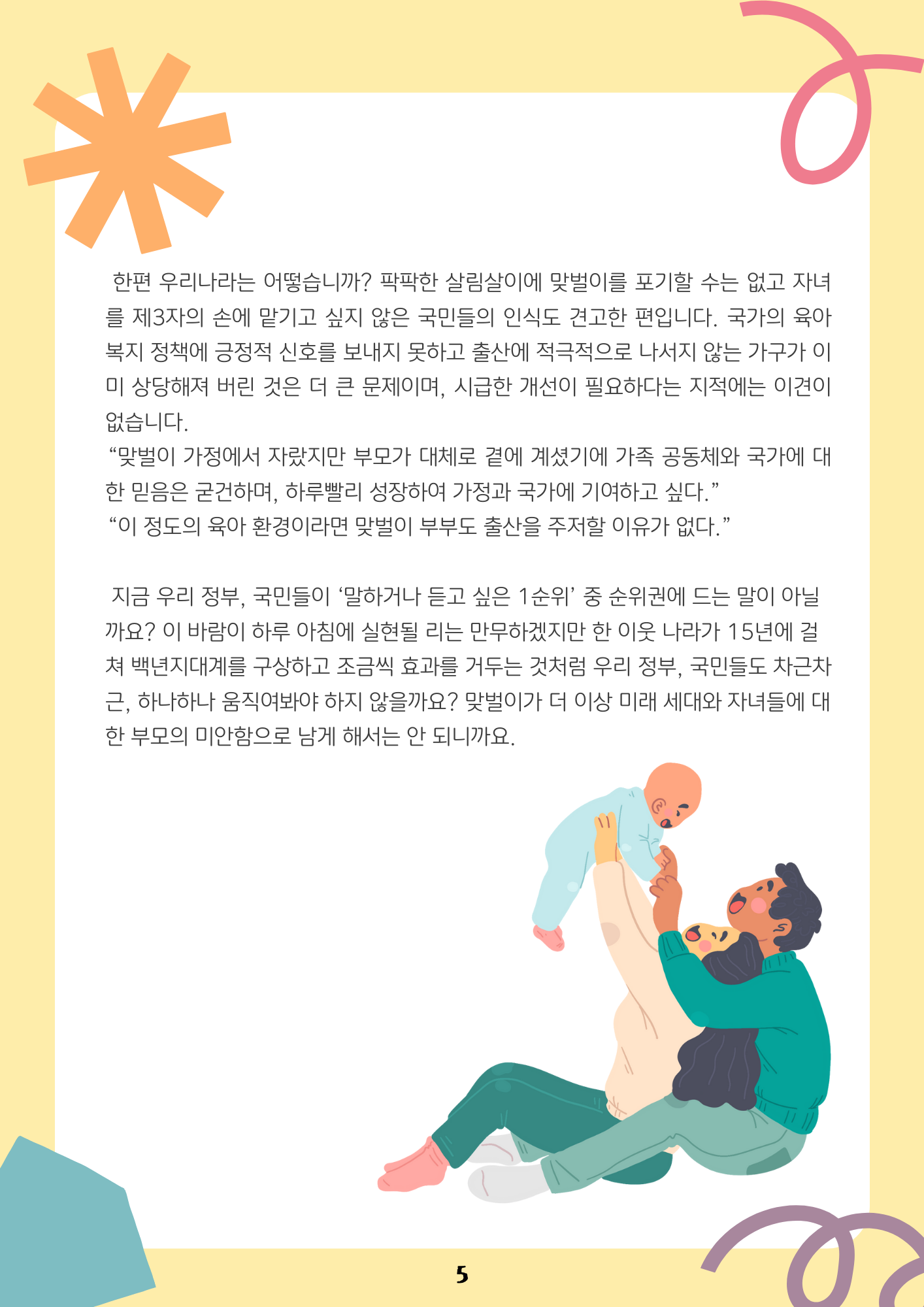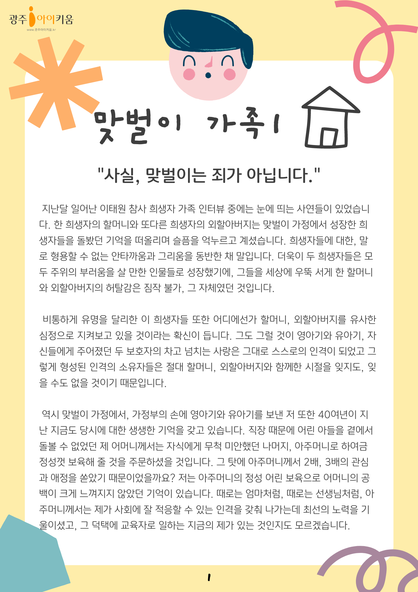 home 맘편한 내★일, 광주아이키움2.0 결혼·임신·출생 영유아 초·중·고 다양한 가족 일생활균형 커뮤니티 아동돌봄지원 소통방 나눔방 광주 아이키움 상담방 돌봄정보방 성폭력 피해 상담 및 사건지원 공지사항 이벤트소식 참여게시판 카드뉴스 동영상 아이키움 칼럼 성평등 육아웹툰 로고&캐릭터 맞벌이가족- "사실, 맞벌이는 죄가 아닙니다." 등록일 : 2022-12-06 09:26 카테고리 : 카테고리 없음 작성자 : 운영자 조회수 : 1145 목록