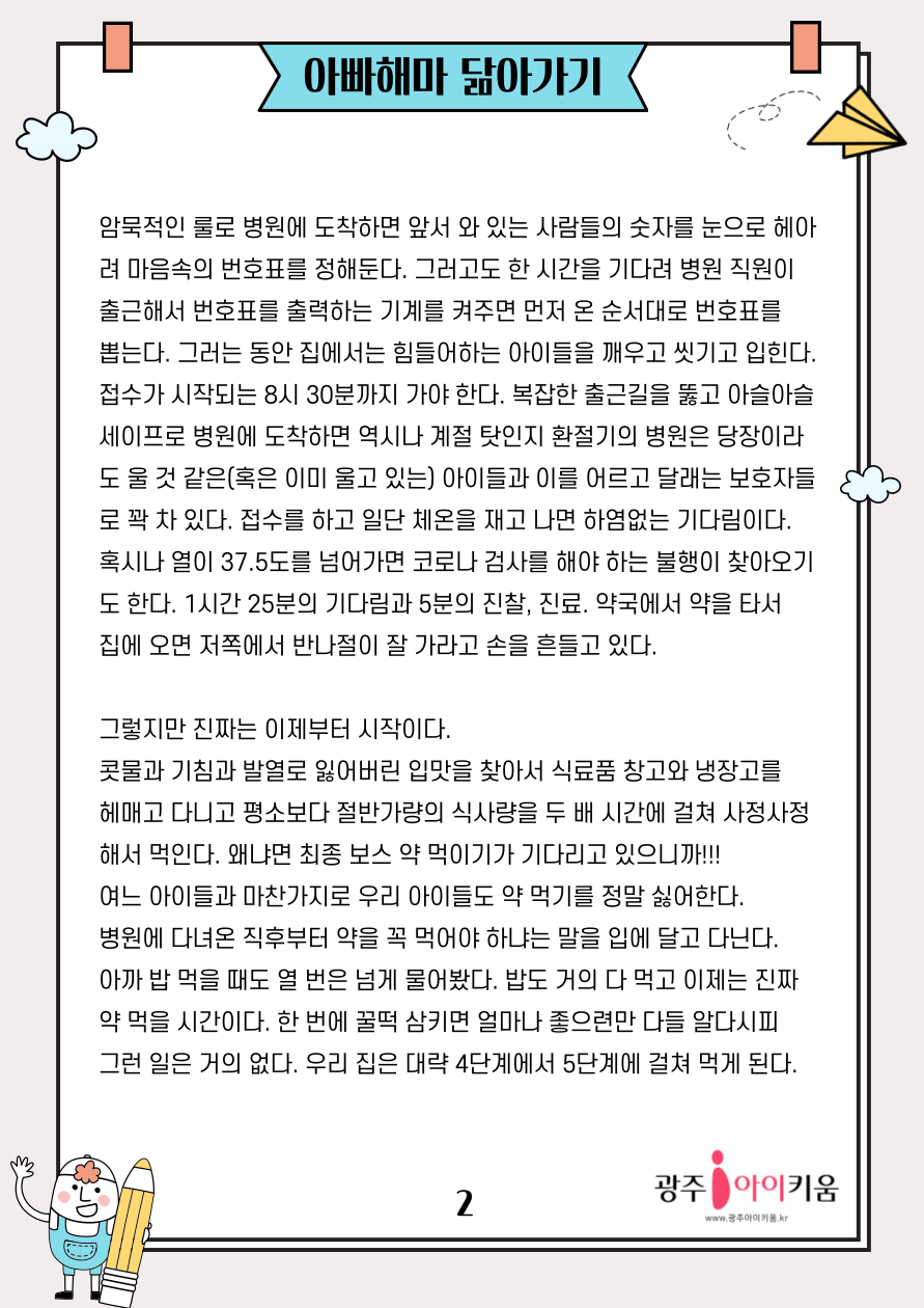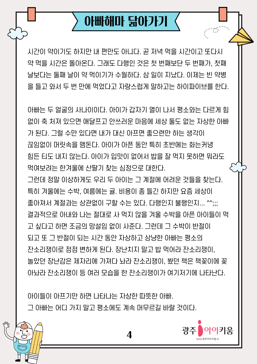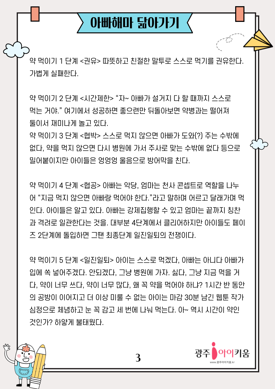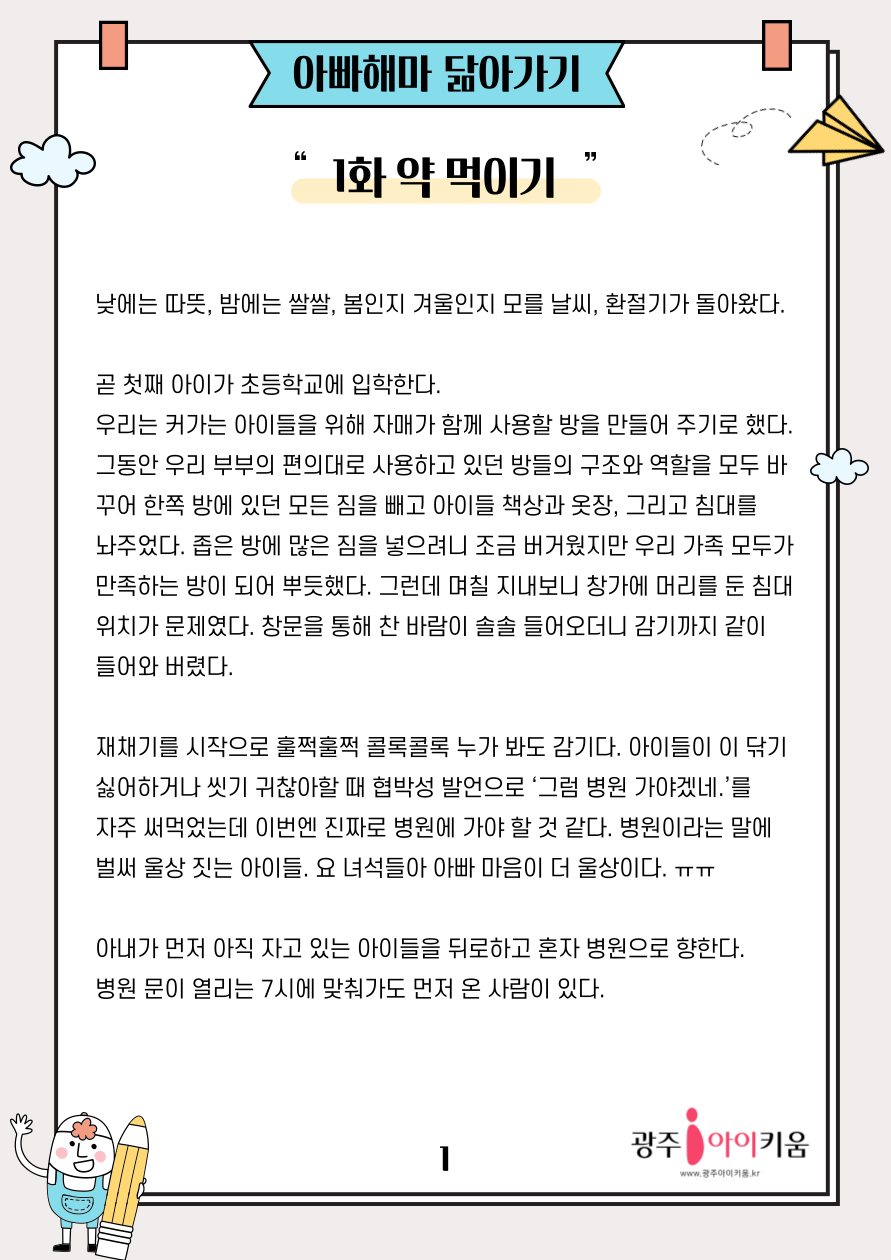 home 맘편한 내★일, 광주아이키움2.0 결혼·임신·출생 영유아 초·중·고 다양한 가족 일생활균형 커뮤니티 아동돌봄지원 소통방 나눔방 광주 아이키움 상담방 돌봄정보방 성폭력 피해 상담 및 사건지원 공지사항 이벤트소식 참여게시판 카드뉴스 동영상 아이키움 칼럼 성평등 육아웹툰 로고&캐릭터 [아빠육아] 1화- 약 먹이기 등록일 : 2023-03-17 10:12 카테고리 : 카테고리 없음 작성자 : 운영자 조회수 : 1590 목록