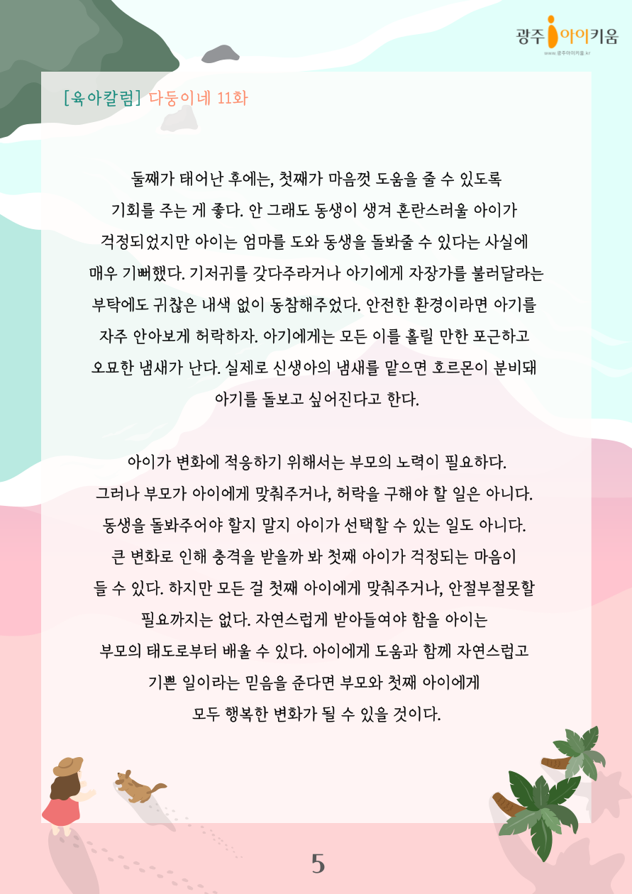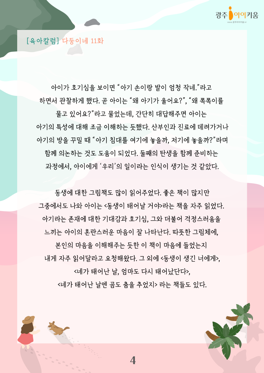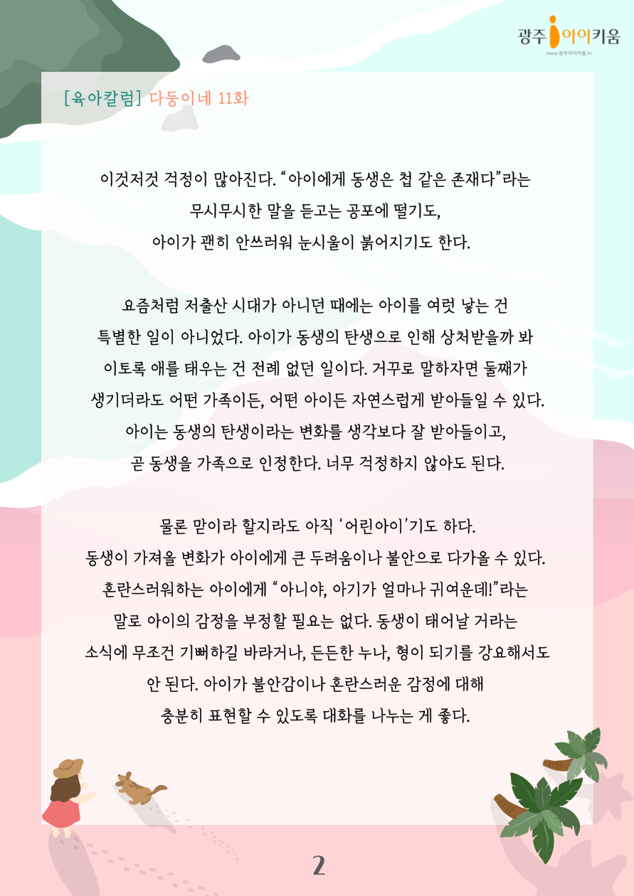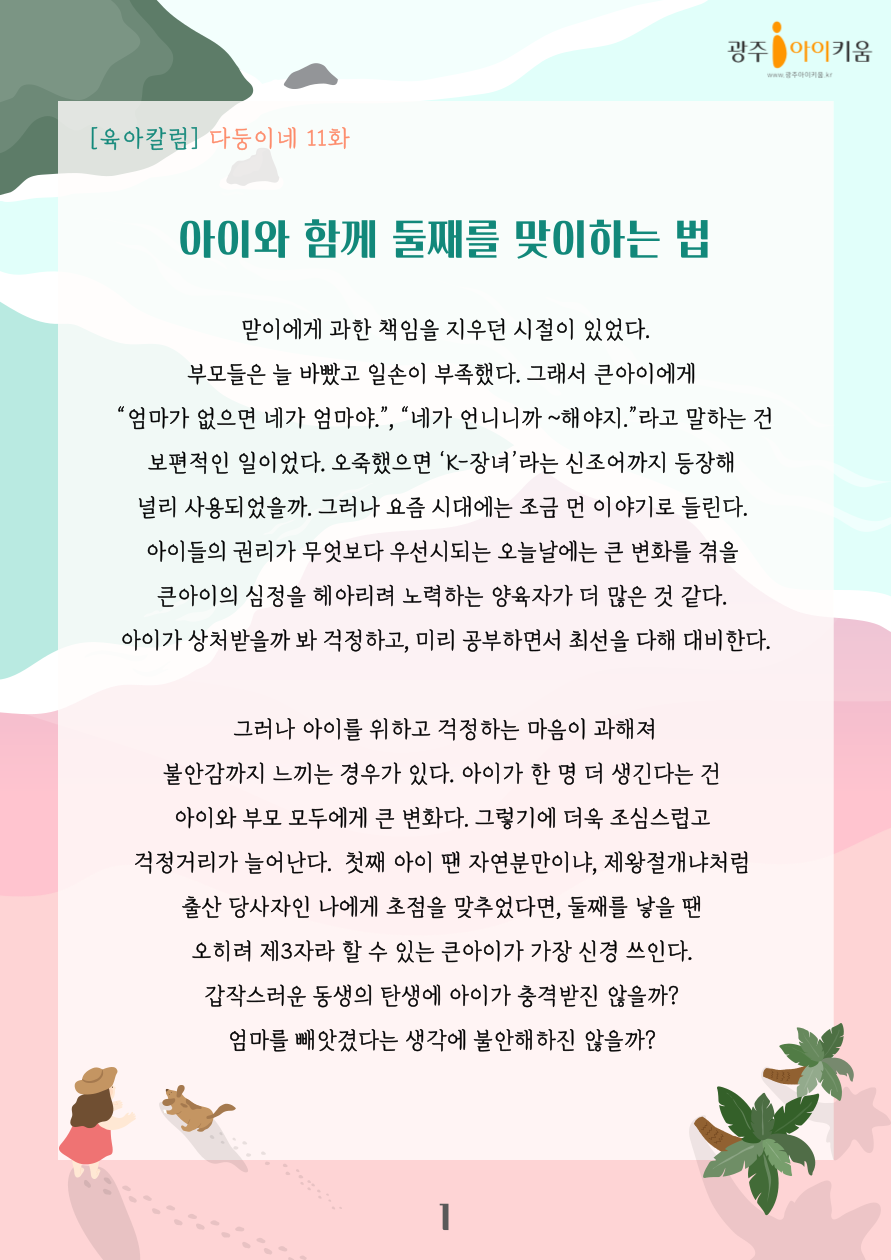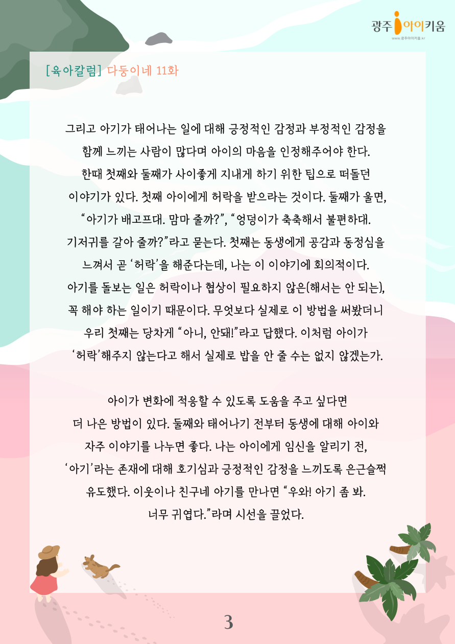 home 맘편한 내★일, 광주아이키움2.0 결혼·임신·출생 영유아 초·중·고 다양한 가족 일생활균형 커뮤니티 아동돌봄지원 소통방 나눔방 광주 아이키움 상담방 돌봄정보방 성폭력 피해 상담 및 사건지원 공지사항 이벤트소식 참여게시판 카드뉴스 동영상 아이키움 칼럼 성평등 육아웹툰 로고&캐릭터 [다자녀칼럼] 11화- 아이와 함께 둘째를 맞이하는 법 등록일 : 2023-07-21 08:40 카테고리 : 카테고리 없음 작성자 : 운영자 조회수 : 1101 목록