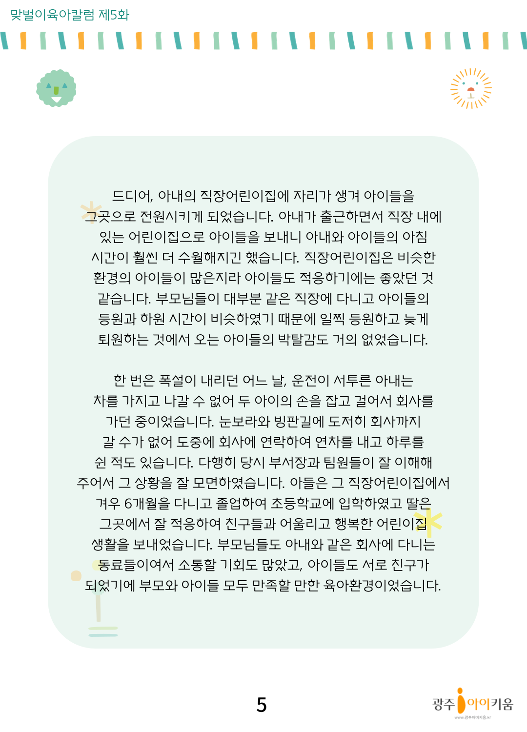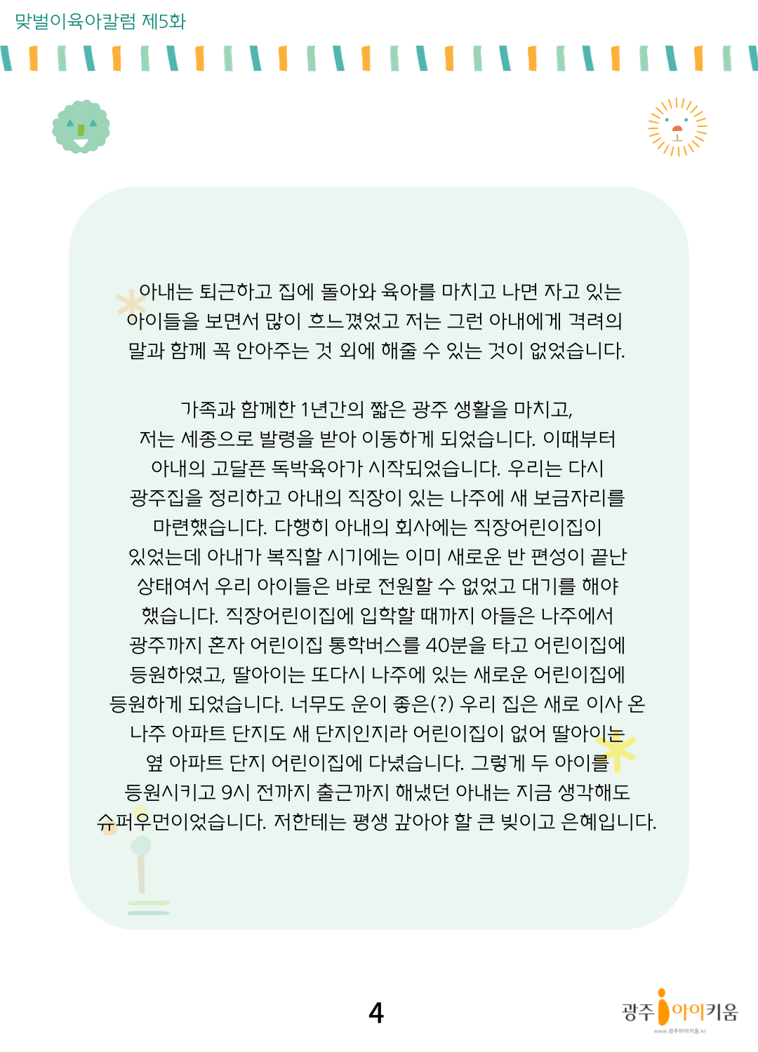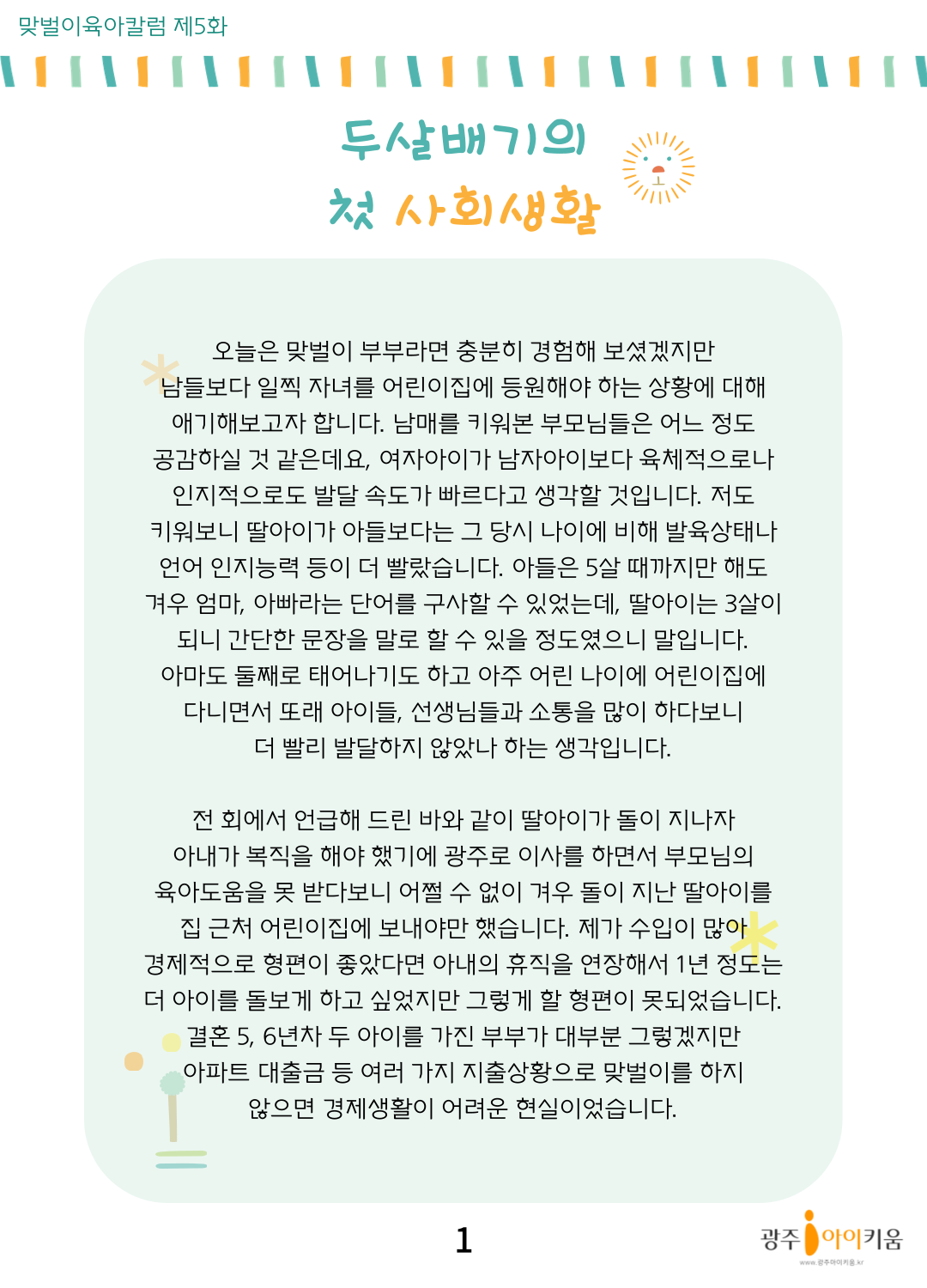 home 맘편한 내★일, 광주아이키움2.0 결혼·임신·출생 영유아 초·중·고 다양한 가족 일생활균형 커뮤니티 아동돌봄지원 소통방 나눔방 광주 아이키움 상담방 돌봄정보방 성폭력 피해 상담 및 사건지원 공지사항 이벤트소식 참여게시판 카드뉴스 동영상 아이키움 칼럼 성평등 육아웹툰 로고&캐릭터 [맞벌이육아칼럼] 5화- 두살배기의 첫 사회생활 등록일 : 2023-10-06 09:15 카테고리 : 카테고리 없음 작성자 : 운영자 조회수 : 1152 목록
