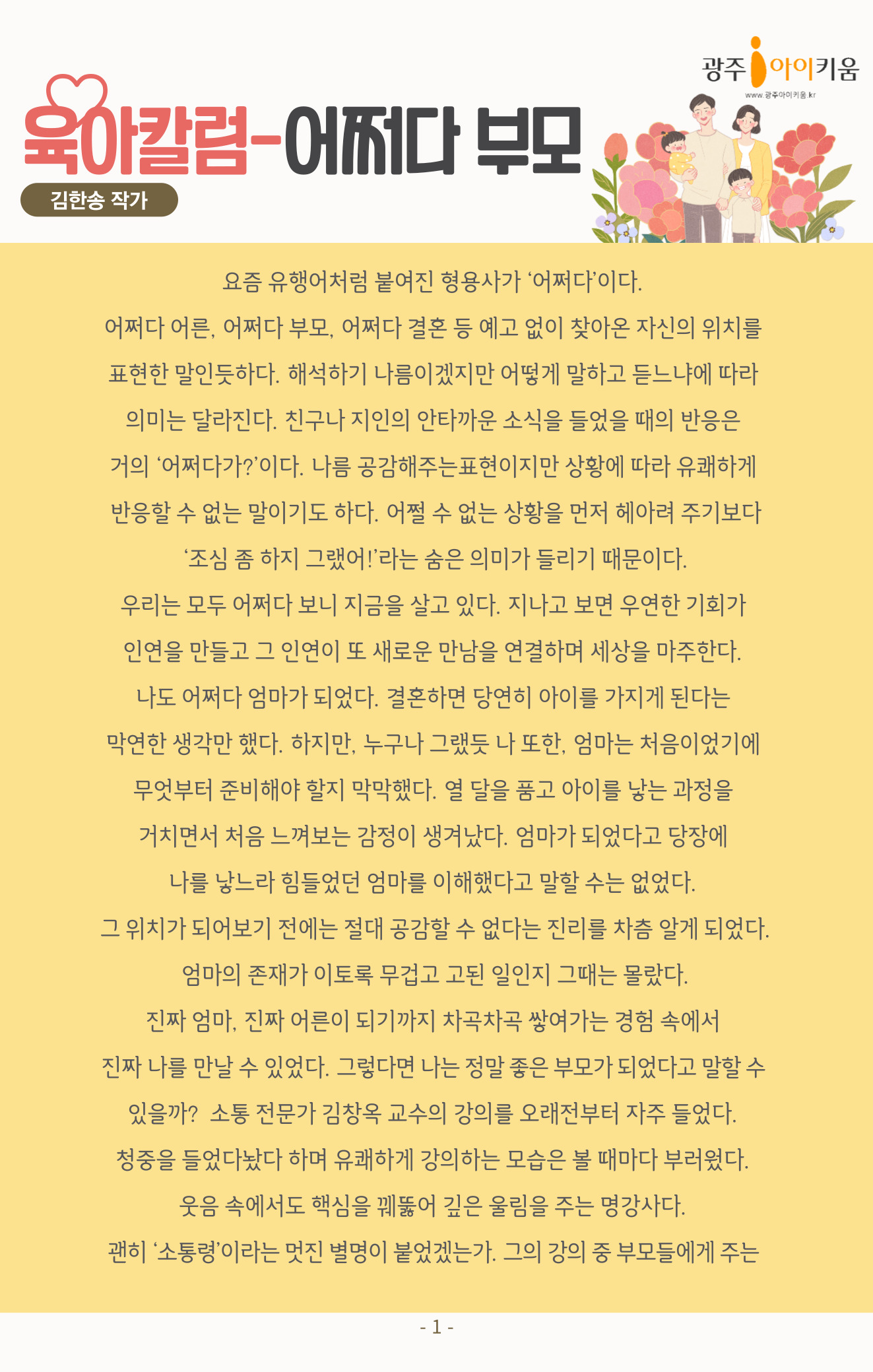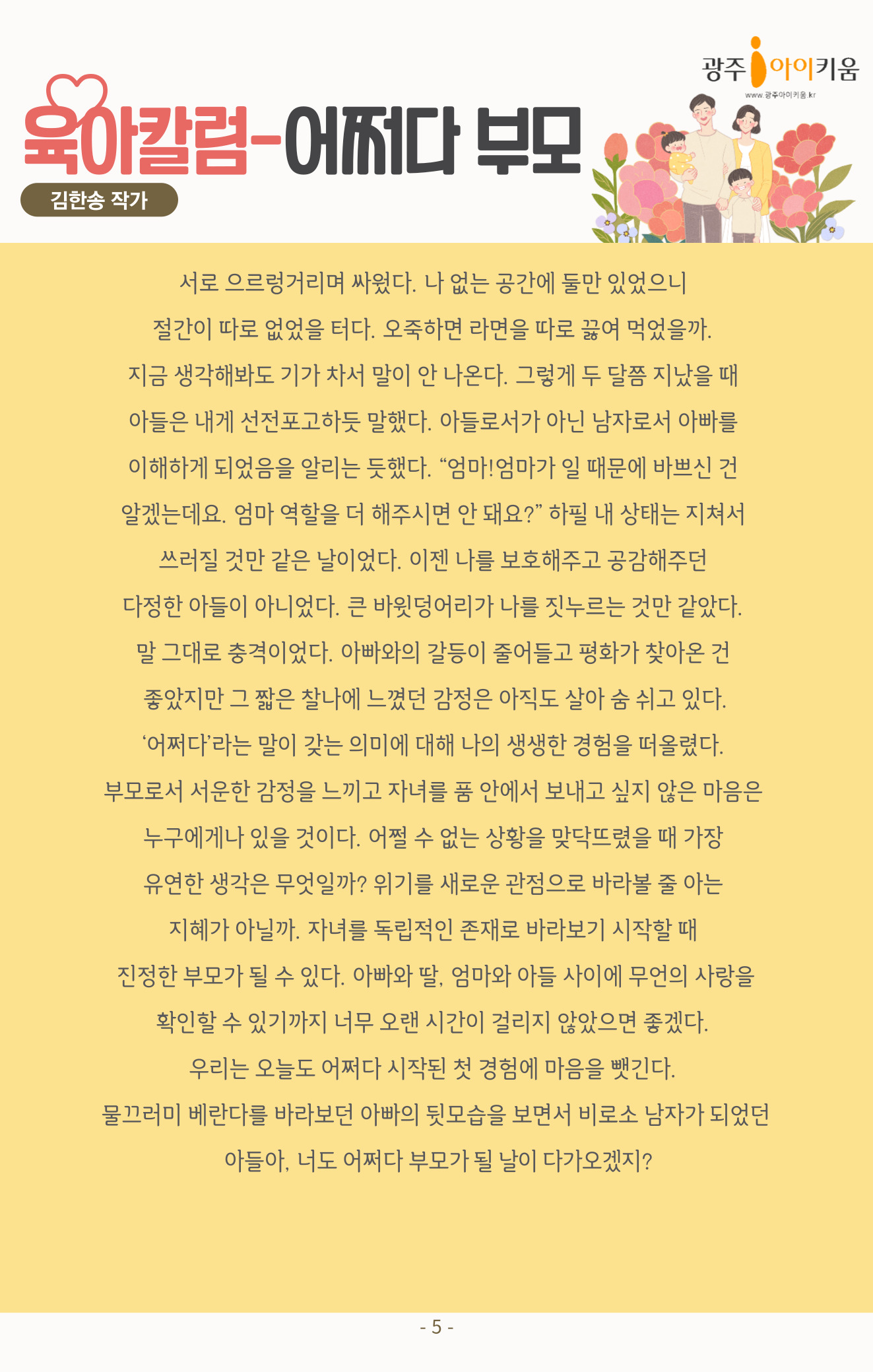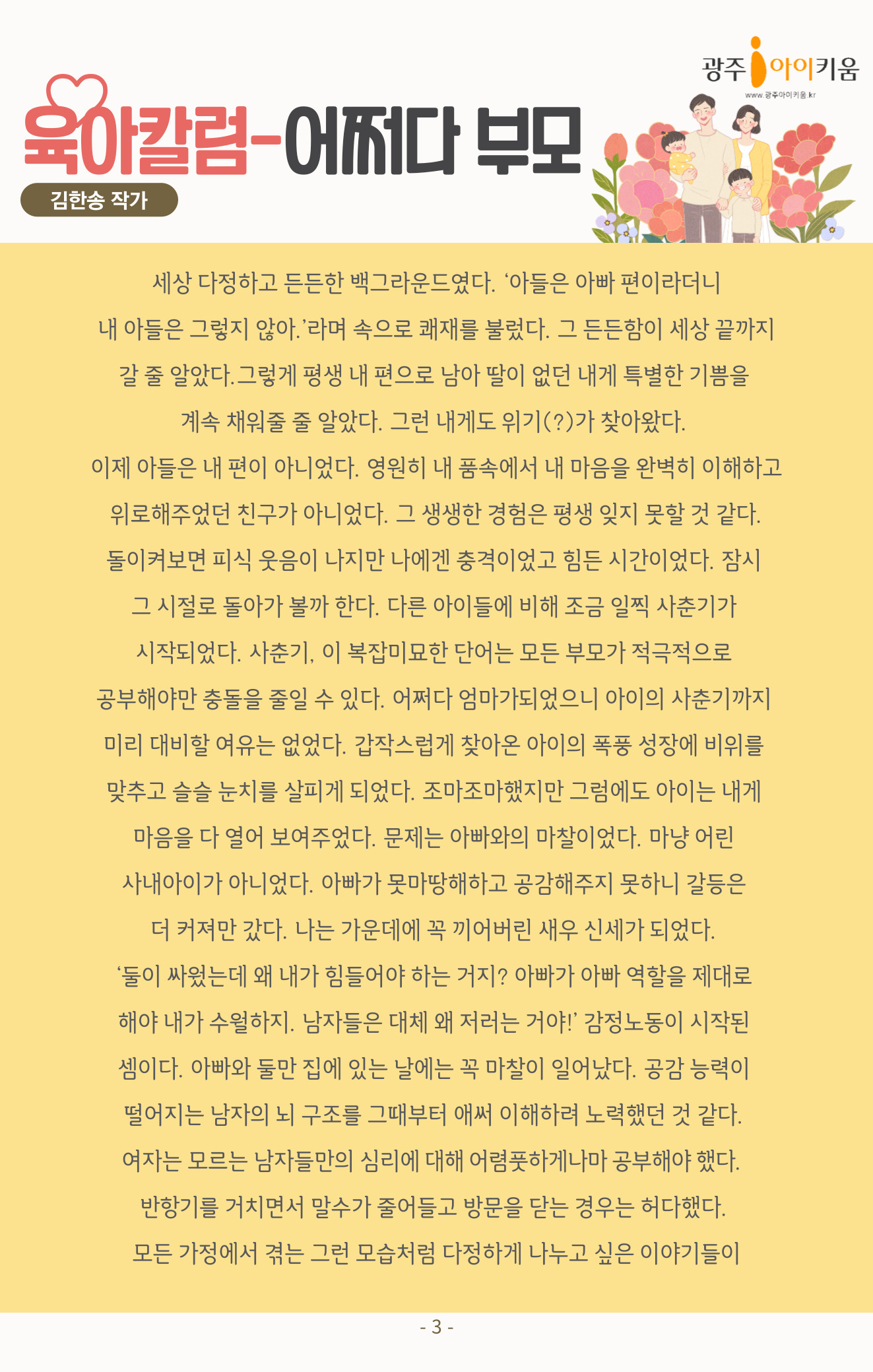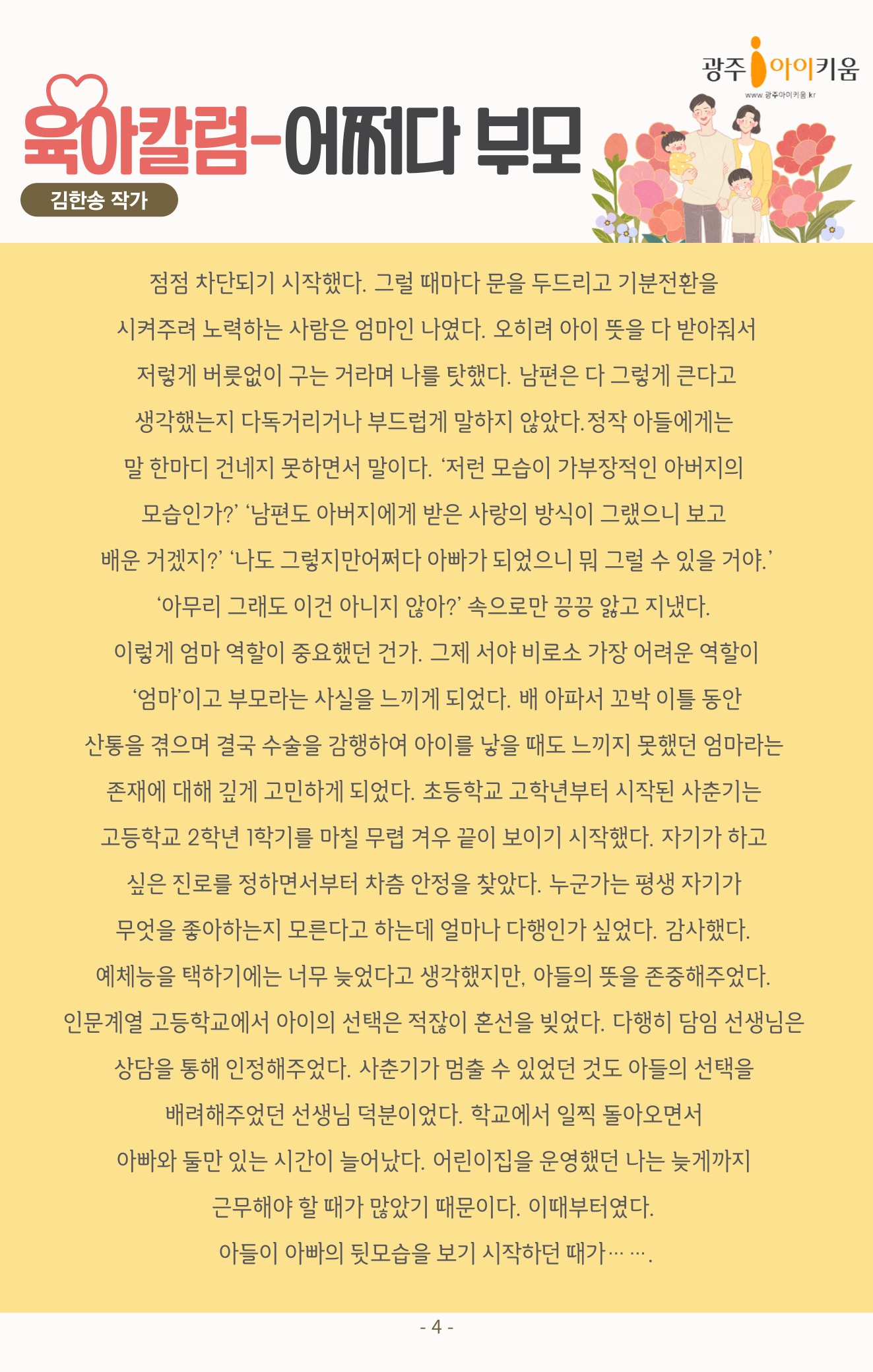 home 맘편한 내★일, 광주아이키움2.0 결혼·임신·출생 영유아 초·중·고 다양한 가족 일생활균형 커뮤니티 아동돌봄지원 소통방 나눔방 광주 아이키움 상담방 돌봄정보방 성폭력 피해 상담 및 사건지원 공지사항 이벤트소식 참여게시판 카드뉴스 동영상 아이키움 칼럼 성평등 육아웹툰 로고&캐릭터 1화 - 어쩌다 부모 등록일 : 2024-03-07 09:55 카테고리 : 카테고리 없음 작성자 : 운영자 조회수 : 1024 목록