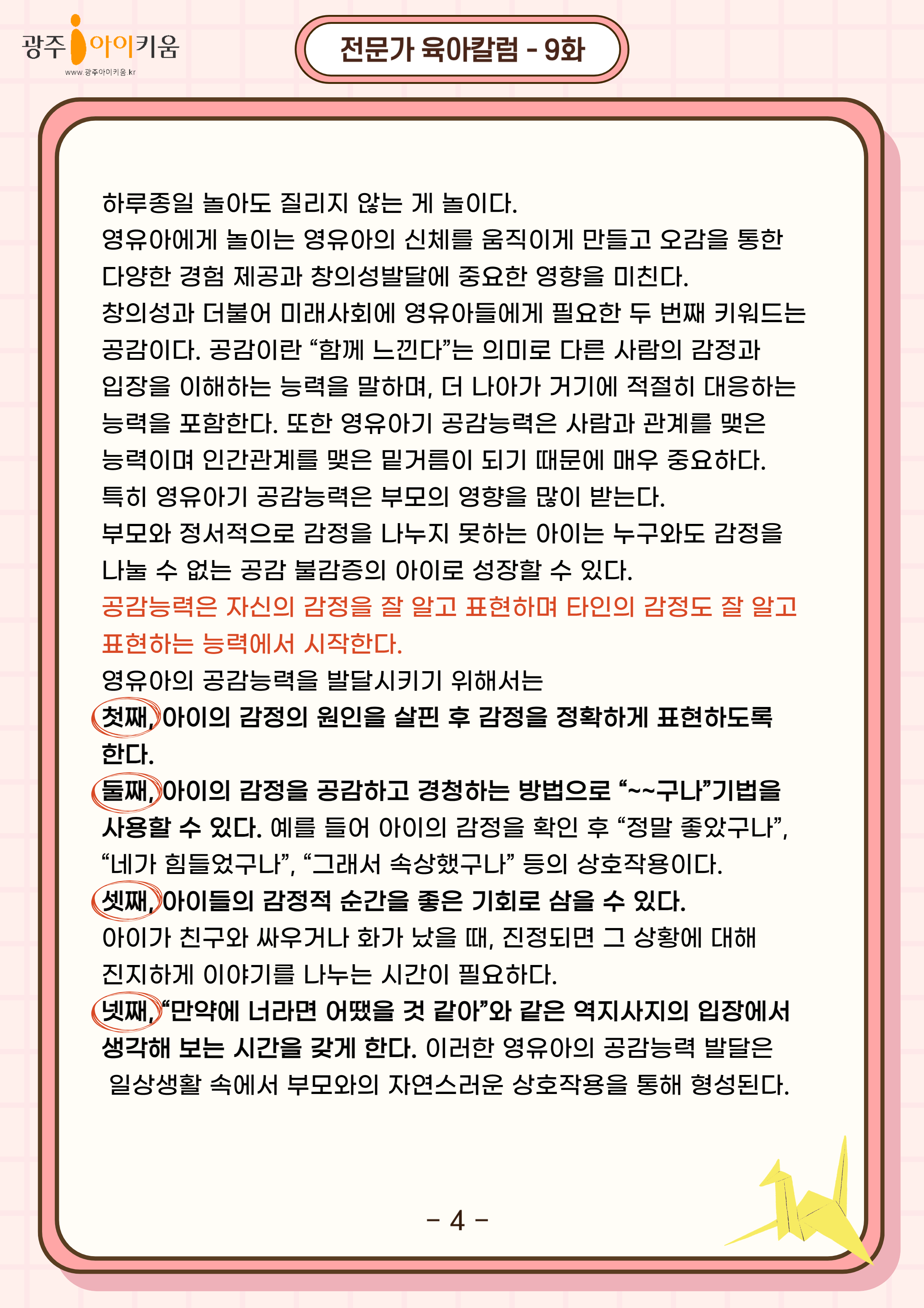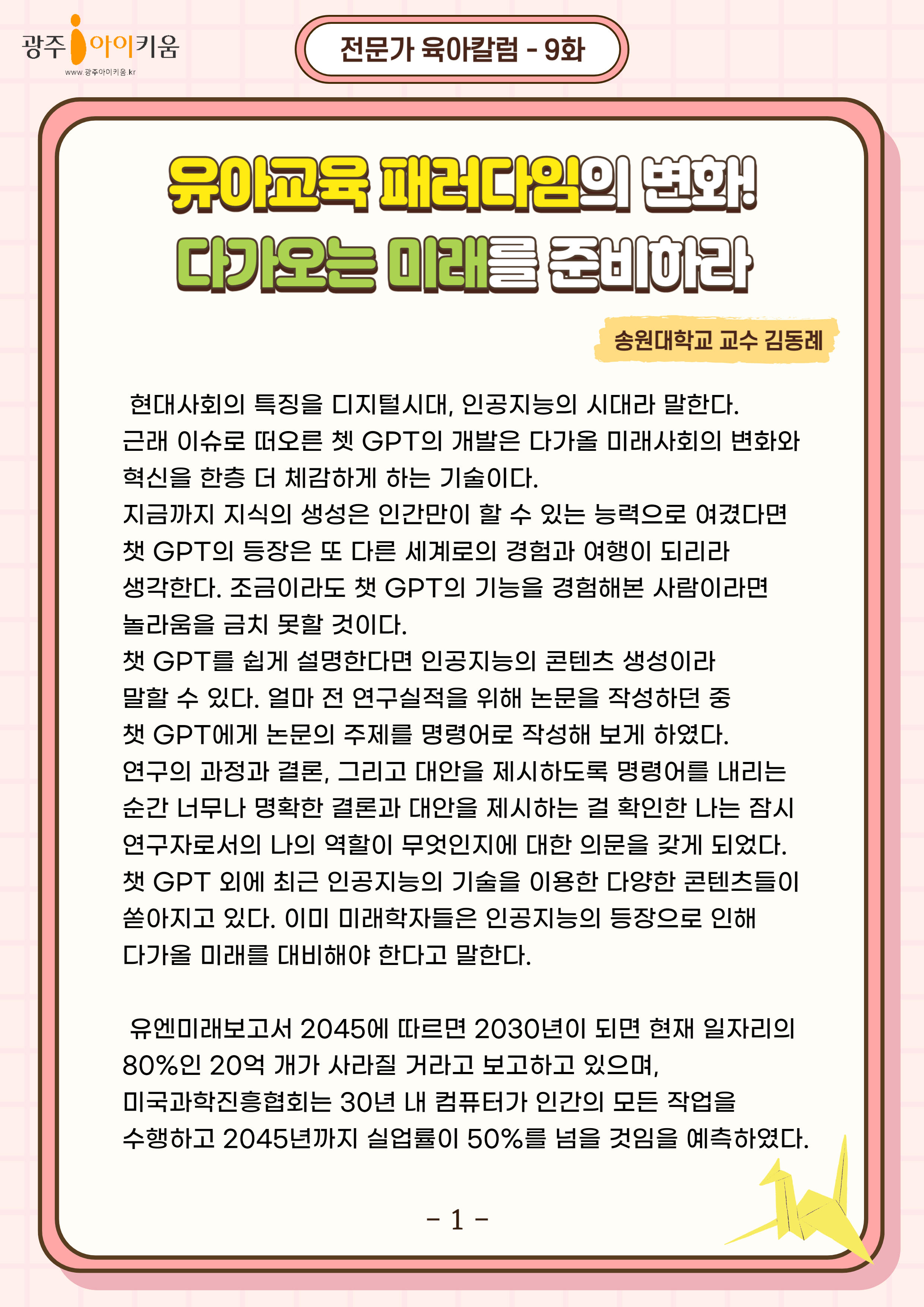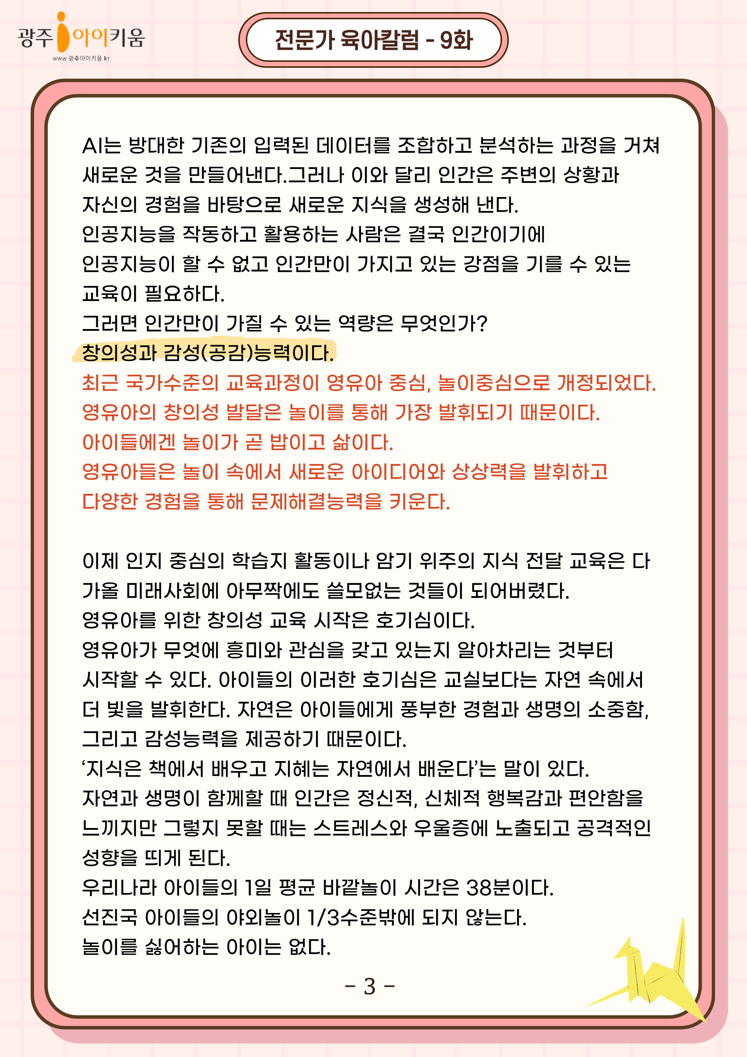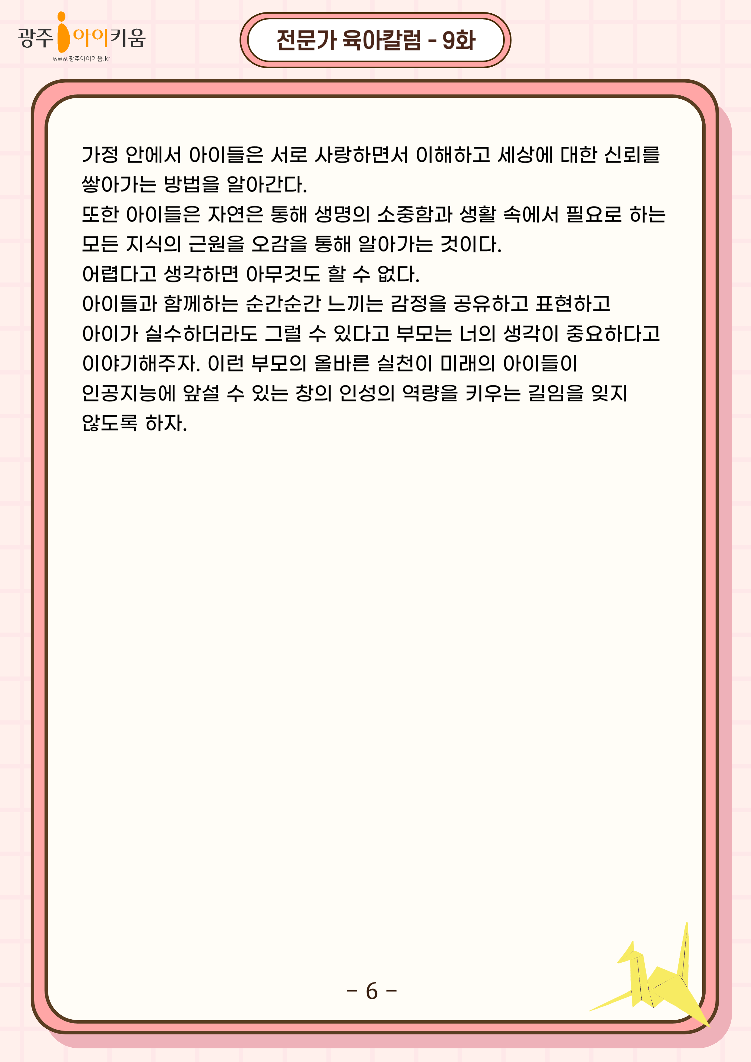 home 맘편한 내★일, 광주아이키움2.0 결혼·임신·출생 영유아 초·중·고 다양한 가족 일생활균형 커뮤니티 아동돌봄지원 소통방 나눔방 광주 아이키움 상담방 돌봄정보방 성폭력 피해 상담 및 사건지원 공지사항 이벤트소식 참여게시판 카드뉴스 동영상 아이키움 칼럼 성평등 육아웹툰 로고&캐릭터 9화-유아교육 패러다임의 변화! 다가오는 미래를 준비하라 등록일 : 2024-05-02 15:54 카테고리 : 카테고리 없음 작성자 : 운영자 조회수 : 851 목록