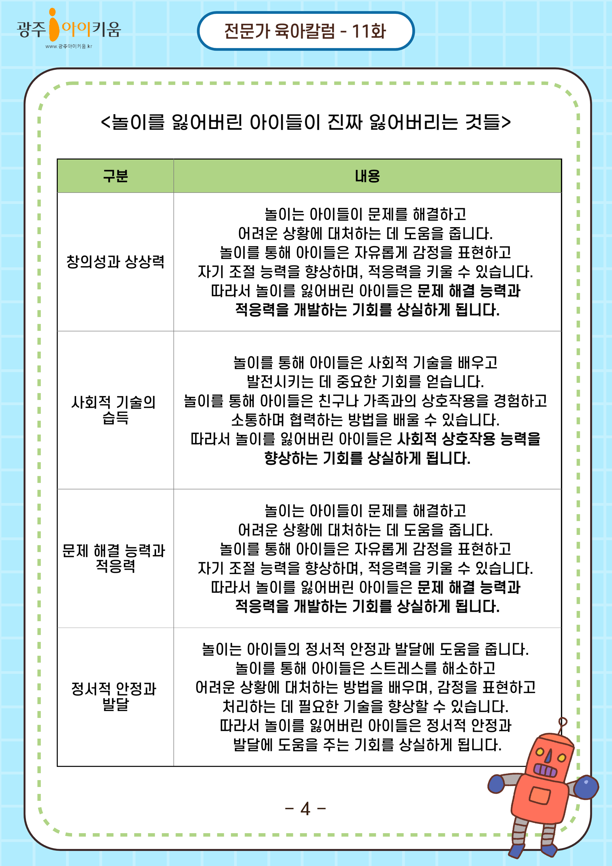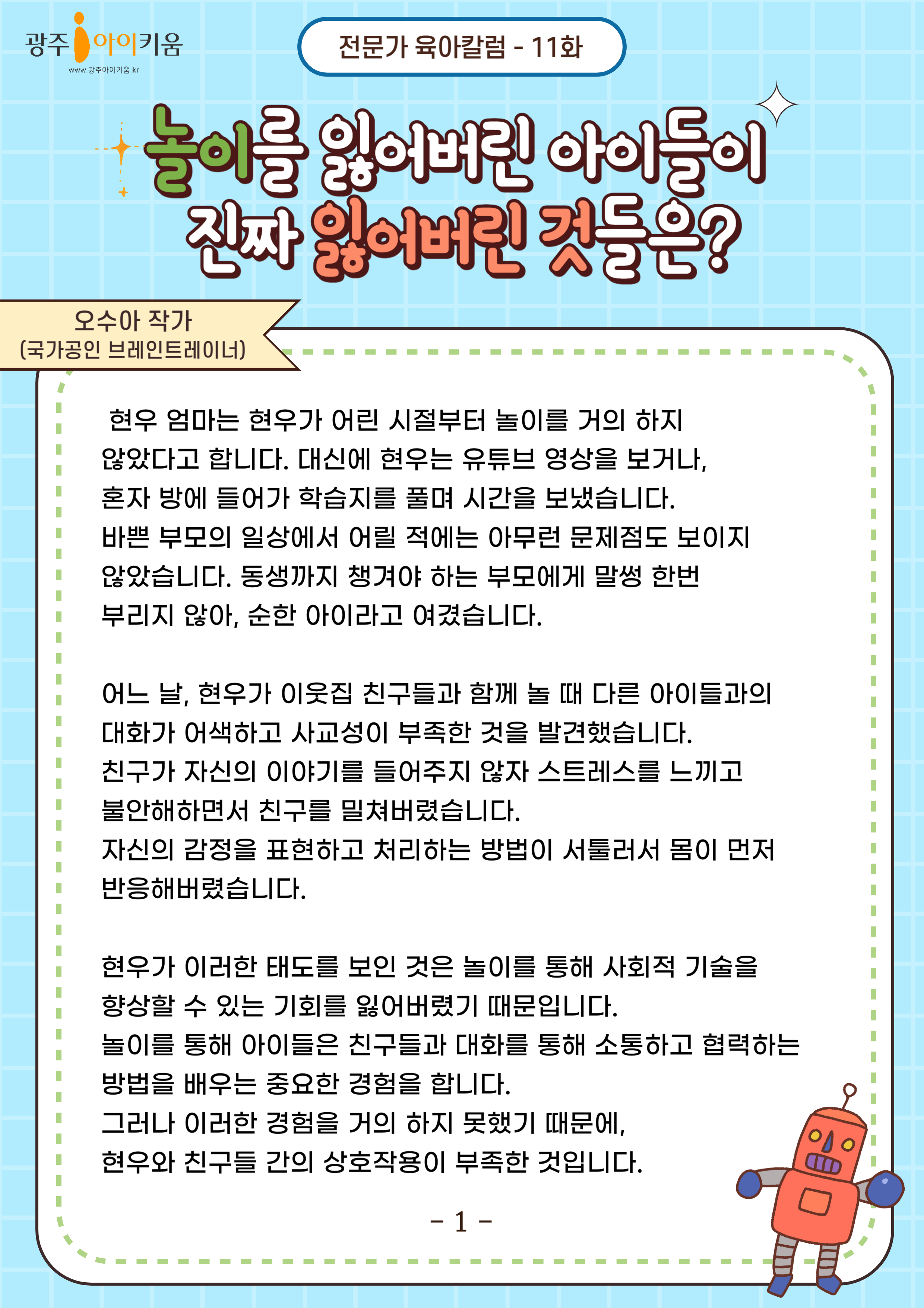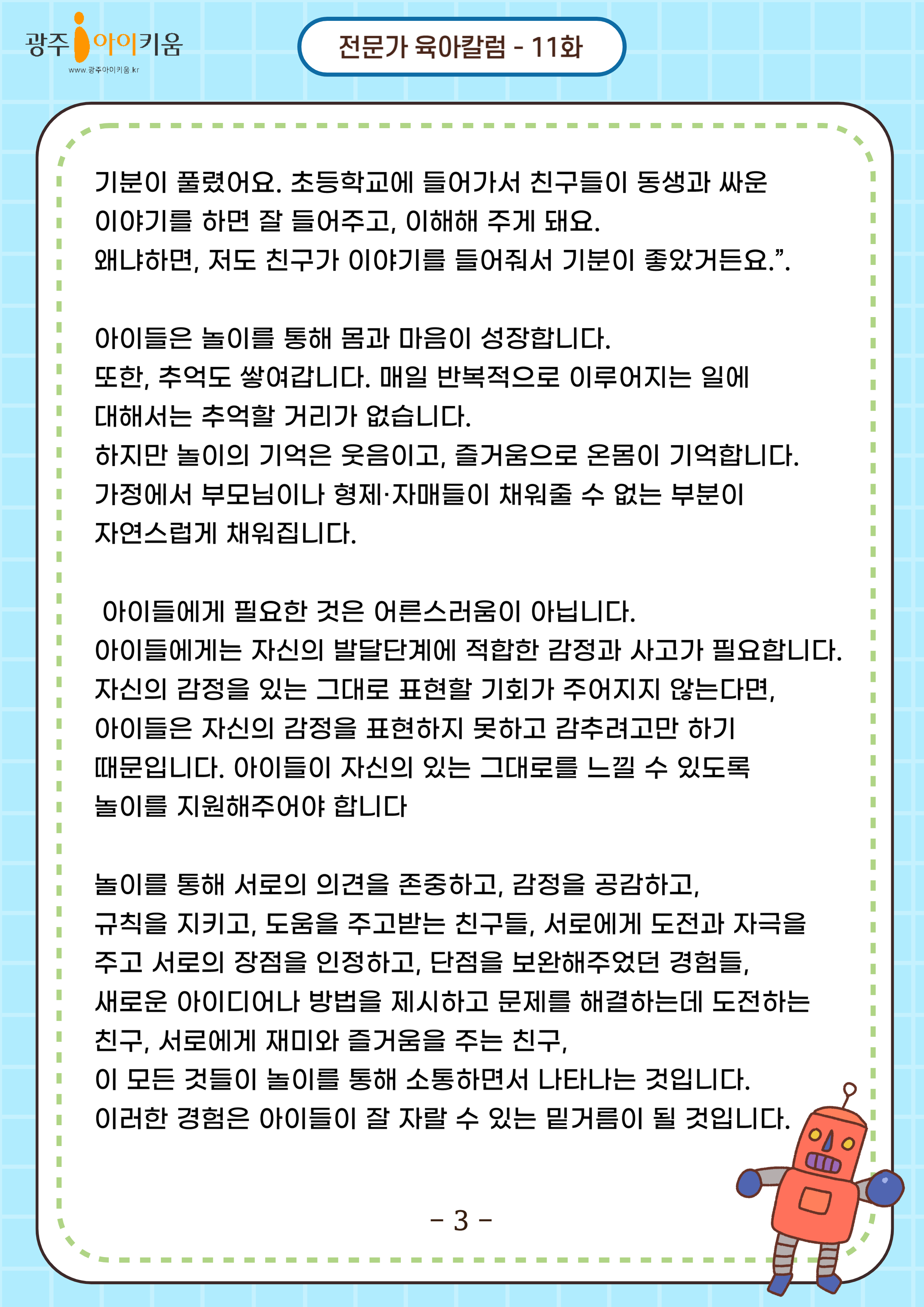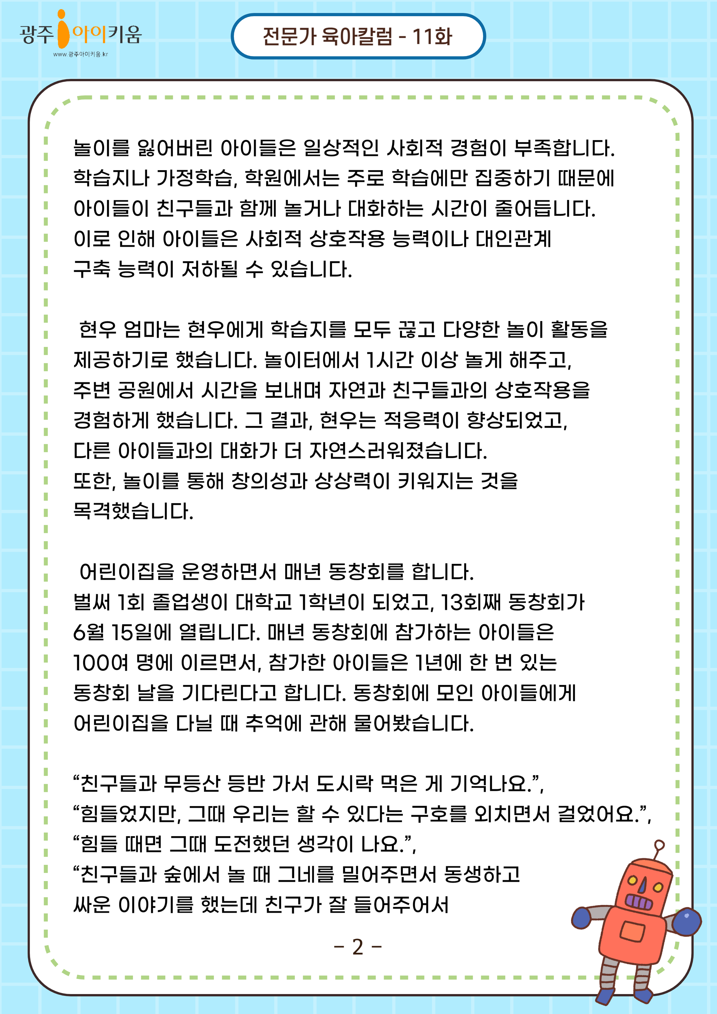 home 맘편한 내★일, 광주아이키움2.0 결혼·임신·출생 영유아 초·중·고 다양한 가족 일생활균형 커뮤니티 아동돌봄지원 소통방 나눔방 광주 아이키움 상담방 돌봄정보방 성폭력 피해 상담 및 사건지원 공지사항 이벤트소식 참여게시판 카드뉴스 동영상 아이키움 칼럼 성평등 육아웹툰 로고&캐릭터 11화-놀이를 잃어버린 아이들이 진짜 잃어버린 것들은? 등록일 : 2024-05-17 09:41 카테고리 : 카테고리 없음 작성자 : 운영자 조회수 : 802 목록