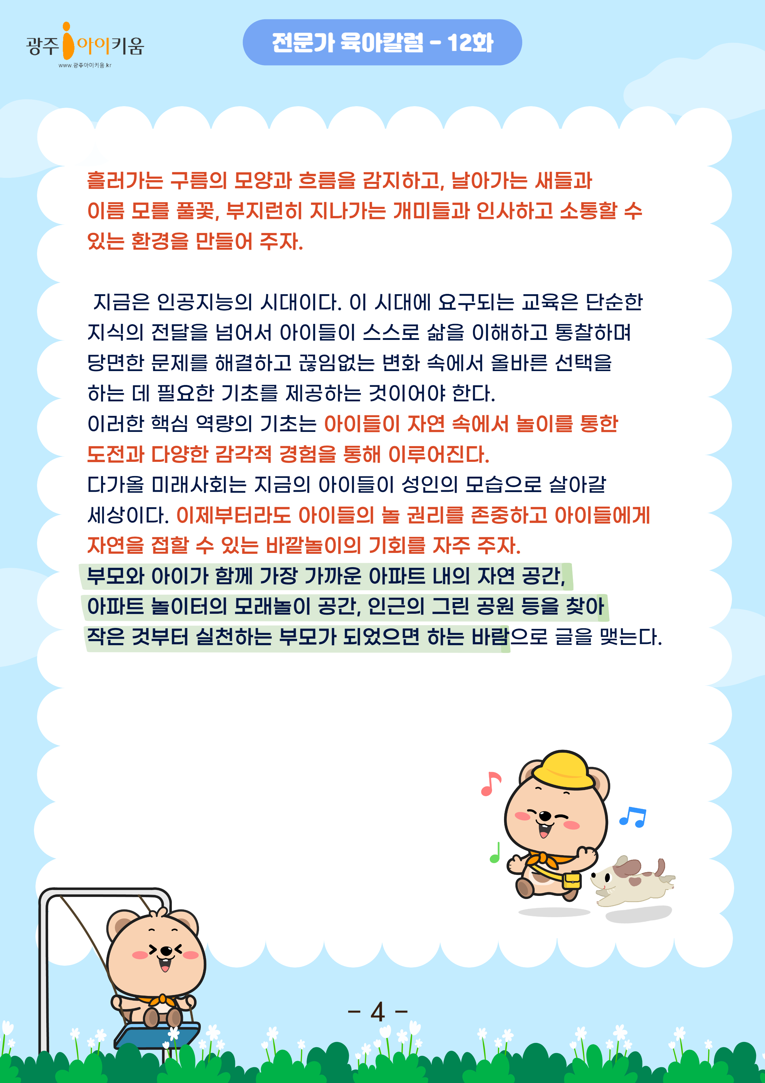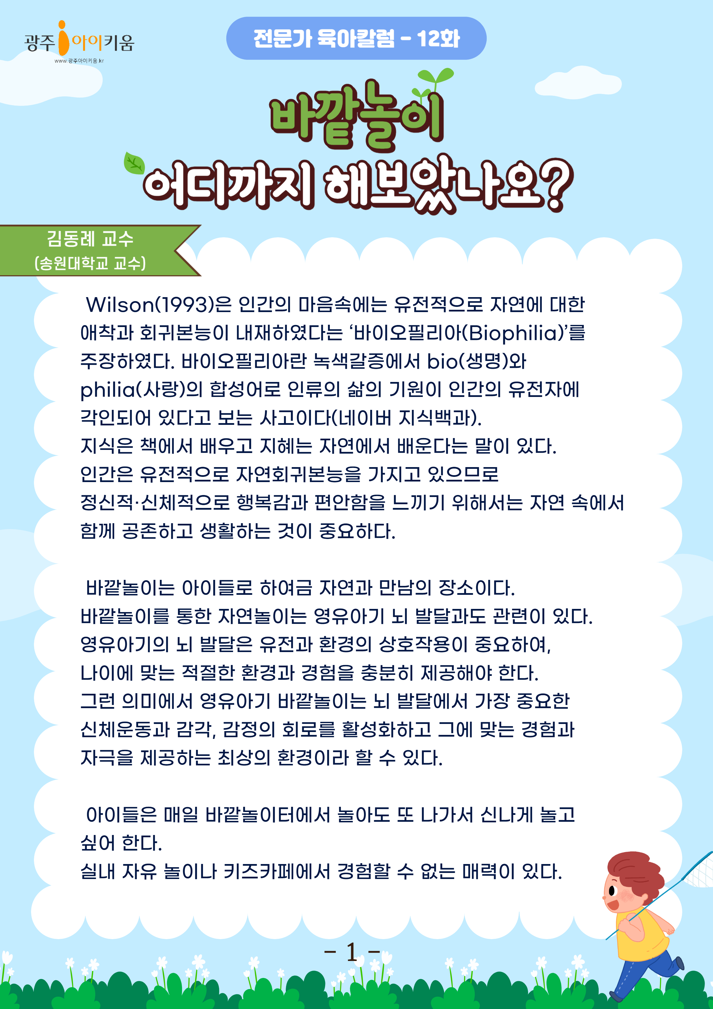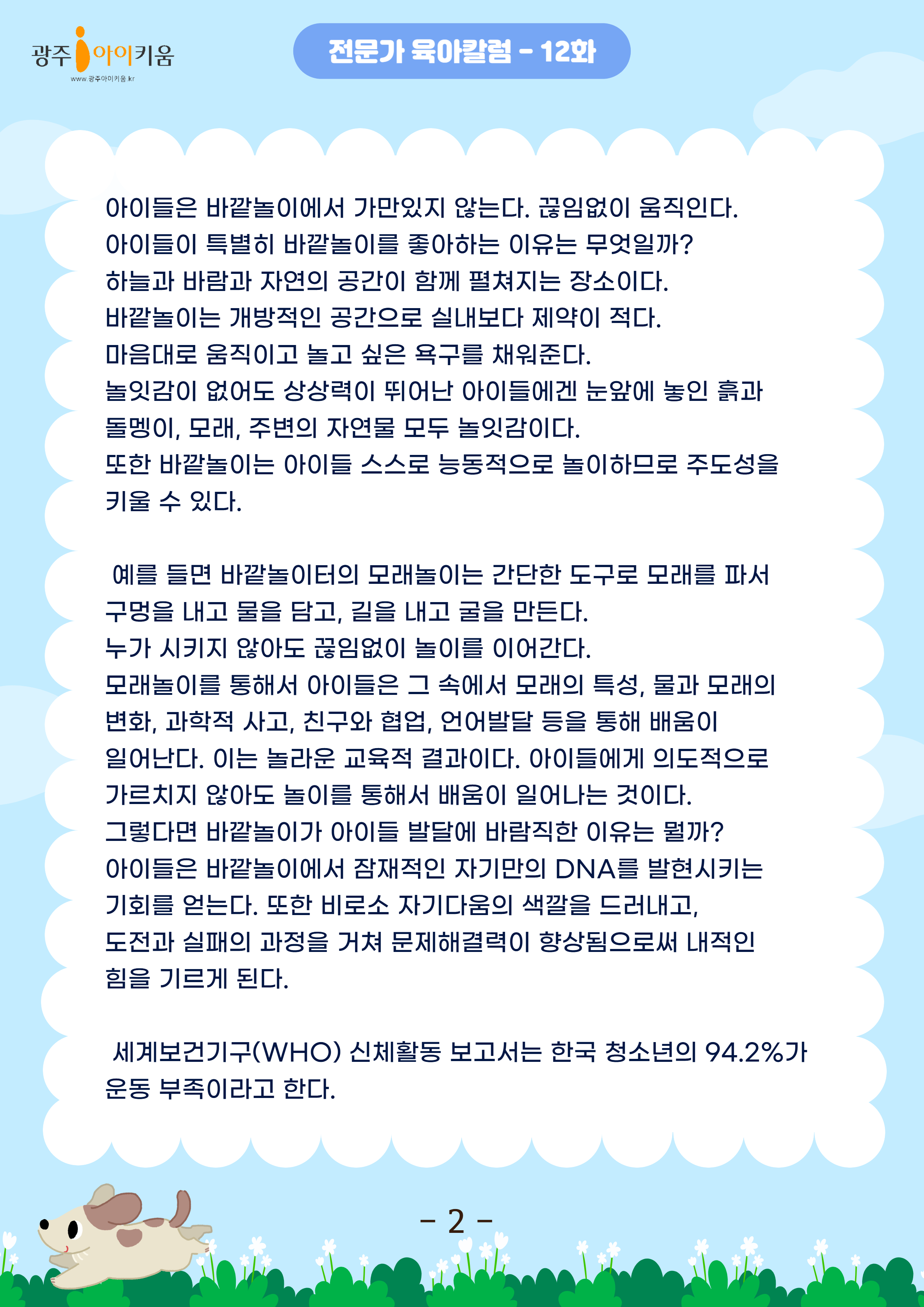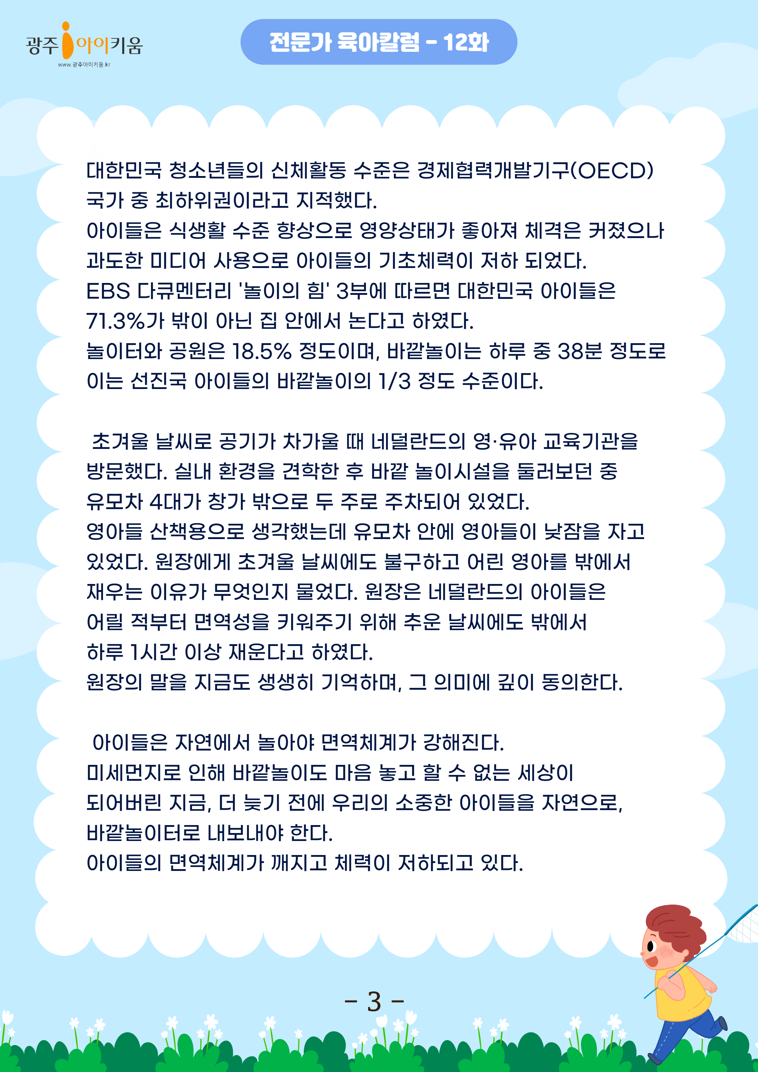 home 맘편한 내★일, 광주아이키움2.0 결혼·임신·출생 영유아 초·중·고 다양한 가족 일생활균형 커뮤니티 아동돌봄지원 소통방 나눔방 광주 아이키움 상담방 돌봄정보방 성폭력 피해 상담 및 사건지원 공지사항 이벤트소식 참여게시판 카드뉴스 동영상 아이키움 칼럼 성평등 육아웹툰 로고&캐릭터 12화-바깥놀이 어디까지 해보았나요? 등록일 : 2024-05-24 11:18 카테고리 : 카테고리 없음 작성자 : 운영자 조회수 : 913 ㅌ 목록
