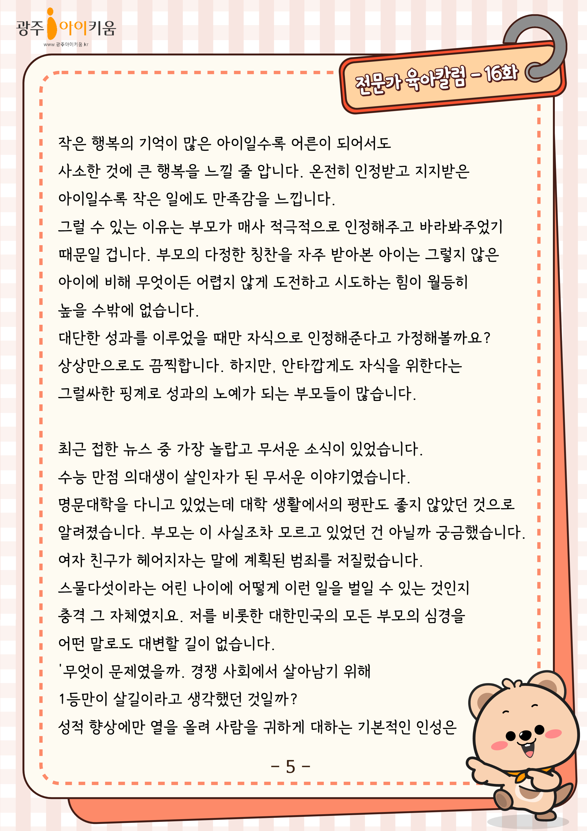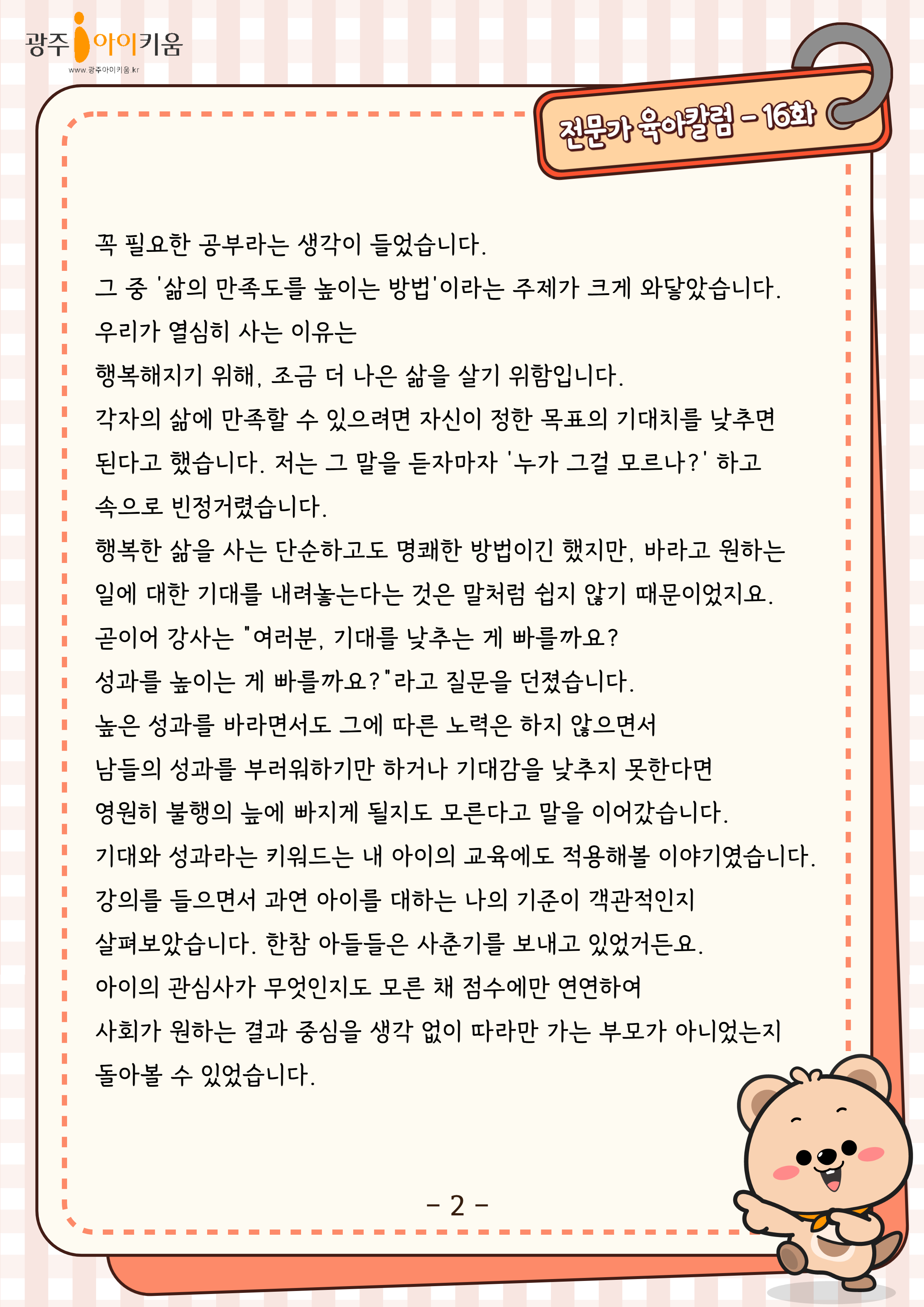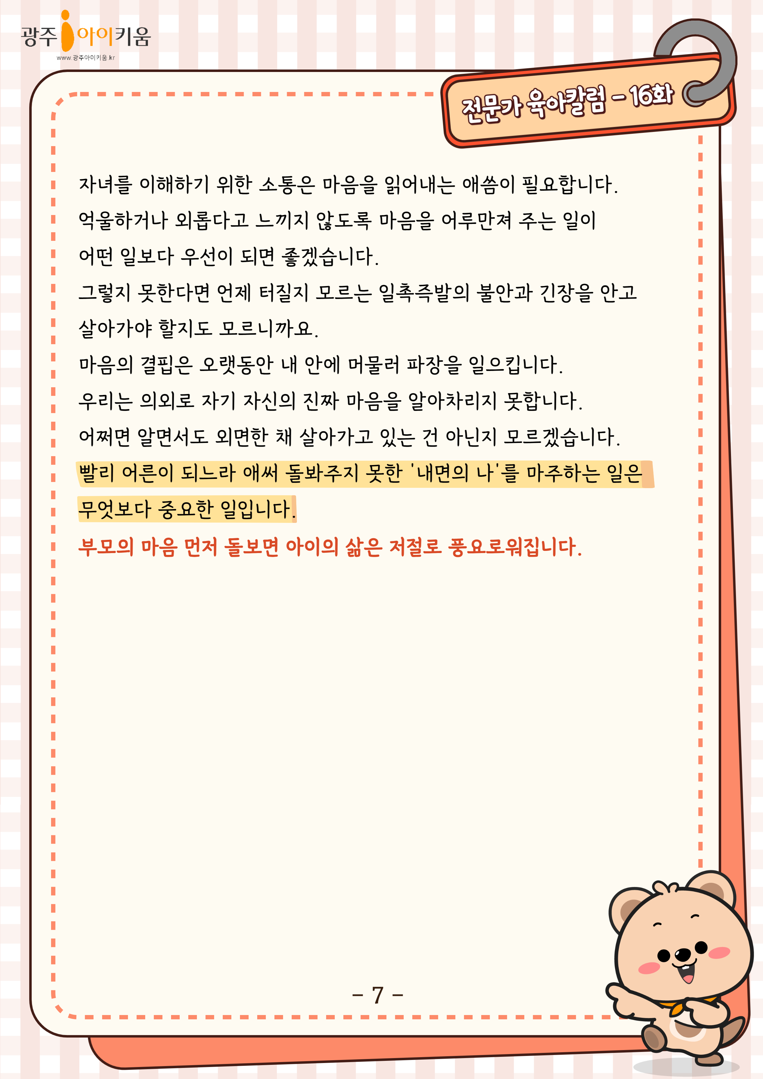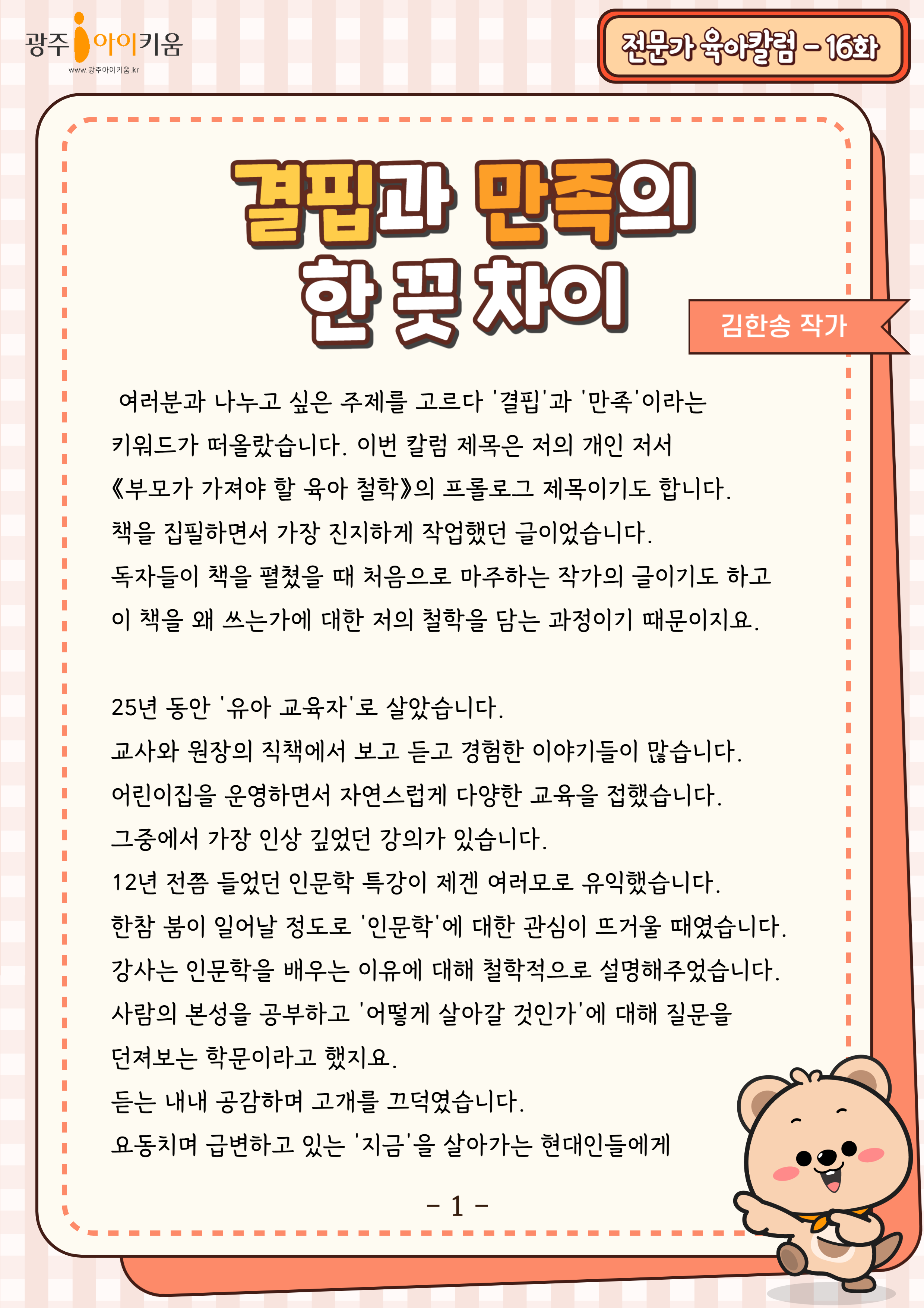 home 맘편한 내★일, 광주아이키움2.0 결혼·임신·출생 영유아 초·중·고 다양한 가족 일생활균형 커뮤니티 아동돌봄지원 소통방 나눔방 광주 아이키움 상담방 돌봄정보방 성폭력 피해 상담 및 사건지원 공지사항 이벤트소식 참여게시판 카드뉴스 동영상 아이키움 칼럼 성평등 육아웹툰 로고&캐릭터 16화-결핍과 만족의 한 끗 차이 등록일 : 2024-06-21 12:50 카테고리 : 카테고리 없음 작성자 : 운영자 조회수 : 753 목록
