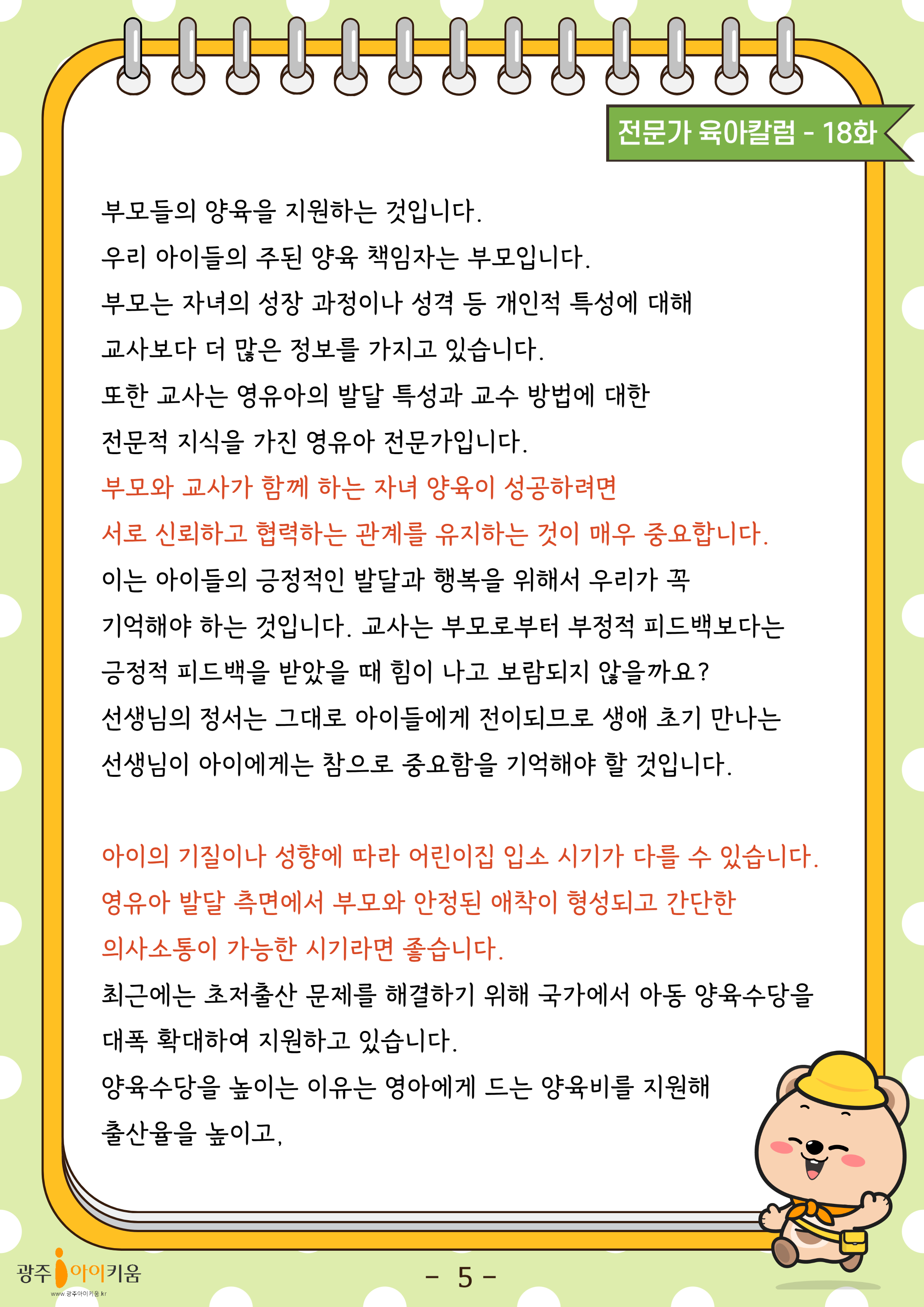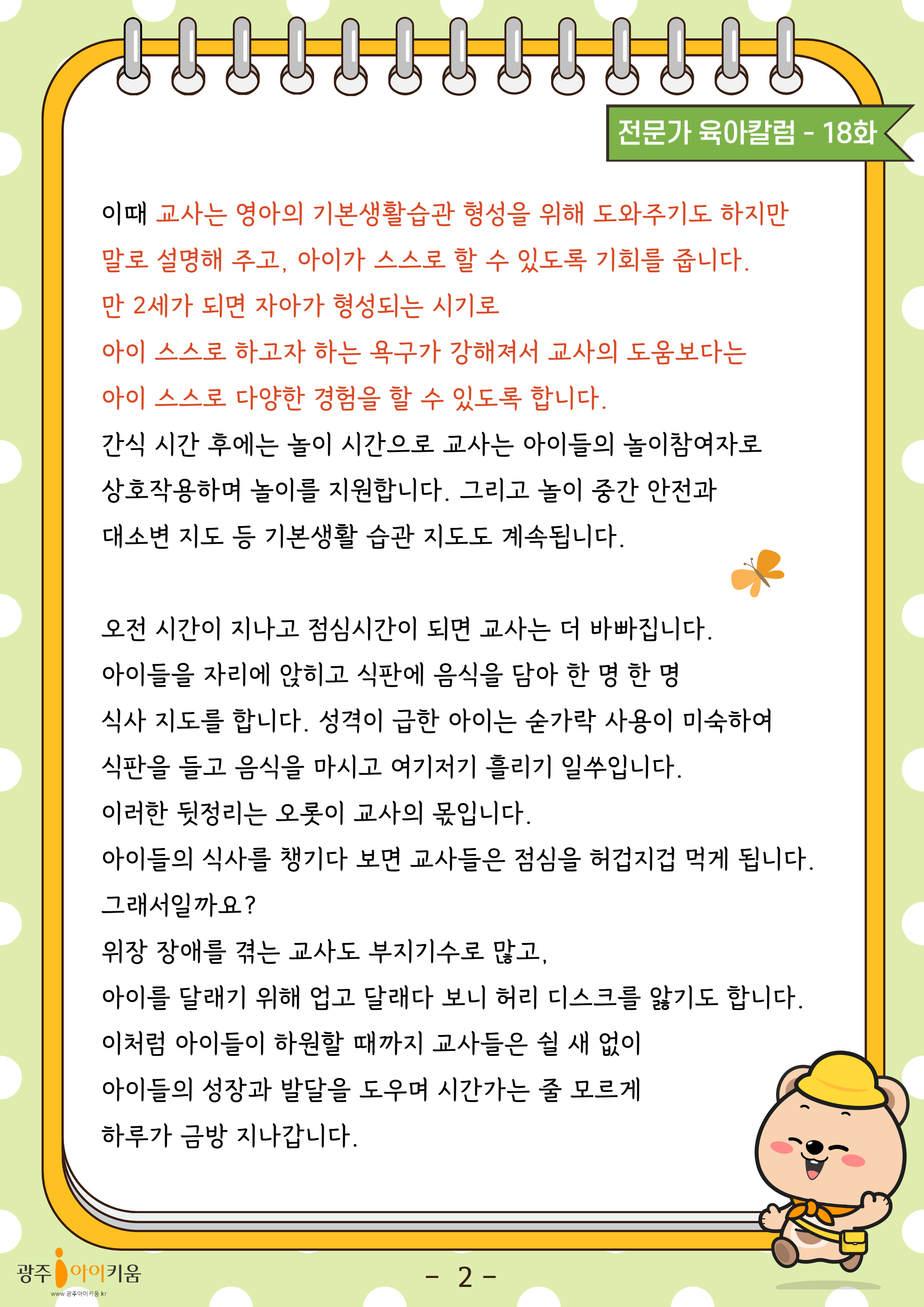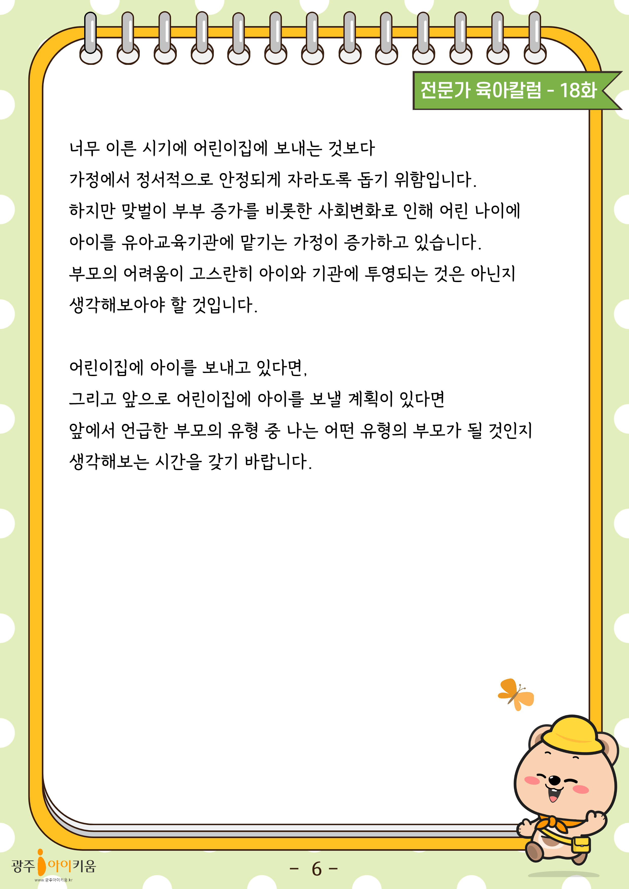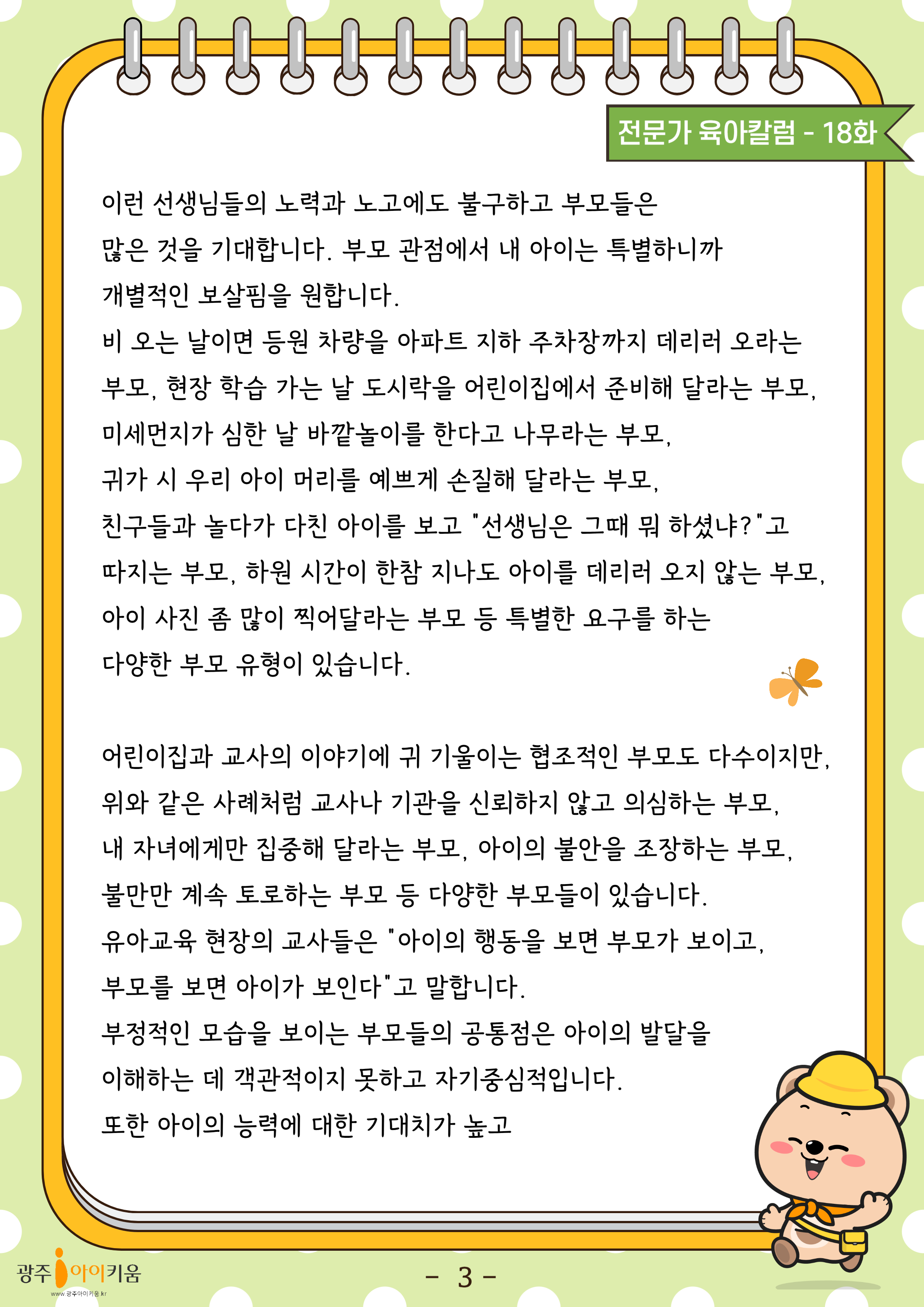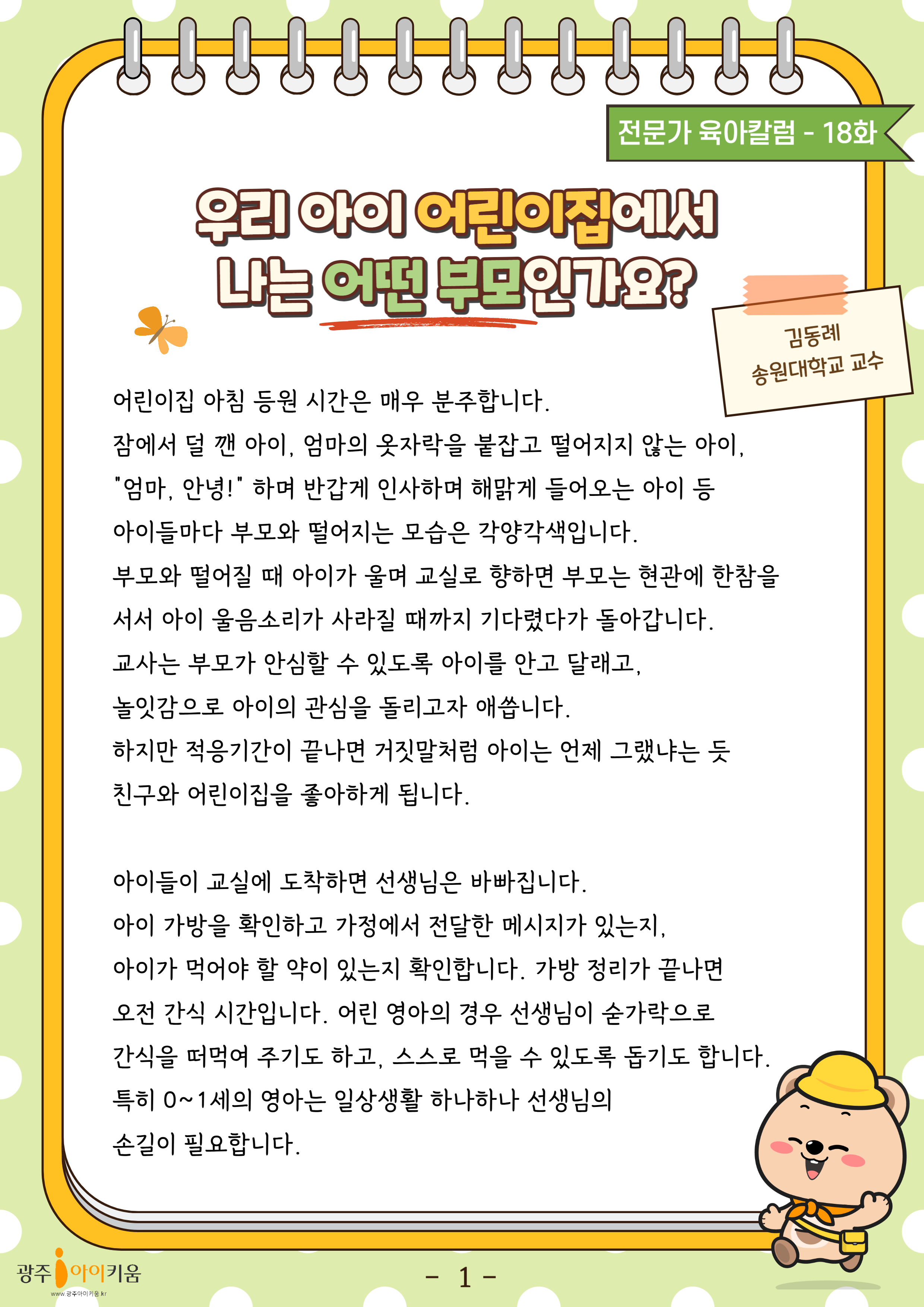 home 맘편한 내★일, 광주아이키움2.0 결혼·임신·출생 영유아 초·중·고 다양한 가족 일생활균형 커뮤니티 아동돌봄지원 소통방 나눔방 광주 아이키움 상담방 돌봄정보방 성폭력 피해 상담 및 사건지원 공지사항 이벤트소식 참여게시판 카드뉴스 동영상 아이키움 칼럼 성평등 육아웹툰 로고&캐릭터 18화-우리 아이 어린이집에서 나는 어떤 부모인가요 등록일 : 2024-07-09 18:27 카테고리 : 카테고리 없음 작성자 : 운영자 조회수 : 690 목록