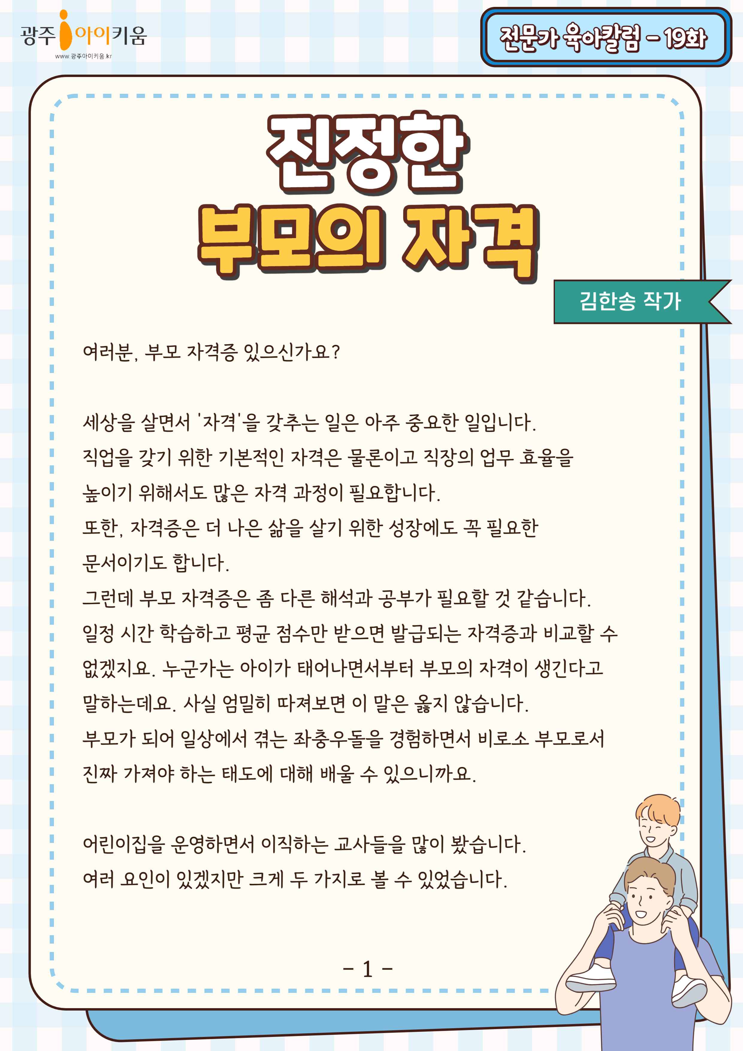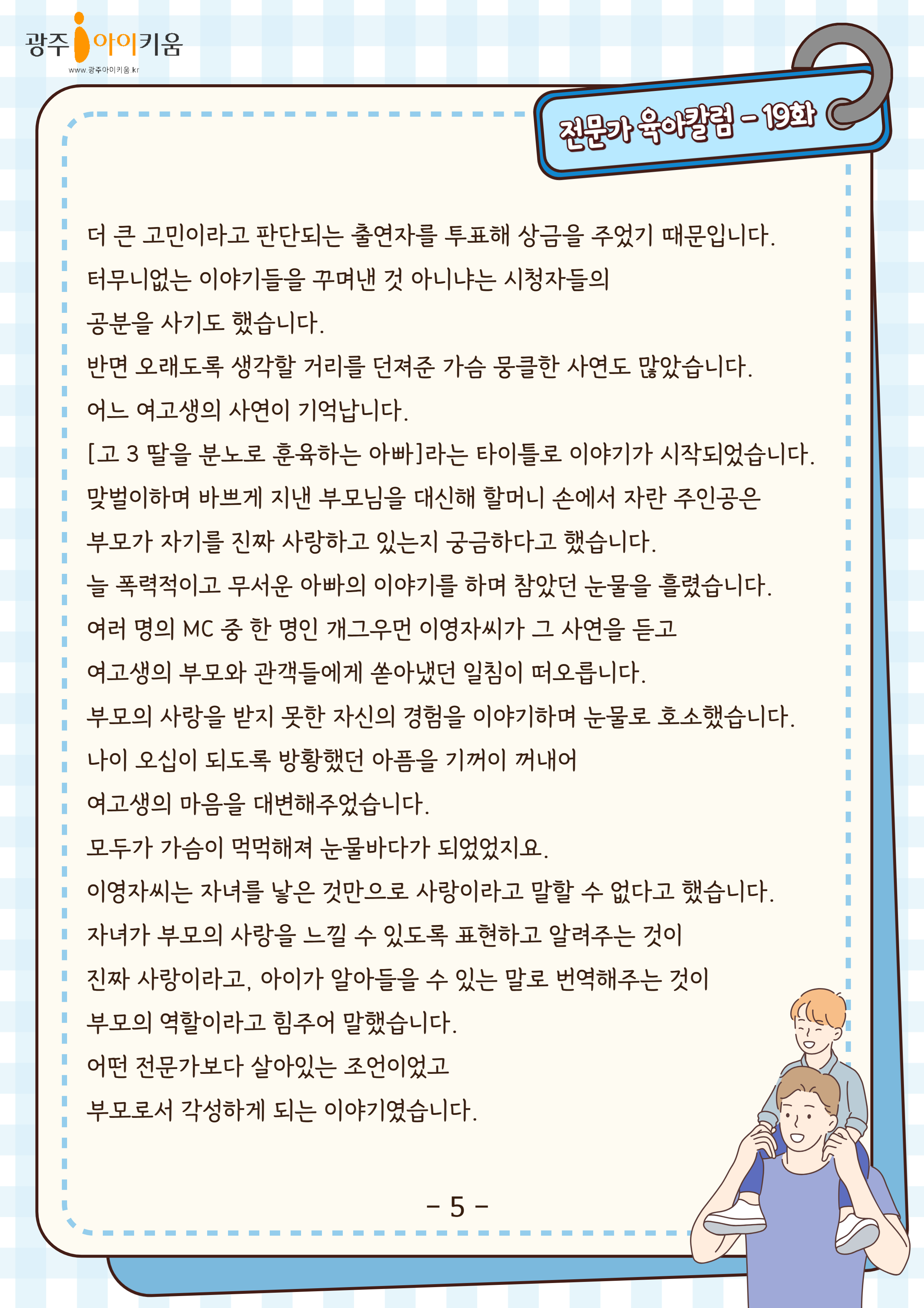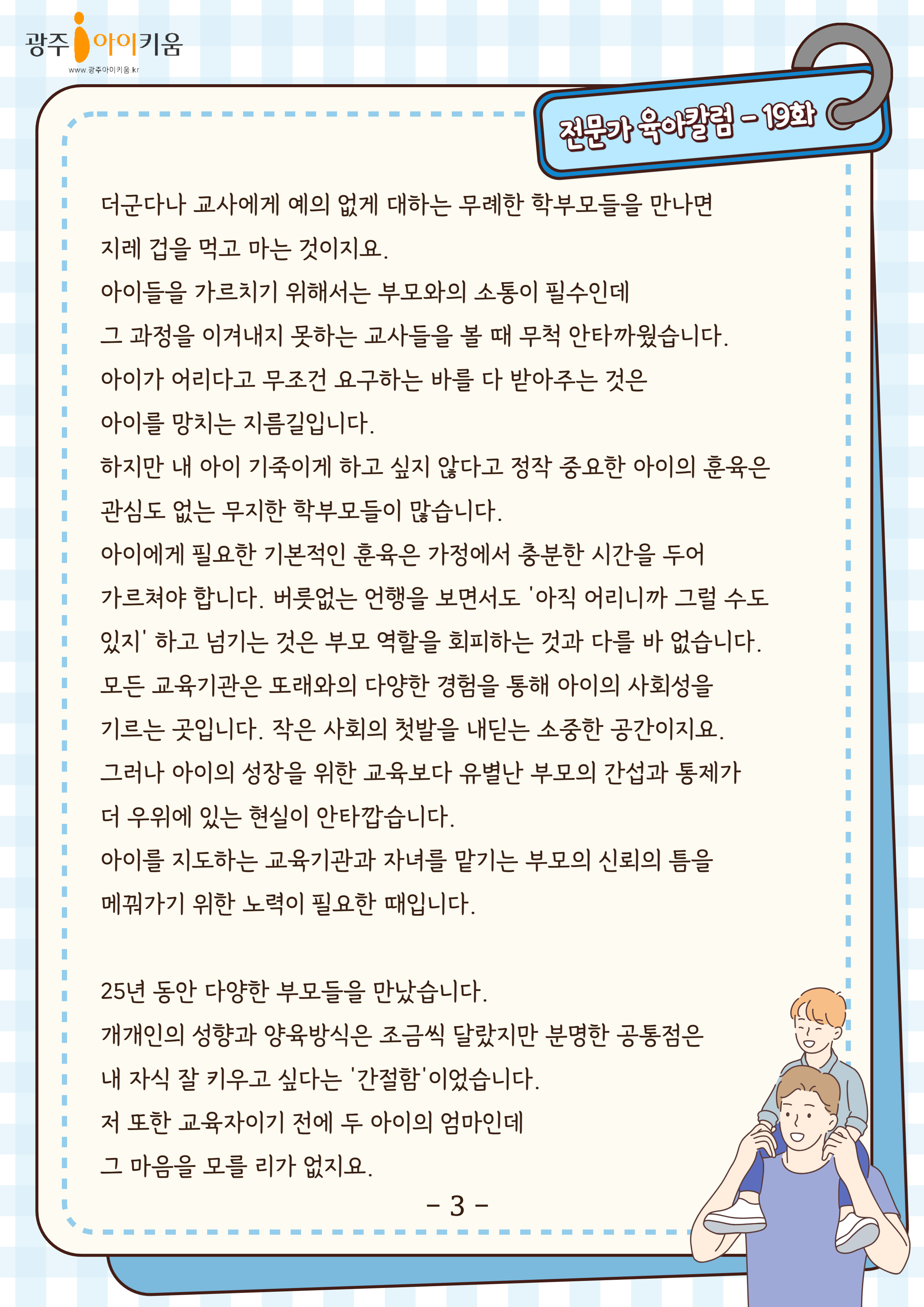home 맘편한 내★일, 광주아이키움2.0 결혼·임신·출생 영유아 초·중·고 다양한 가족 일생활균형 커뮤니티 아동돌봄지원 소통방 나눔방 광주 아이키움 상담방 돌봄정보방 성폭력 피해 상담 및 사건지원 공지사항 이벤트소식 참여게시판 카드뉴스 동영상 아이키움 칼럼 성평등 육아웹툰 로고&캐릭터 19화-진정한 부모의 자격 등록일 : 2024-07-11 15:46 카테고리 : 카테고리 없음 작성자 : 운영자 조회수 : 672 목록