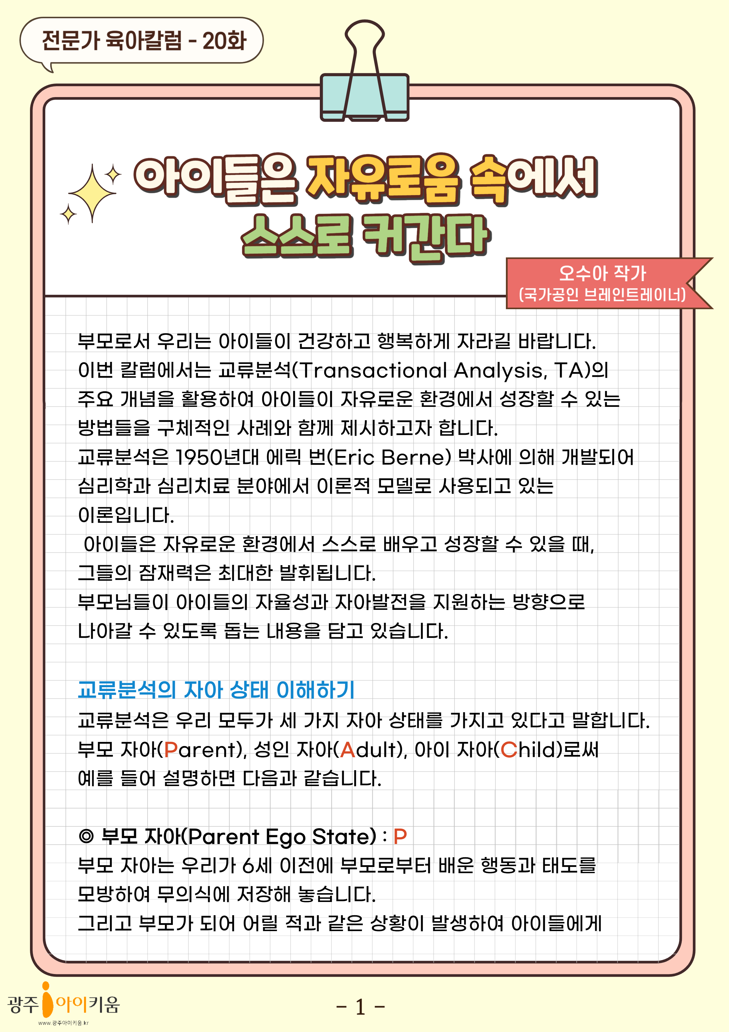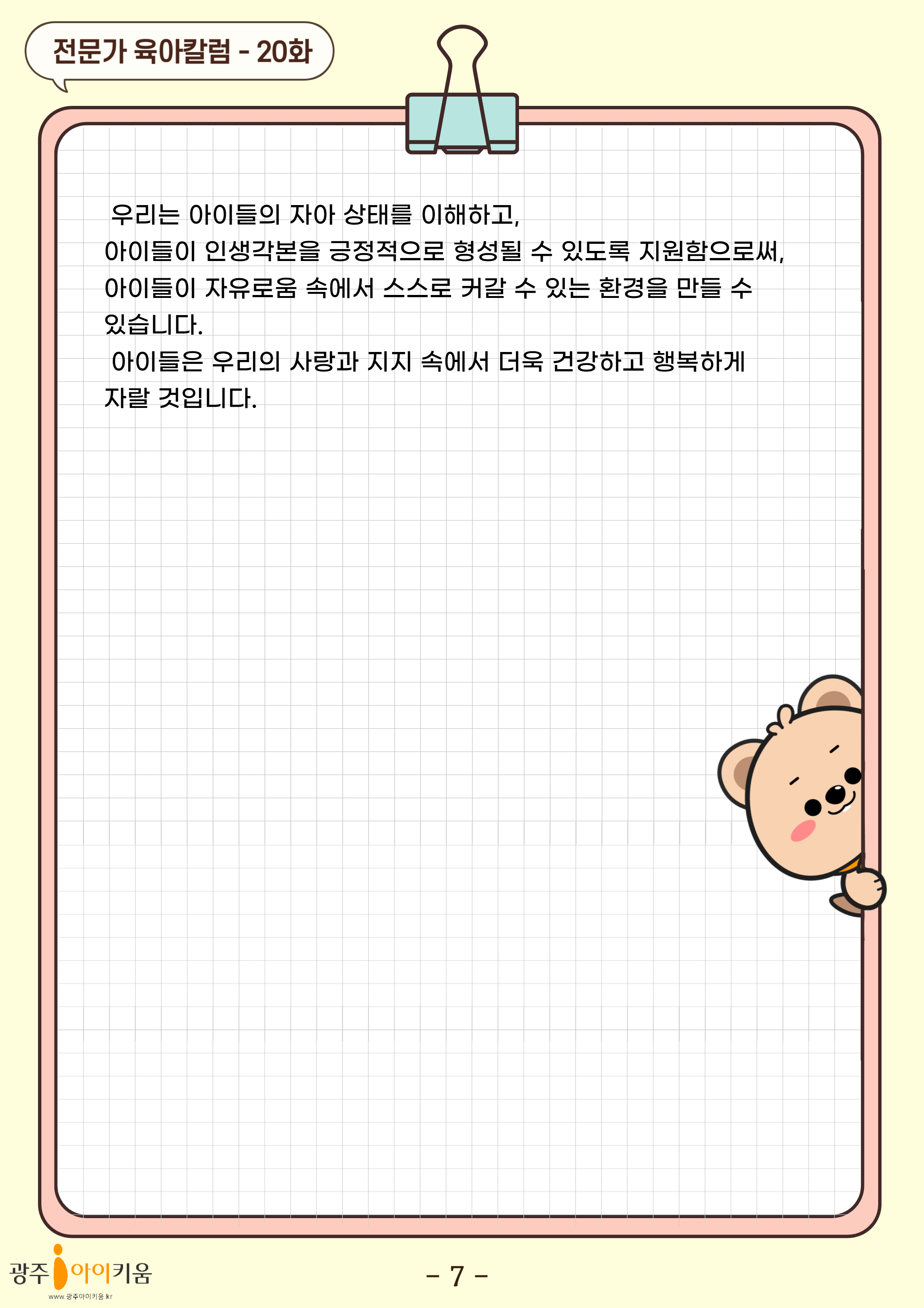 home 맘편한 내★일, 광주아이키움2.0 결혼·임신·출생 영유아 초·중·고 다양한 가족 일생활균형 커뮤니티 아동돌봄지원 소통방 나눔방 광주 아이키움 상담방 돌봄정보방 성폭력 피해 상담 및 사건지원 공지사항 이벤트소식 참여게시판 카드뉴스 동영상 아이키움 칼럼 성평등 육아웹툰 로고&캐릭터 20화-아이들은 자유로움 속에서 스스로 커간다 등록일 : 2024-07-18 15:50 카테고리 : 카테고리 없음 작성자 : 운영자 조회수 : 664 목록