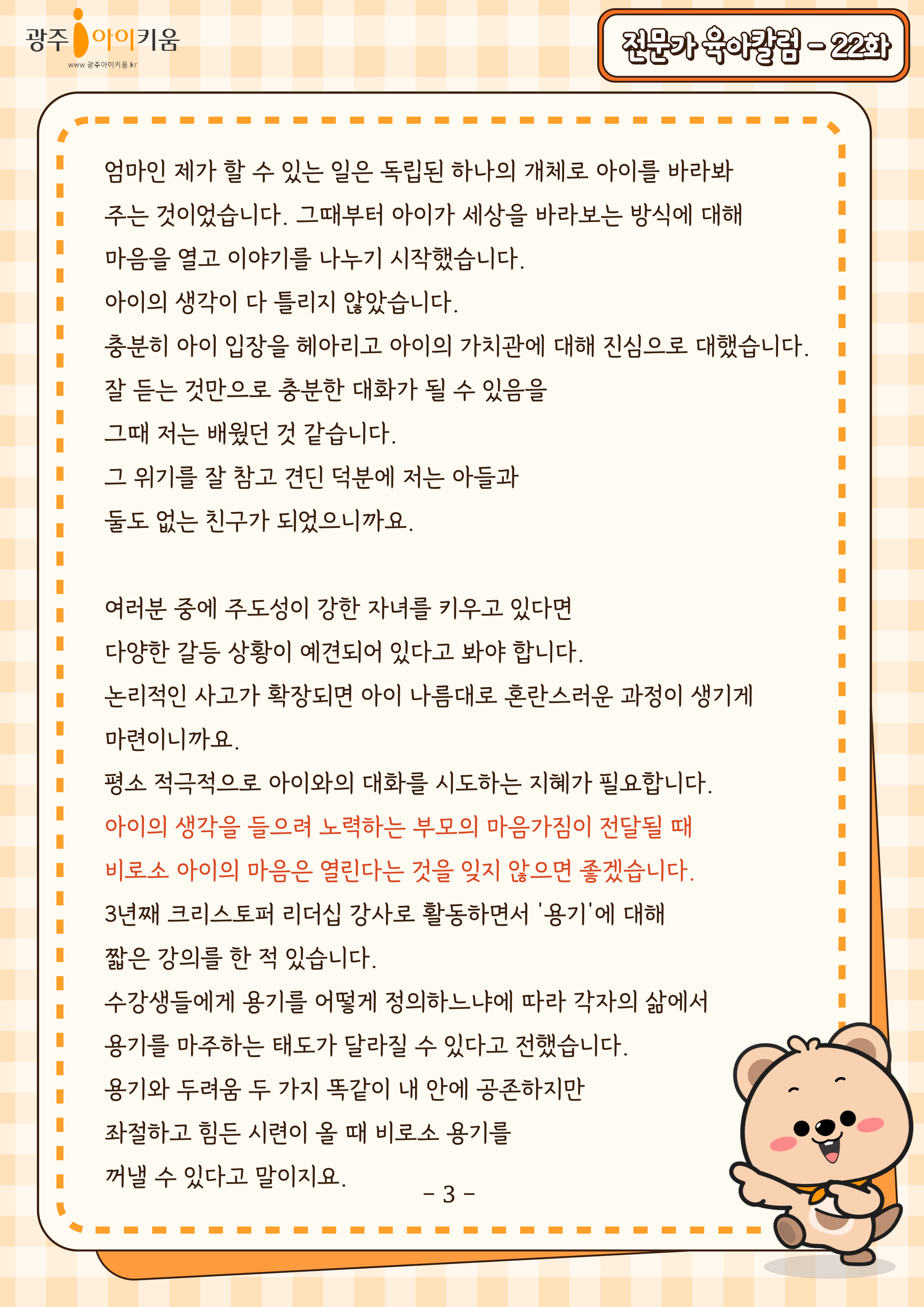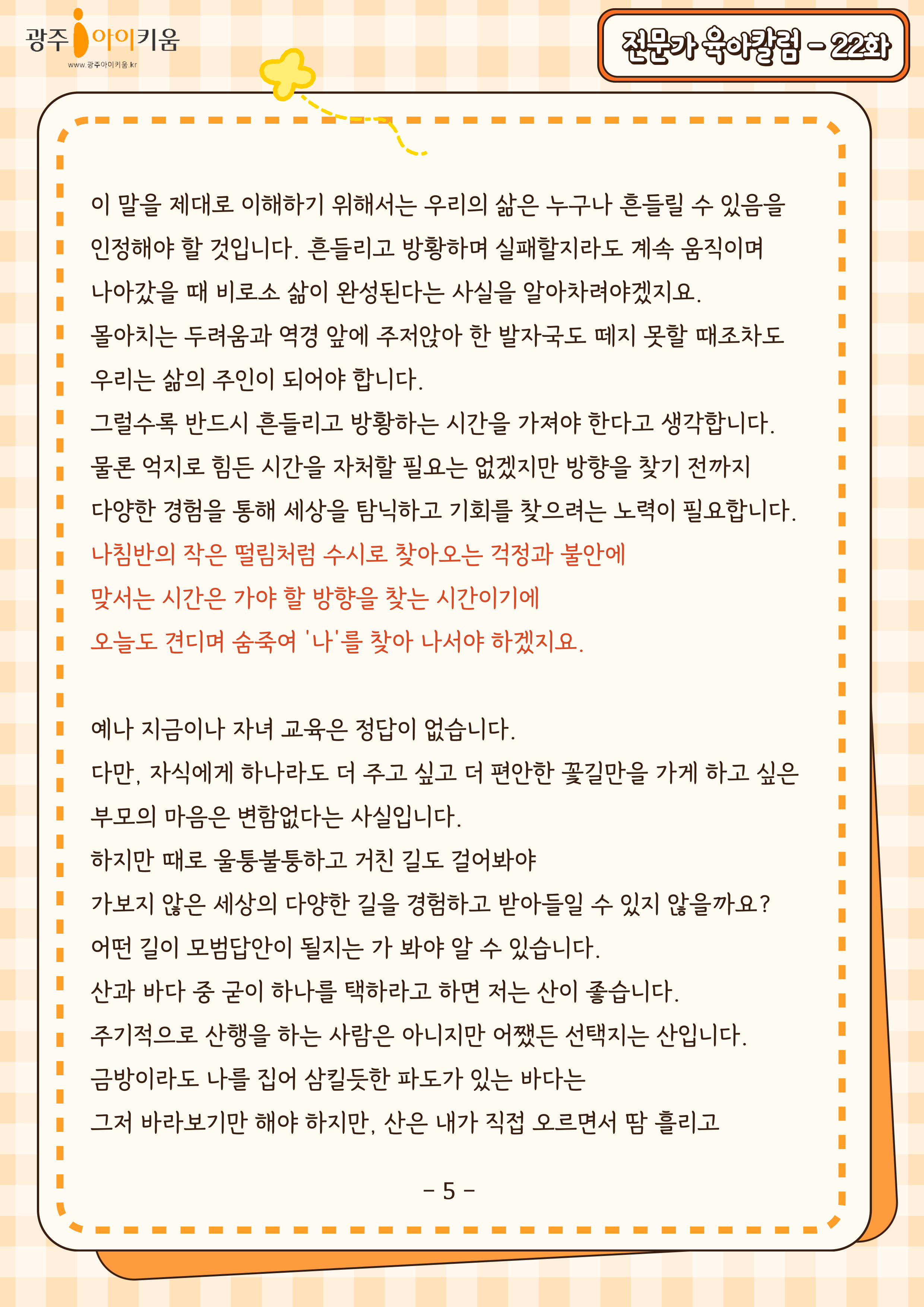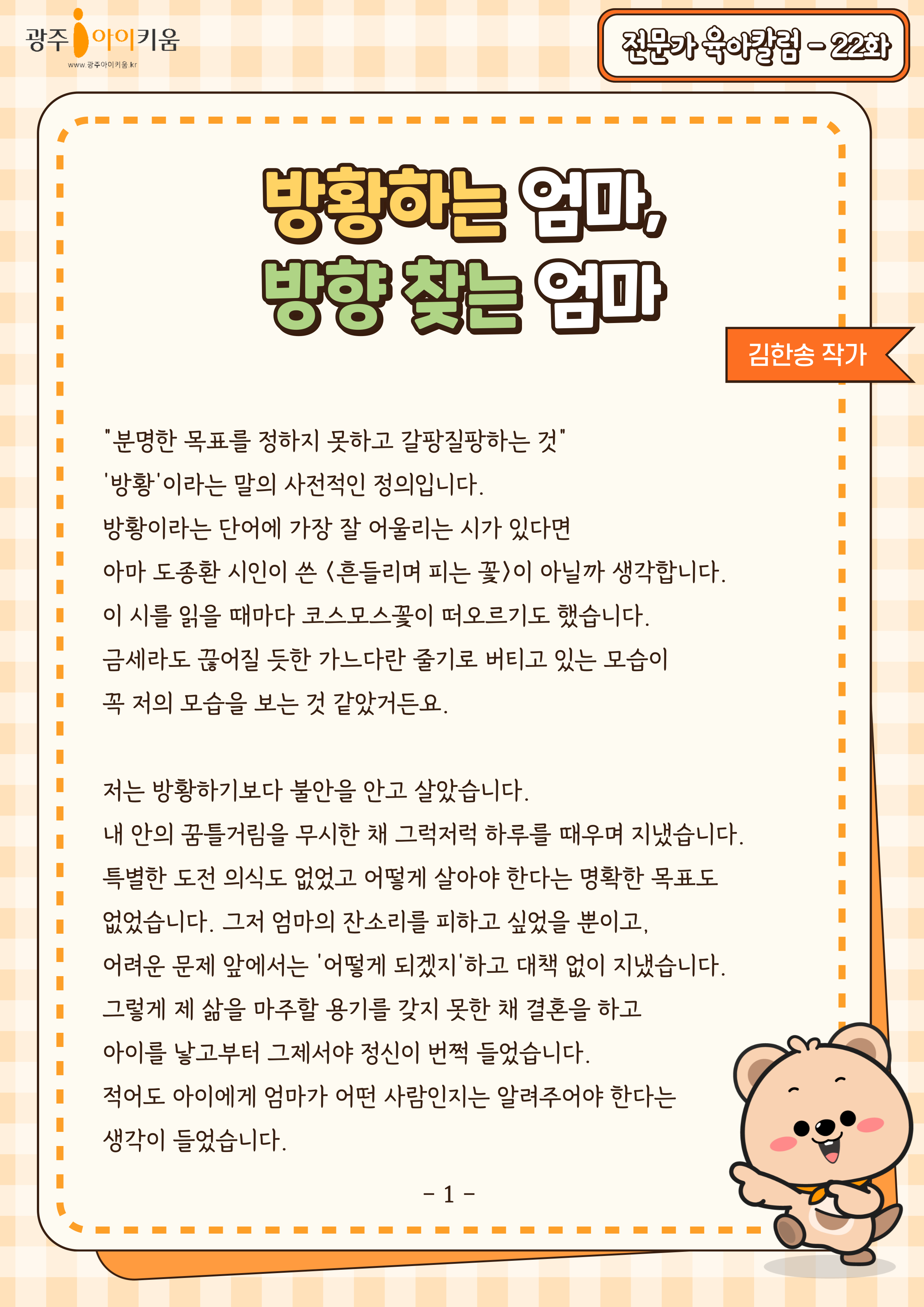 home 맘편한 내★일, 광주아이키움2.0 결혼·임신·출생 영유아 초·중·고 다양한 가족 일생활균형 커뮤니티 아동돌봄지원 소통방 나눔방 광주 아이키움 상담방 돌봄정보방 성폭력 피해 상담 및 사건지원 공지사항 이벤트소식 참여게시판 카드뉴스 동영상 아이키움 칼럼 성평등 육아웹툰 로고&캐릭터 22화-방황하는엄마, 방향찾는 엄마 등록일 : 2024-08-22 10:19 카테고리 : 카테고리 없음 작성자 : 운영자 조회수 : 637 목록