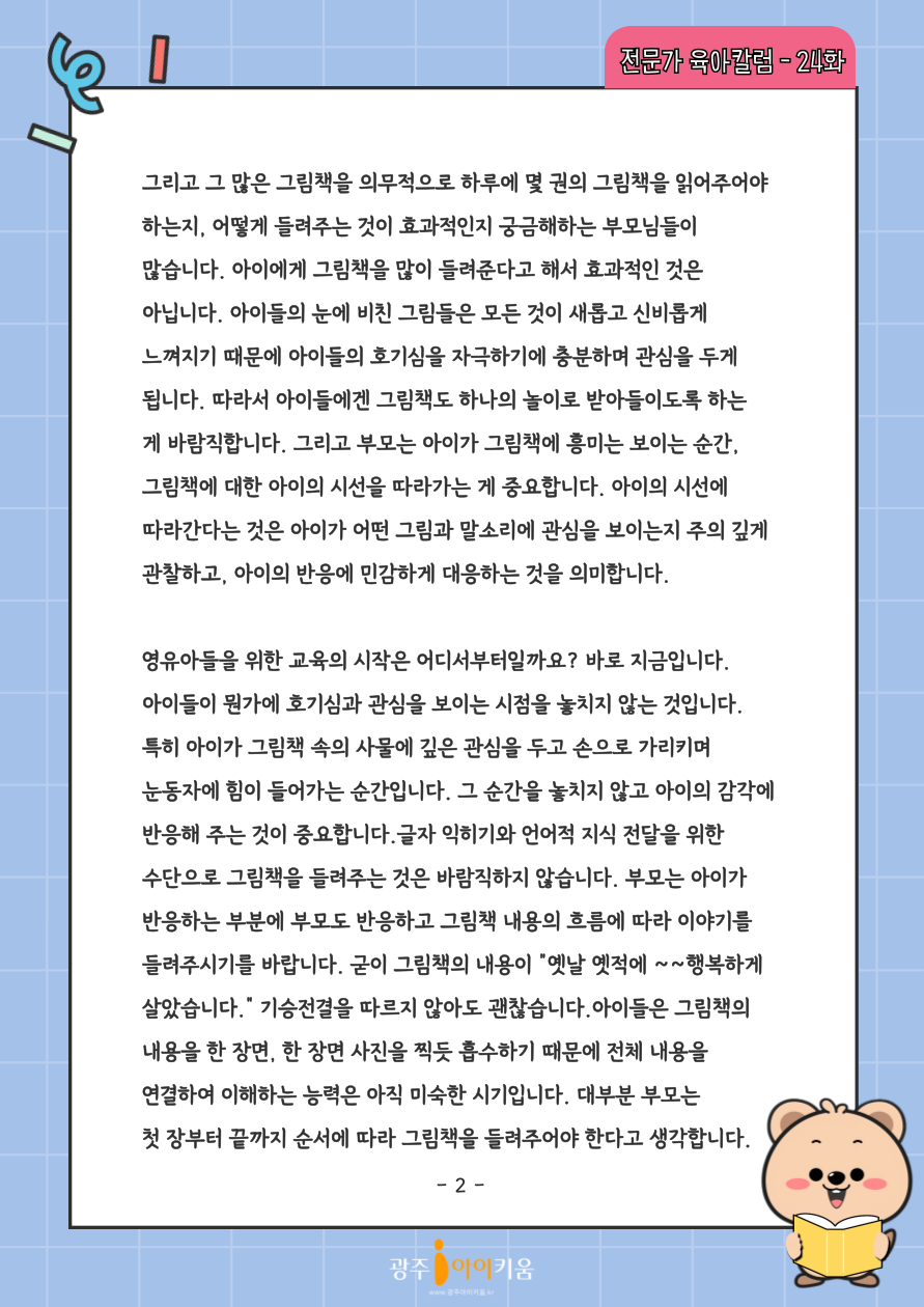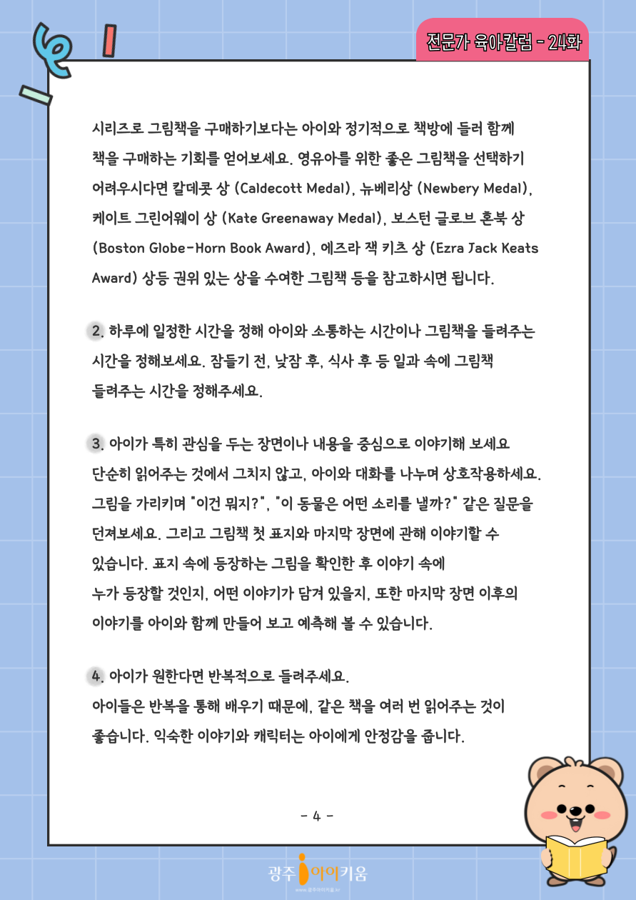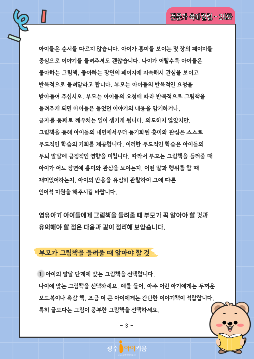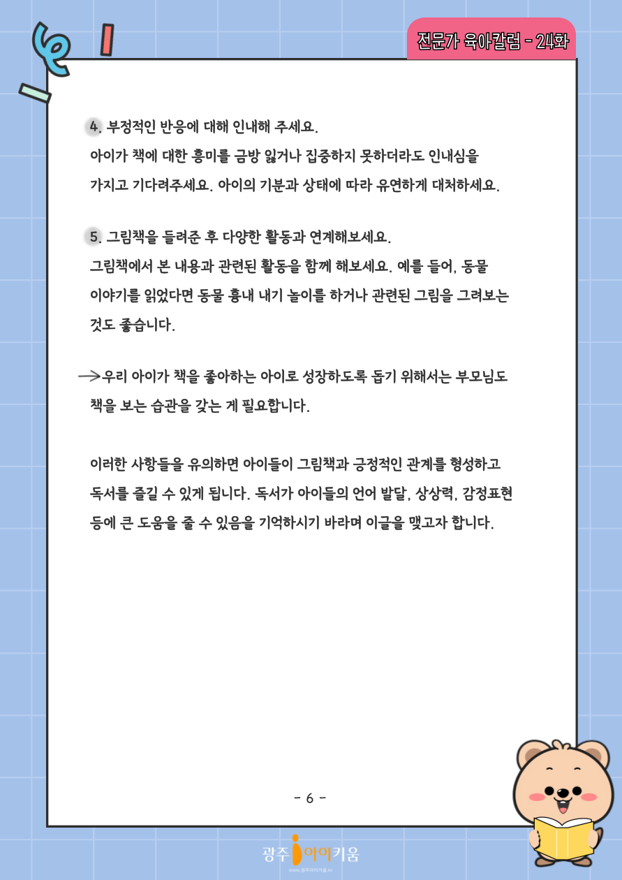 home 맘편한 내★일, 광주아이키움2.0 결혼·임신·출생 영유아 초·중·고 다양한 가족 일생활균형 커뮤니티 아동돌봄지원 소통방 나눔방 광주 아이키움 상담방 돌봄정보방 성폭력 피해 상담 및 사건지원 공지사항 이벤트소식 참여게시판 카드뉴스 동영상 아이키움 칼럼 성평등 육아웹툰 로고&캐릭터 24화-그림책을 싫어하는 아이는 없다. 등록일 : 2024-09-05 11:29 카테고리 : 카테고리 없음 작성자 : 운영자 조회수 : 629 목록